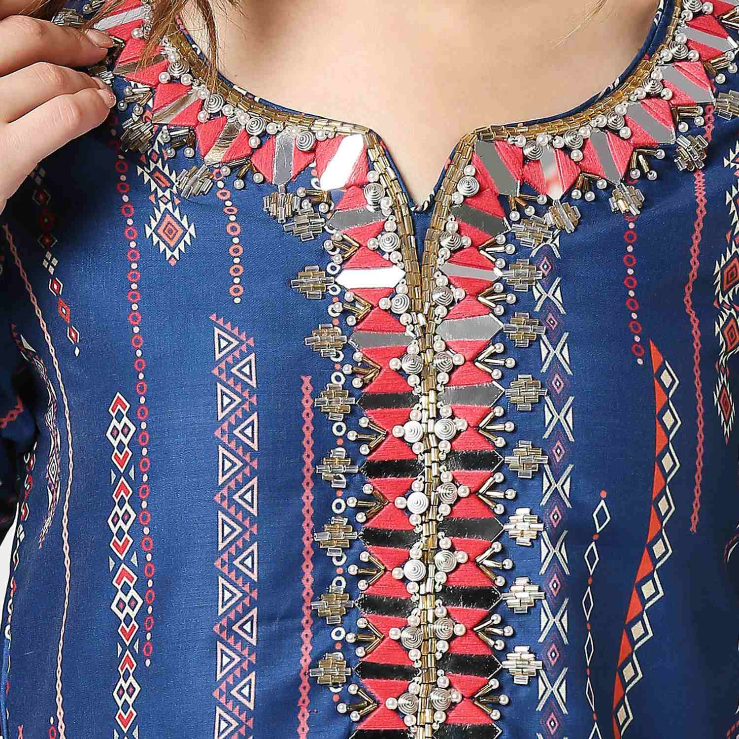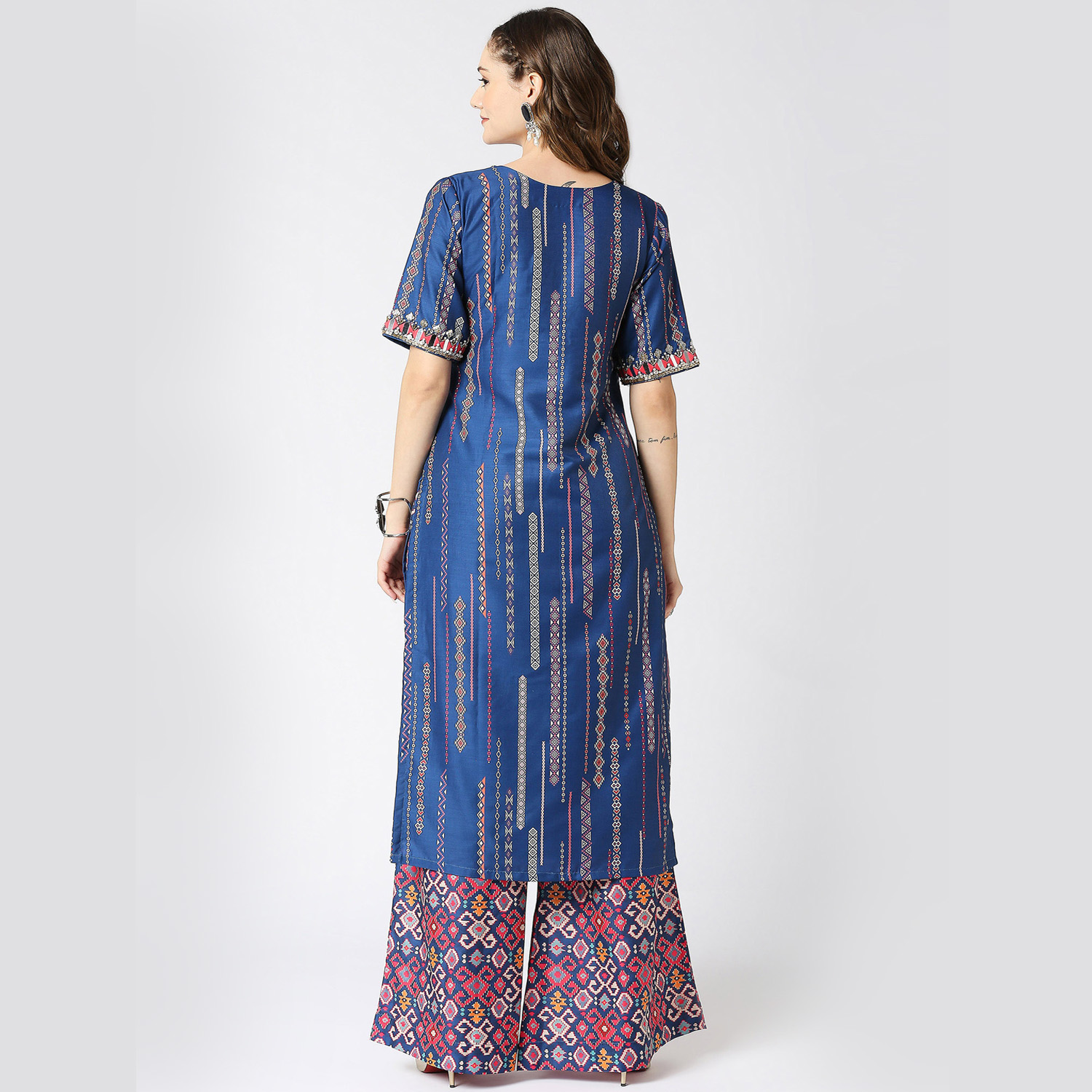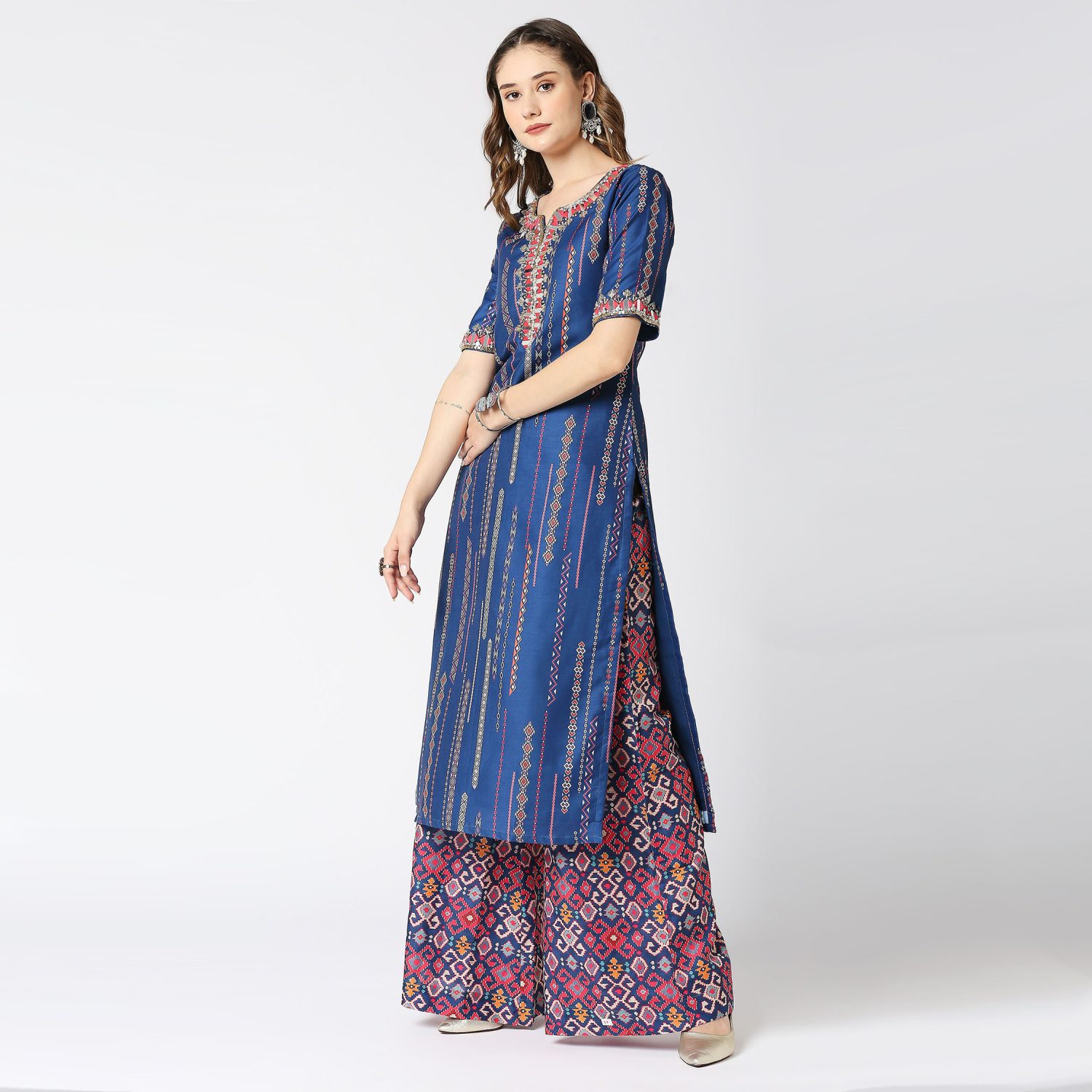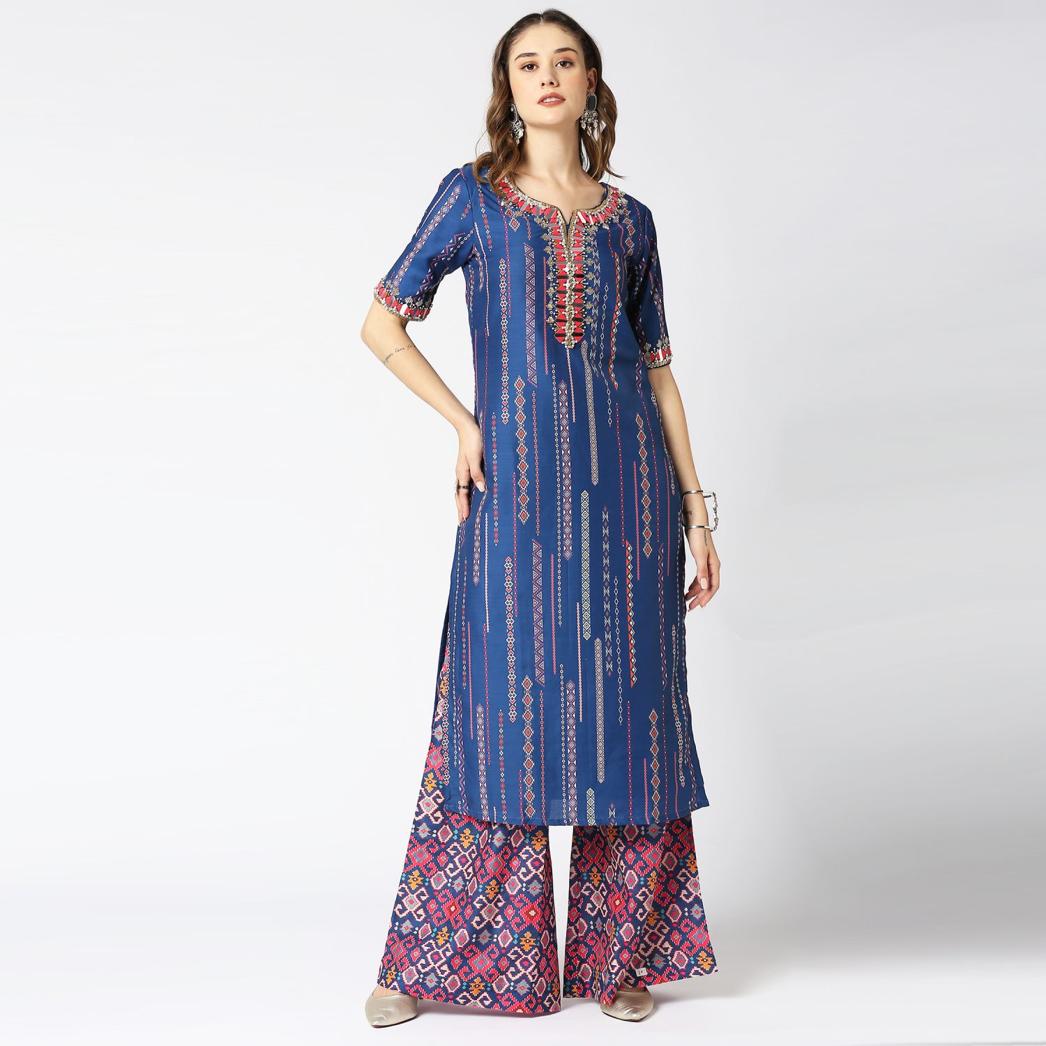 ₹ 14,500 (10% off)This cobalt blue kurta features mirror, resham, and cutdana embroidery along the neck and sleeves. Paired with printed muslin silk palazzo pants, it offers comfort and style. Pair this outfit with delicate jewellery and a clutch for day or evening events.