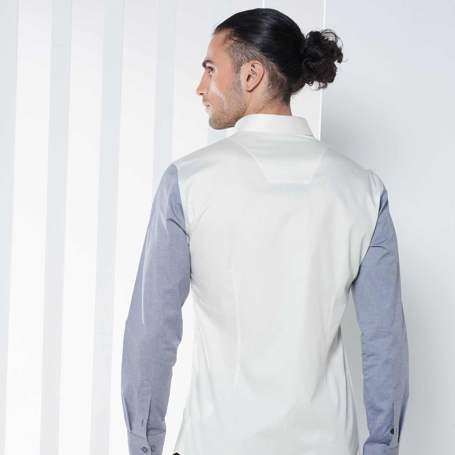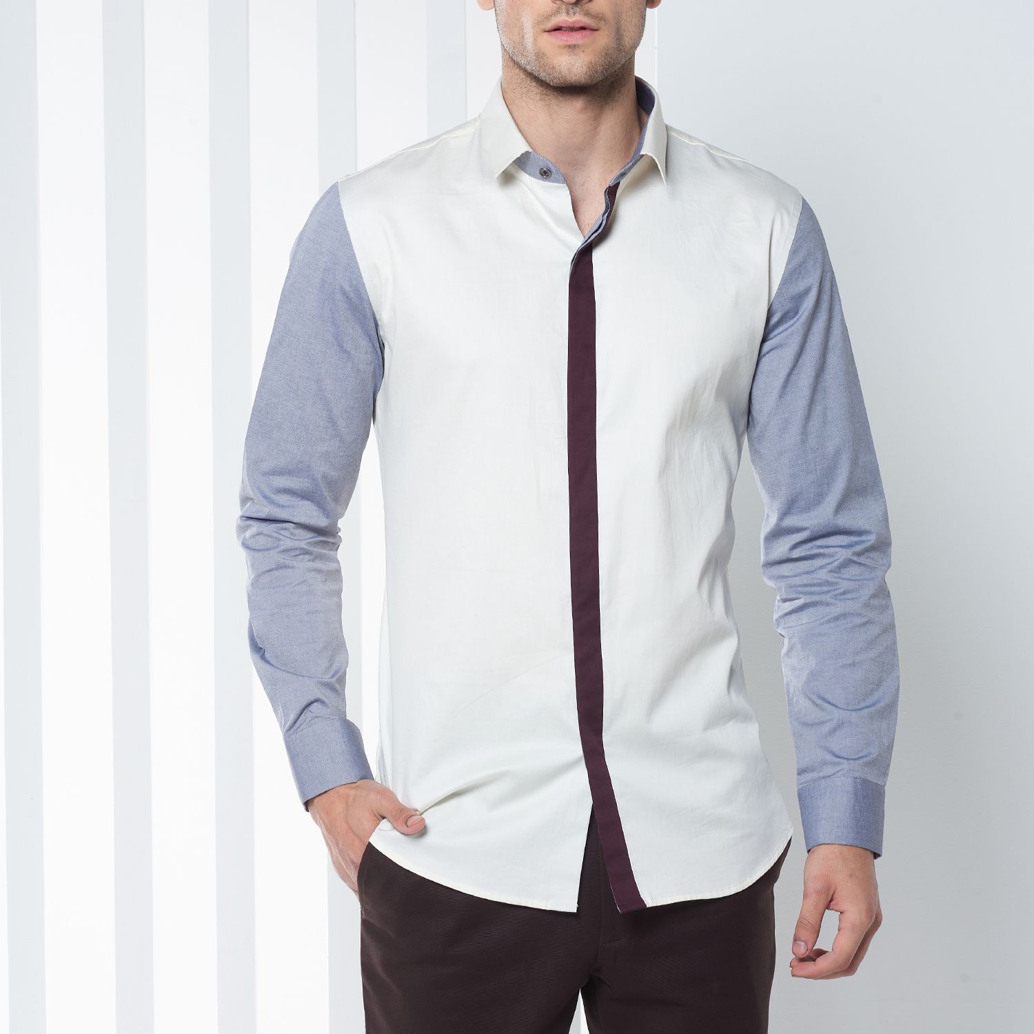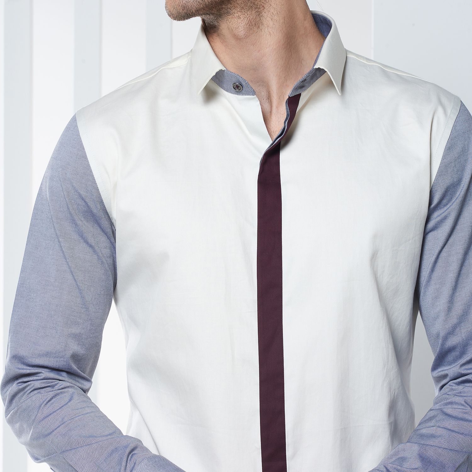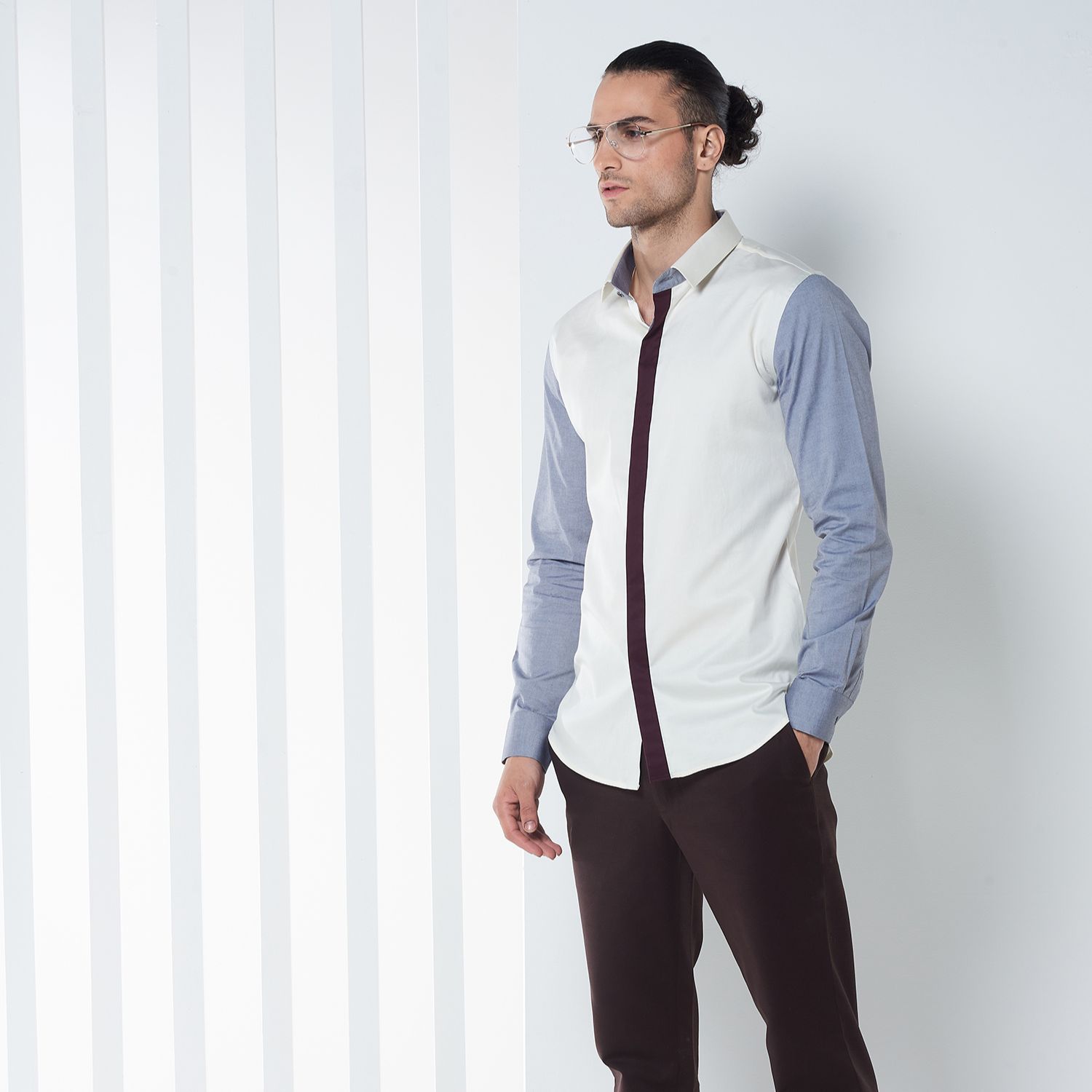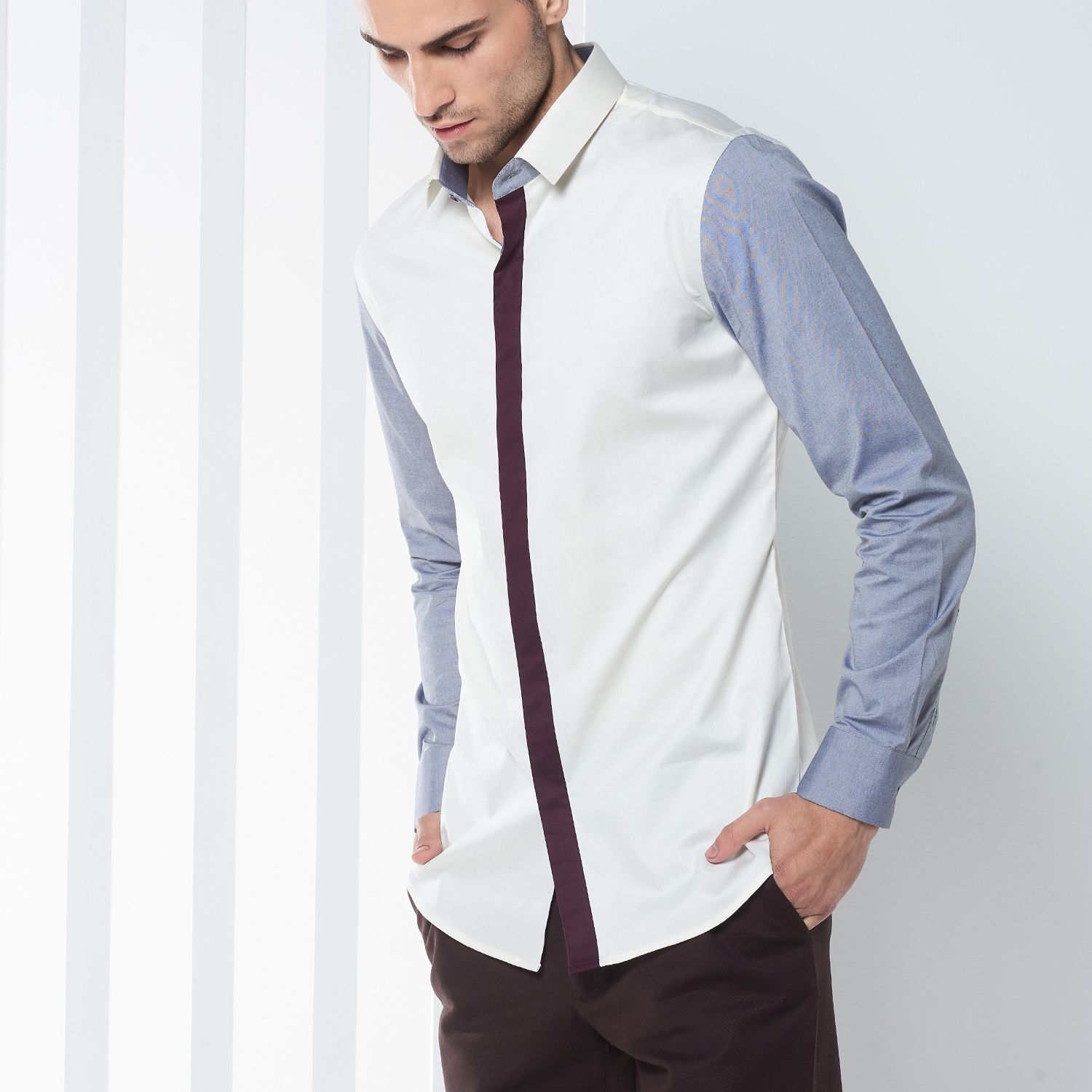 This stylish cotton sateen shirt features understated color blocked details. The classic silhouette paired with hints of color make this a striking yet versatile piece. Style this shirt with denim jeans or neutral trousers for a dressy daytime event.