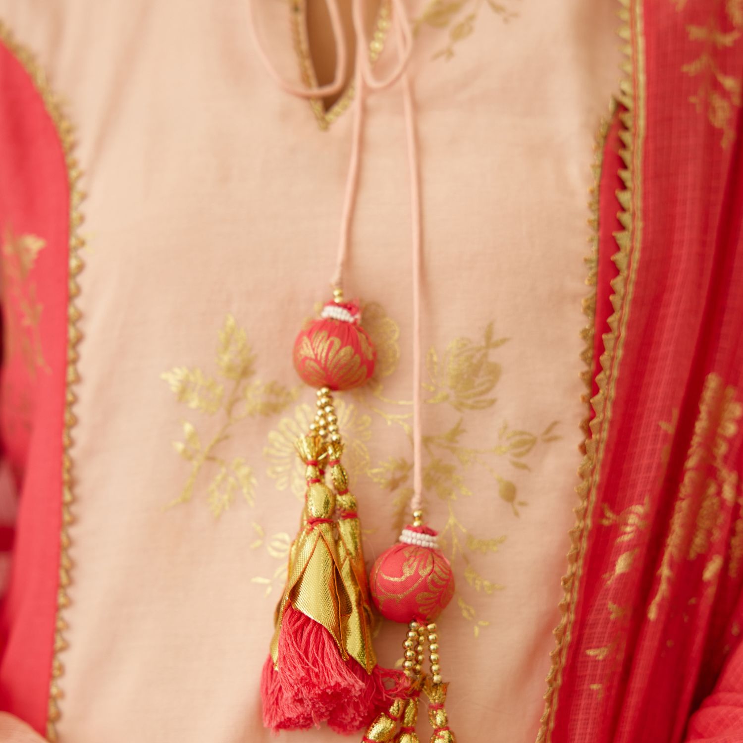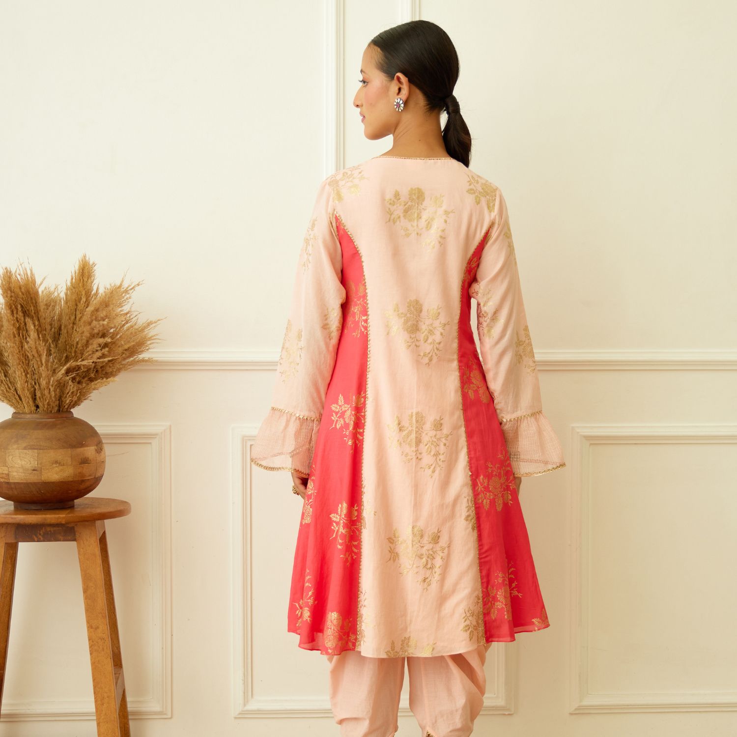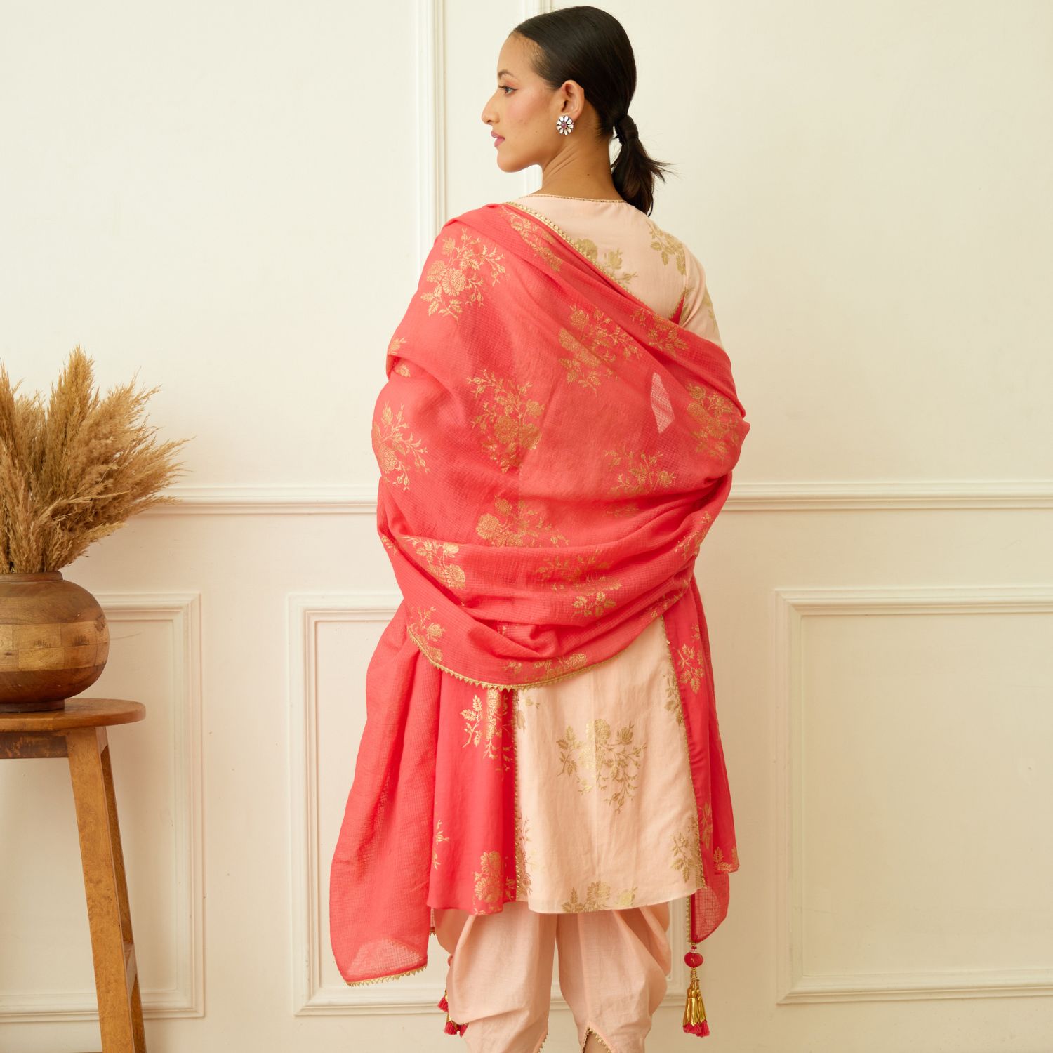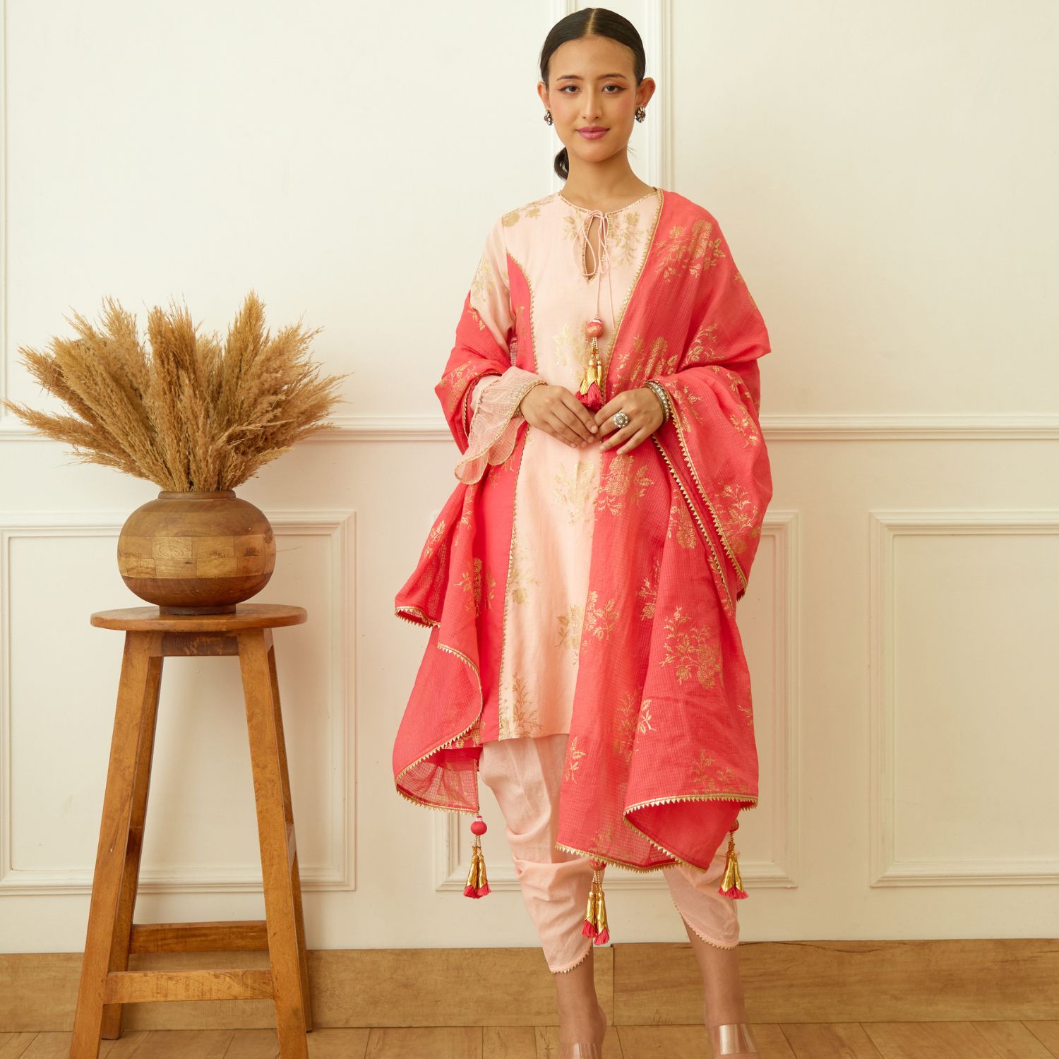 Exude captivating charm in this peach foil cotton silk kurta with coral side gota detail. Paired gracefully with a cotton tulip dhoti and coral foil handwoven kota doriya dupatta, this ensemble epitomizes modern sophistication. Make a striking statement at any occasion with this mesmerizing fusion of tradition and contemporary flair.