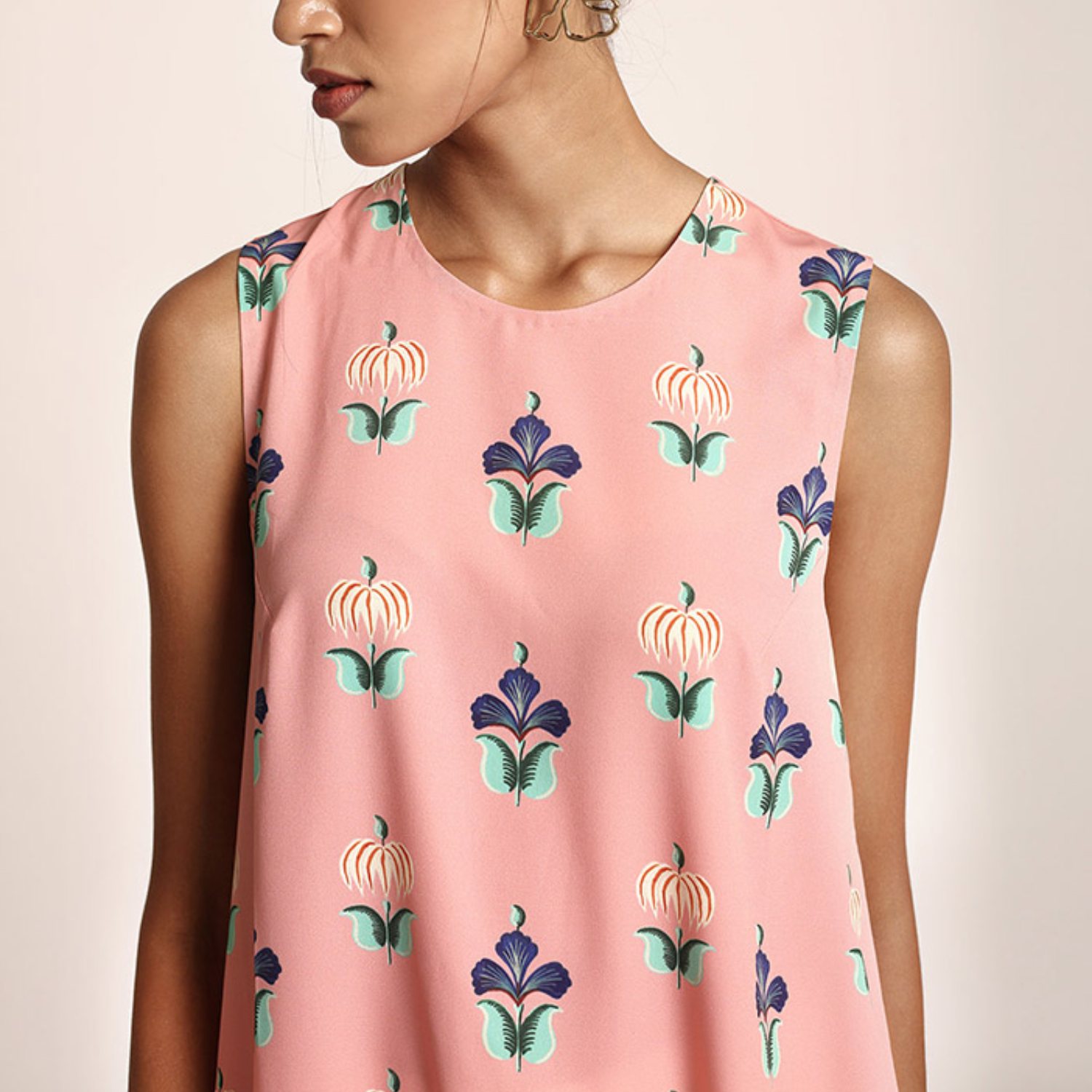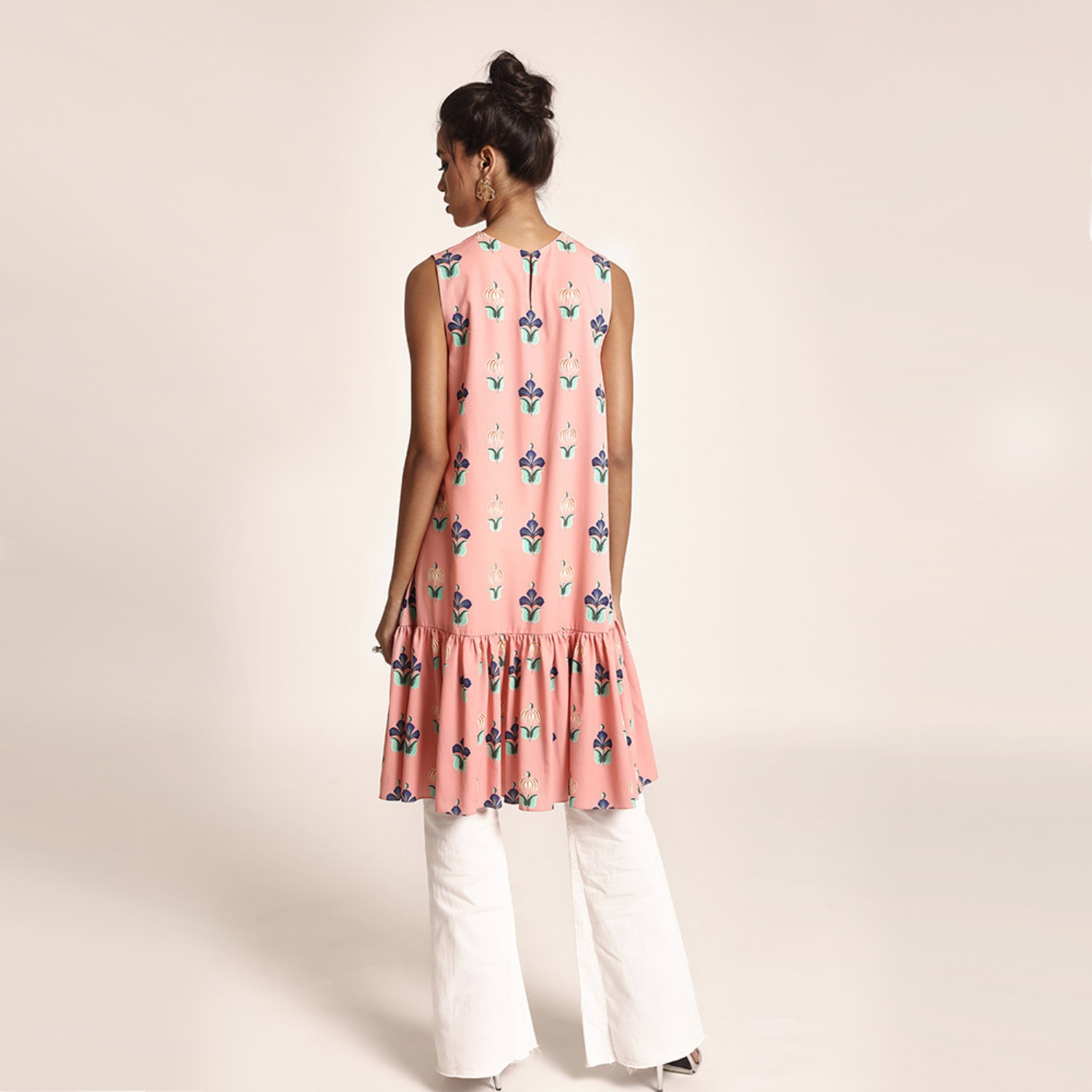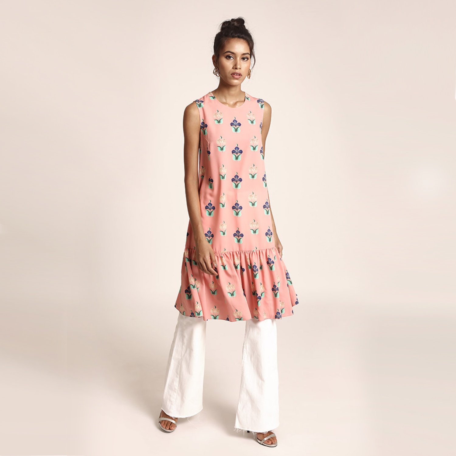 This beautiful tunic features a blue print on a coral base. It's crafted from high-quality art crepe fabric and has a sleeveless design with a frill hem, adding playfulness and femininity to the outfit. Pair it with bold earrings and heels for a dressy day soiree.