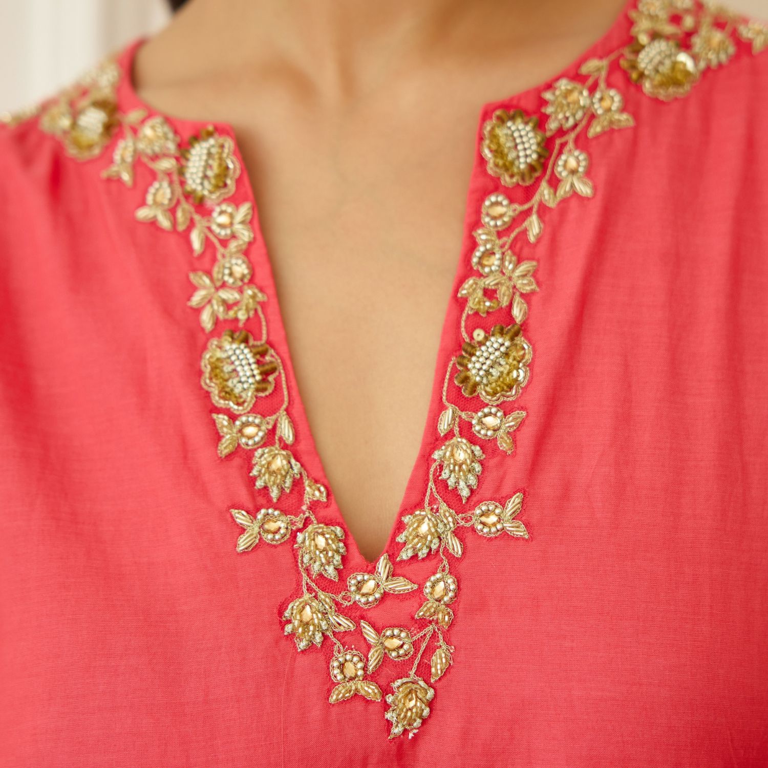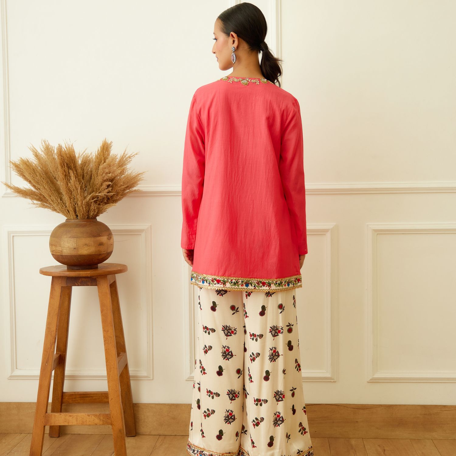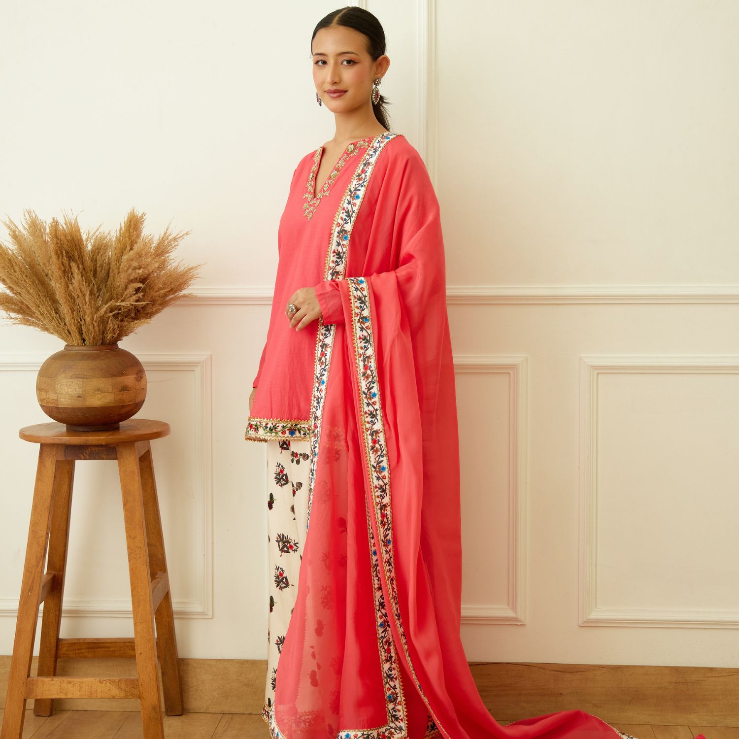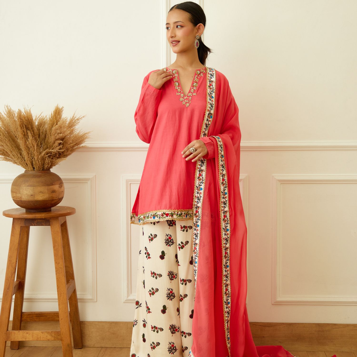Embrace elegance with this coral cotton silk kurta, adorned with dabka & sequins zardosi embroidery around the neckline. Paired flawlessly with an ivory kohinoor buta print crepe sharara & coral pure silk organza dupatta, this ensemble exudes sophistication and grace. Make a statement of timeless charm at any occasion.