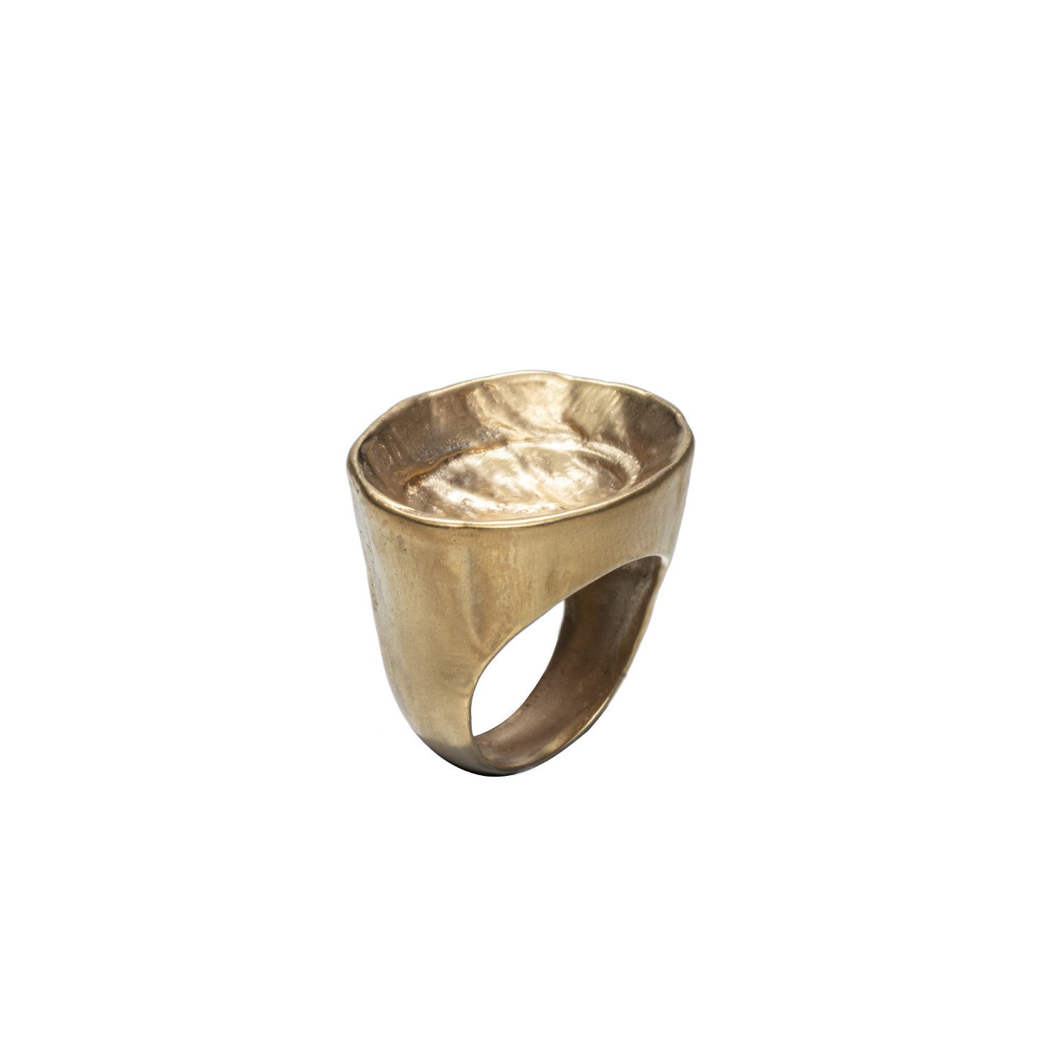 This gold ring is a bold piece crafted from brass. The crater shot ring is designed to make a statement with its unique design.