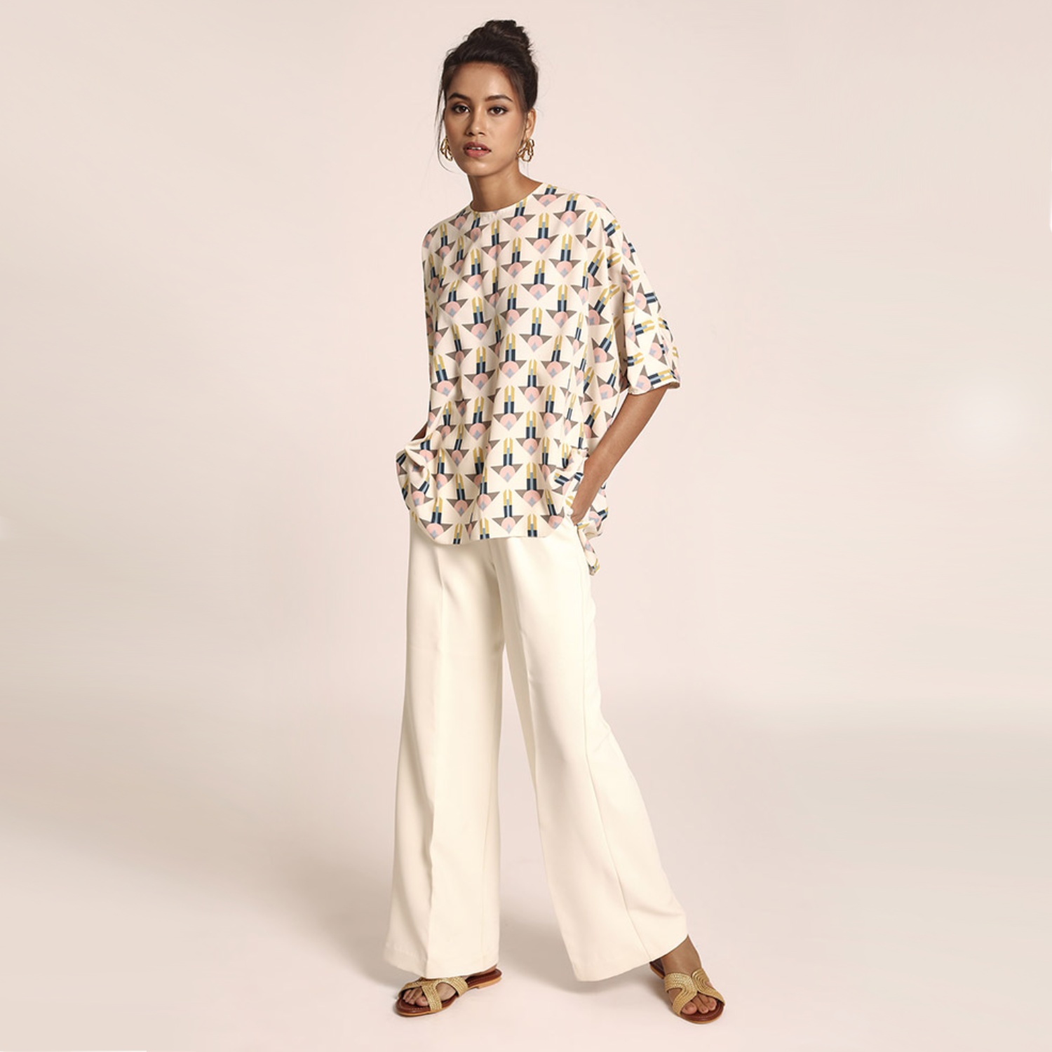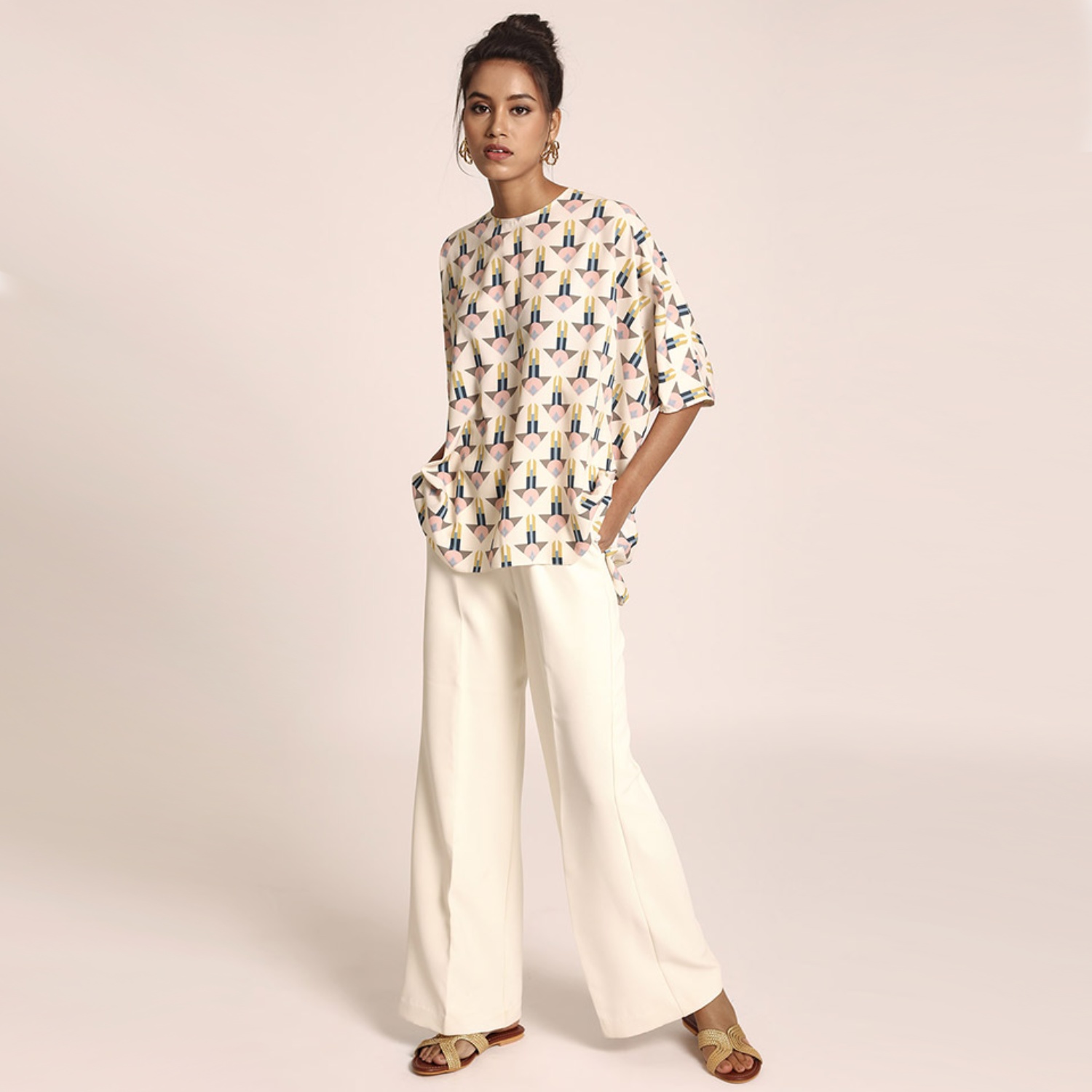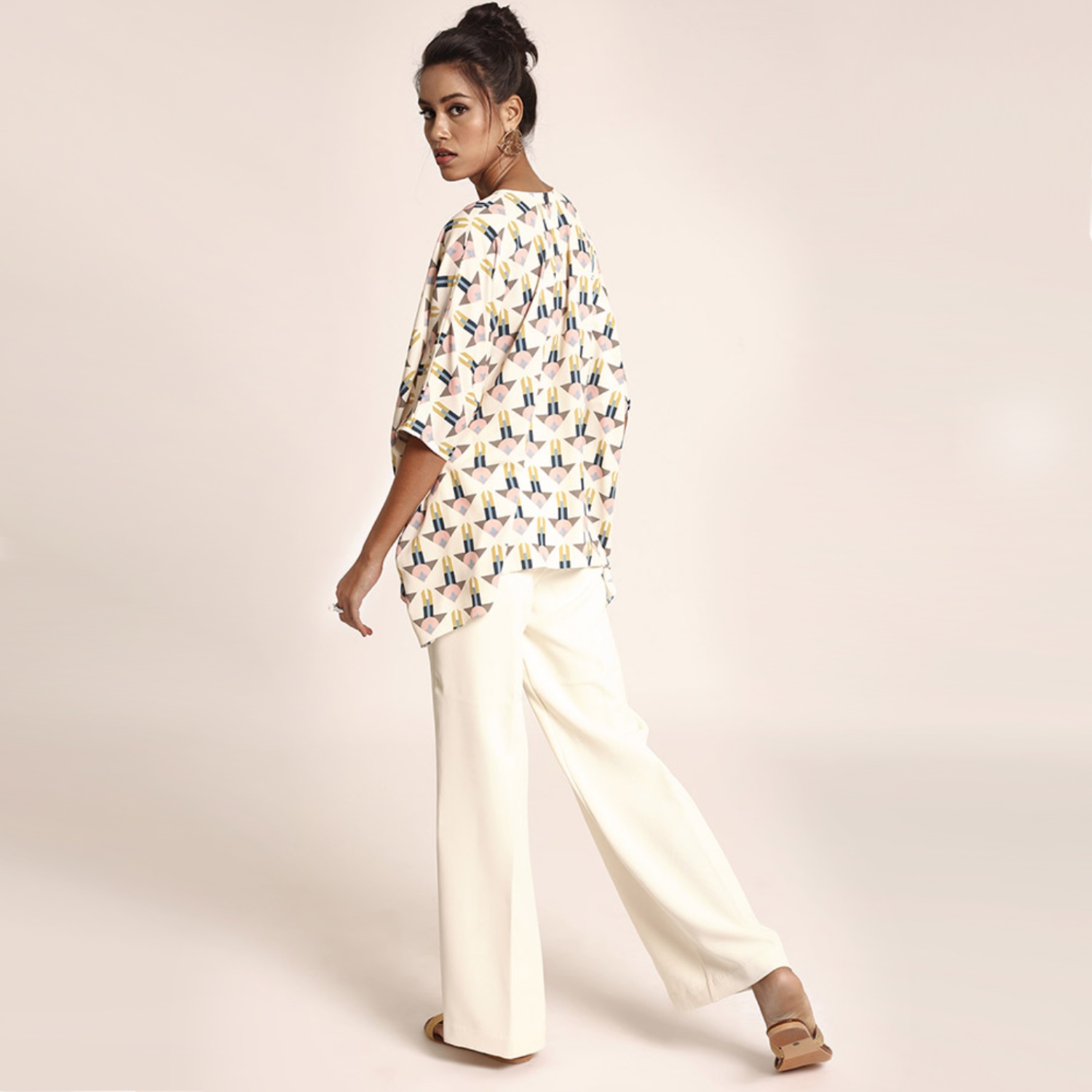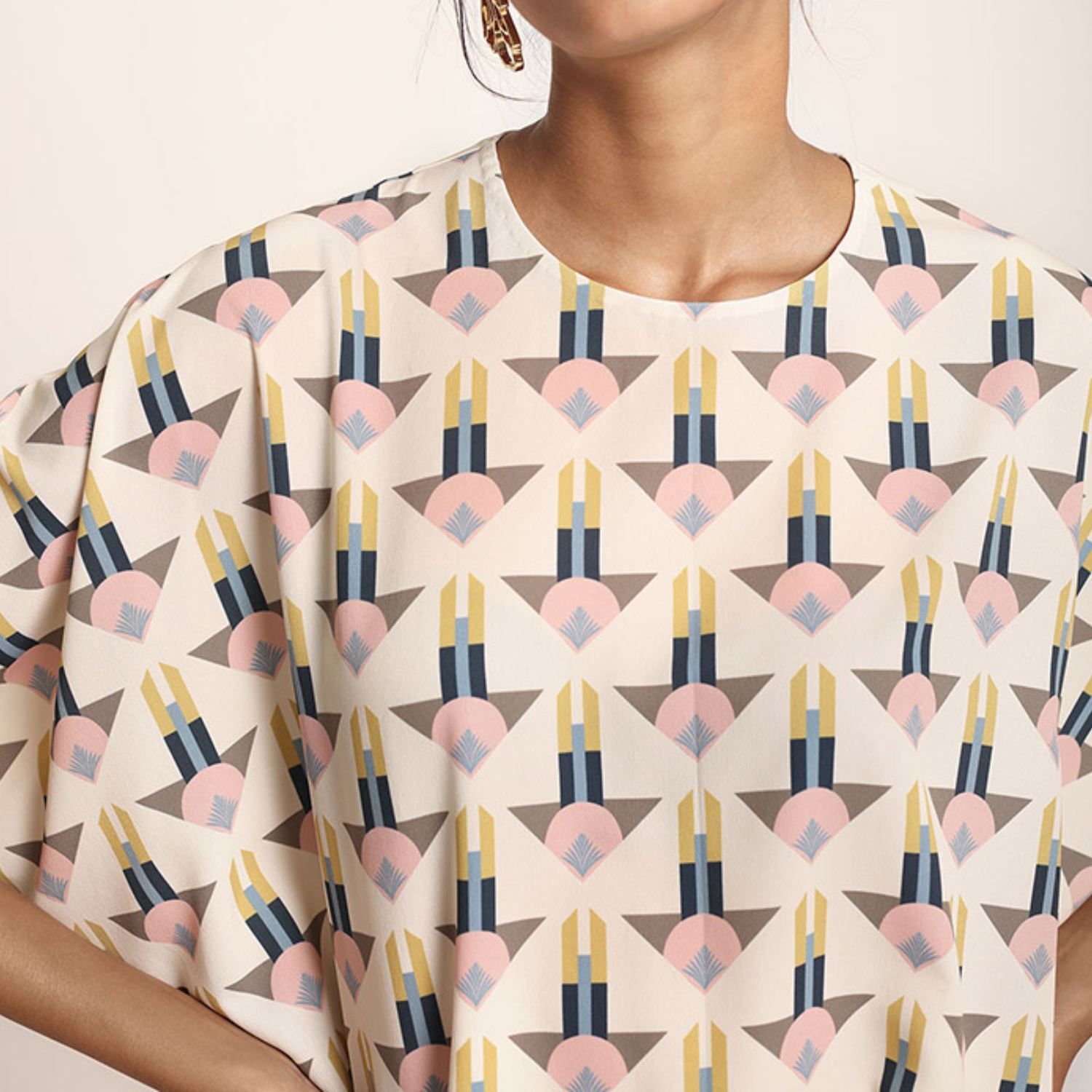 This beautiful tunic features an arrow print on a cream base. It's crafted from high-quality art crepe fabric and designed in a short kaftan style, making it a stylish and versatile choice for different occasions. Style it with statement earrings and heels for a dressy day event.
