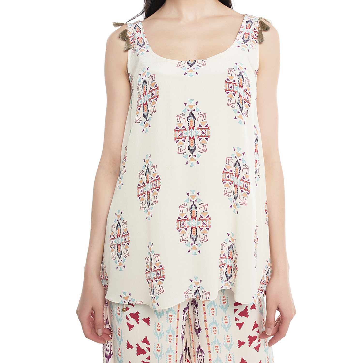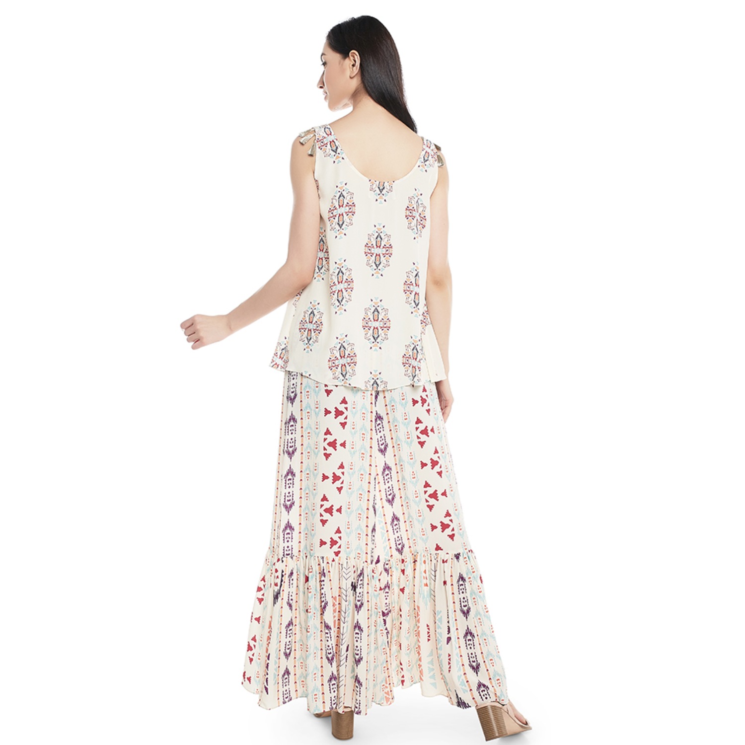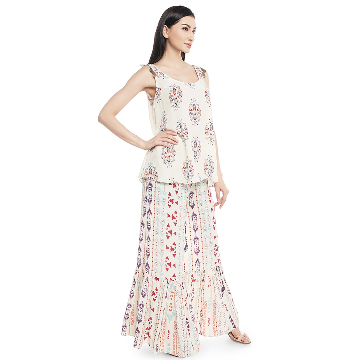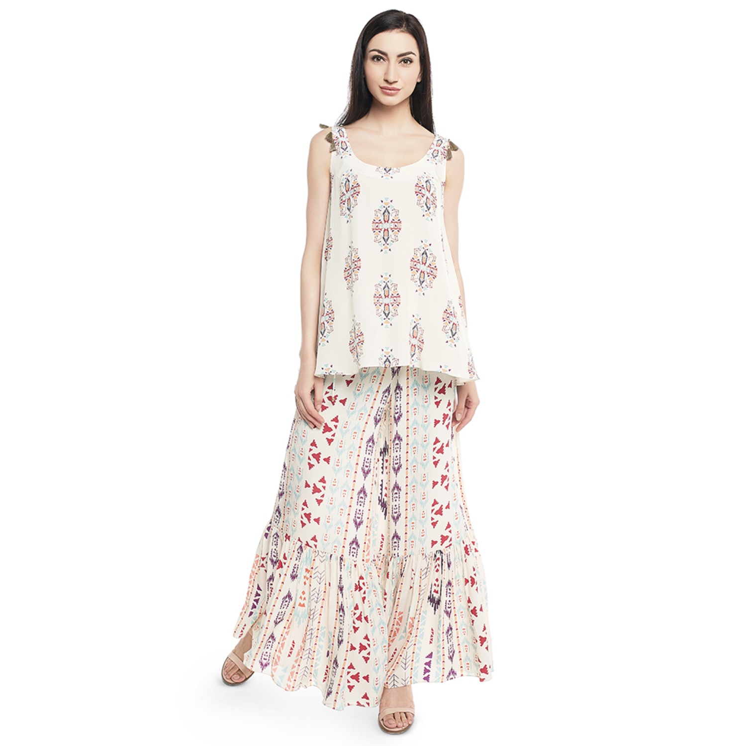 Effortlessly chic, a cream printed crepe kurta paired with a frill palazzo creates a stylish ensemble. The intricate print adds a touch of sophistication, while the frill detailing adds a playful flair. This outfit strikes a perfect balance between contemporary design and comfort, making it an ideal choice for fashionable and trendy occasions.
