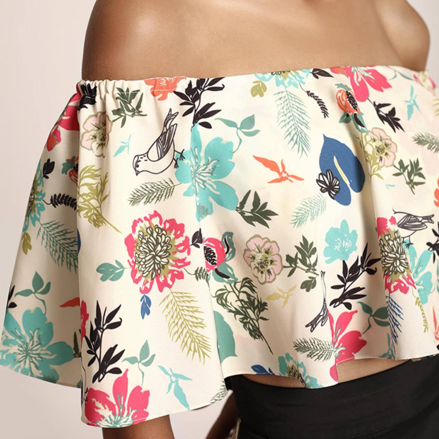 This gorgeous set features a contrasting print on a cream art crepe fabric. The set includes a ruffle off-shoulder top and black low crotch pants with tassels on the side seam for a stylish and comfortable look. Style it with statement earrings and heels for an evening event.