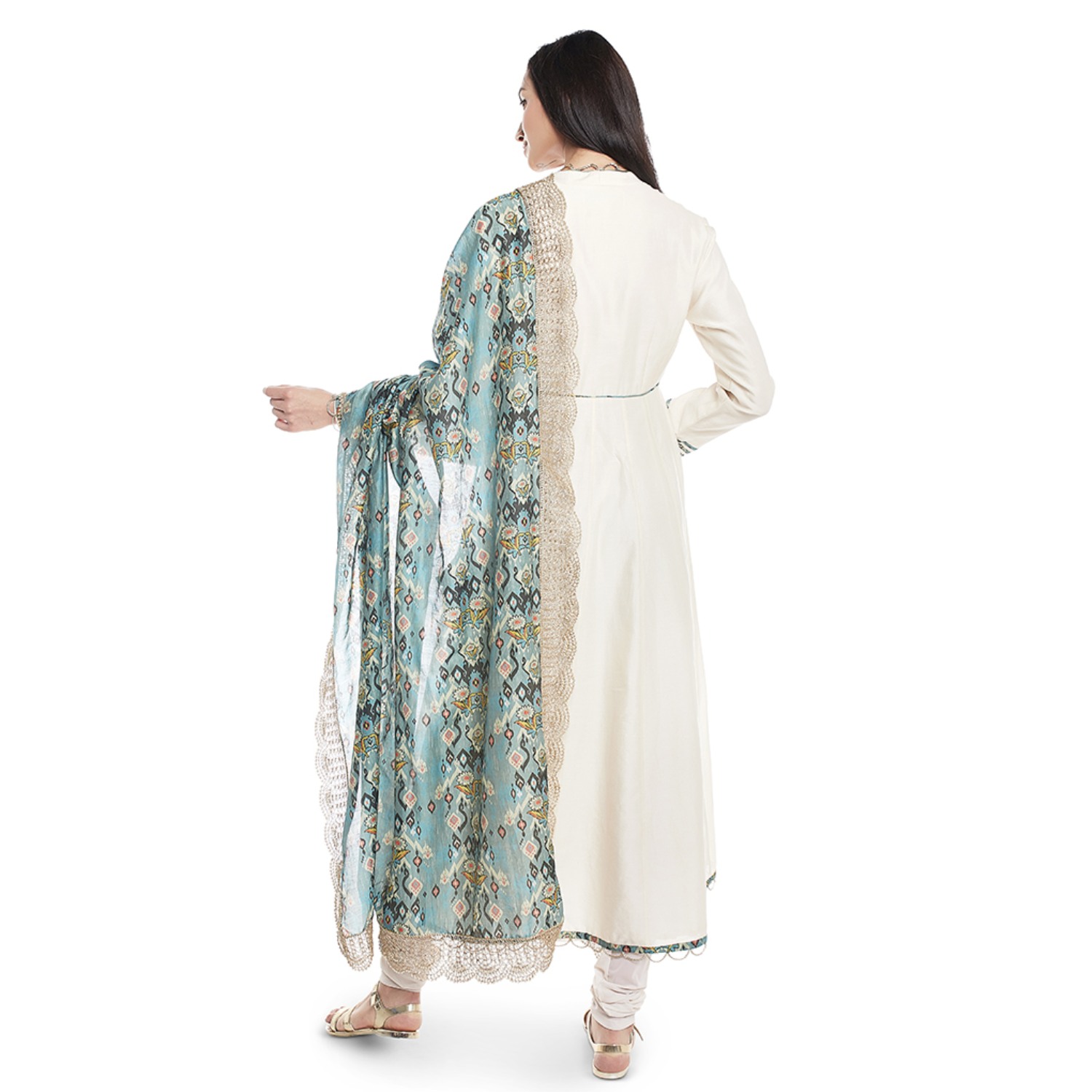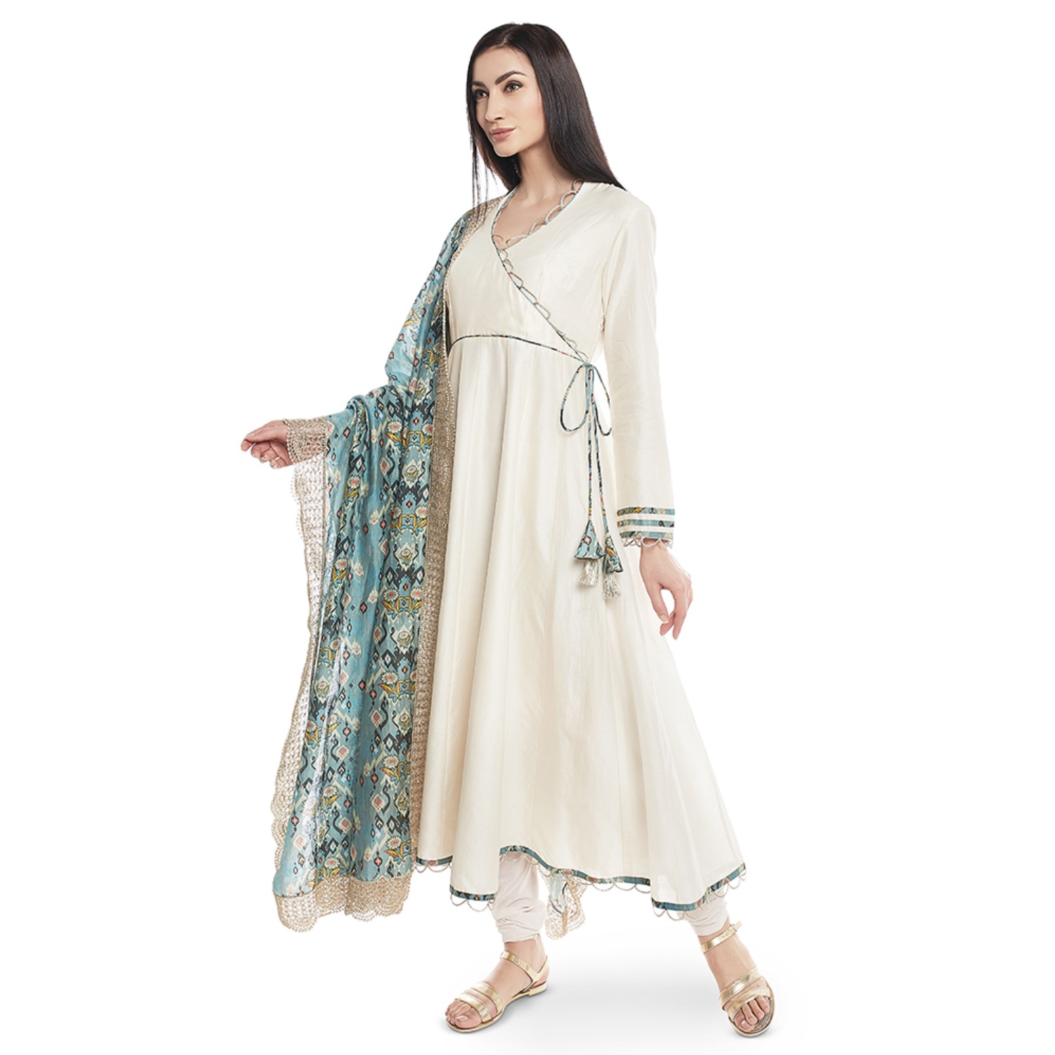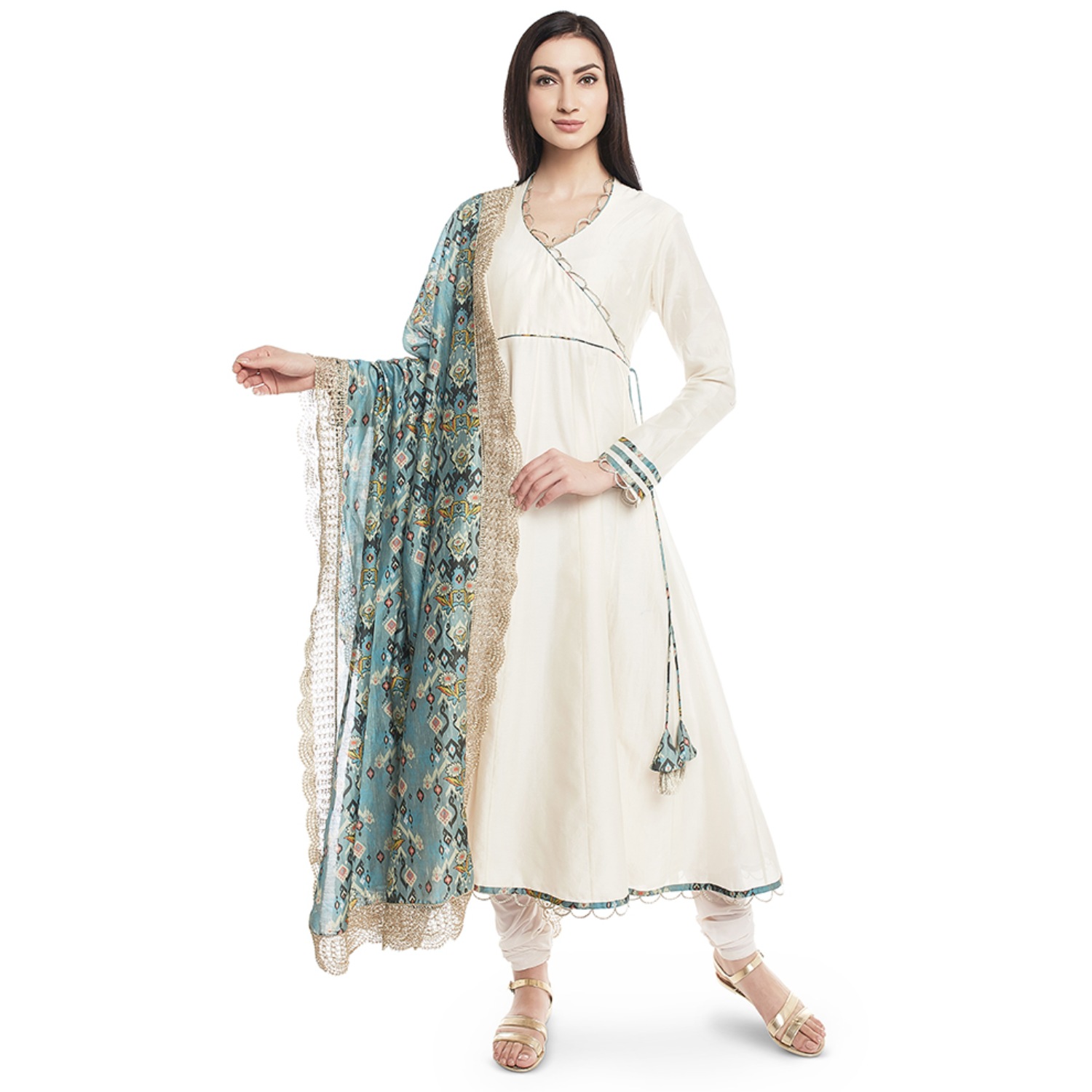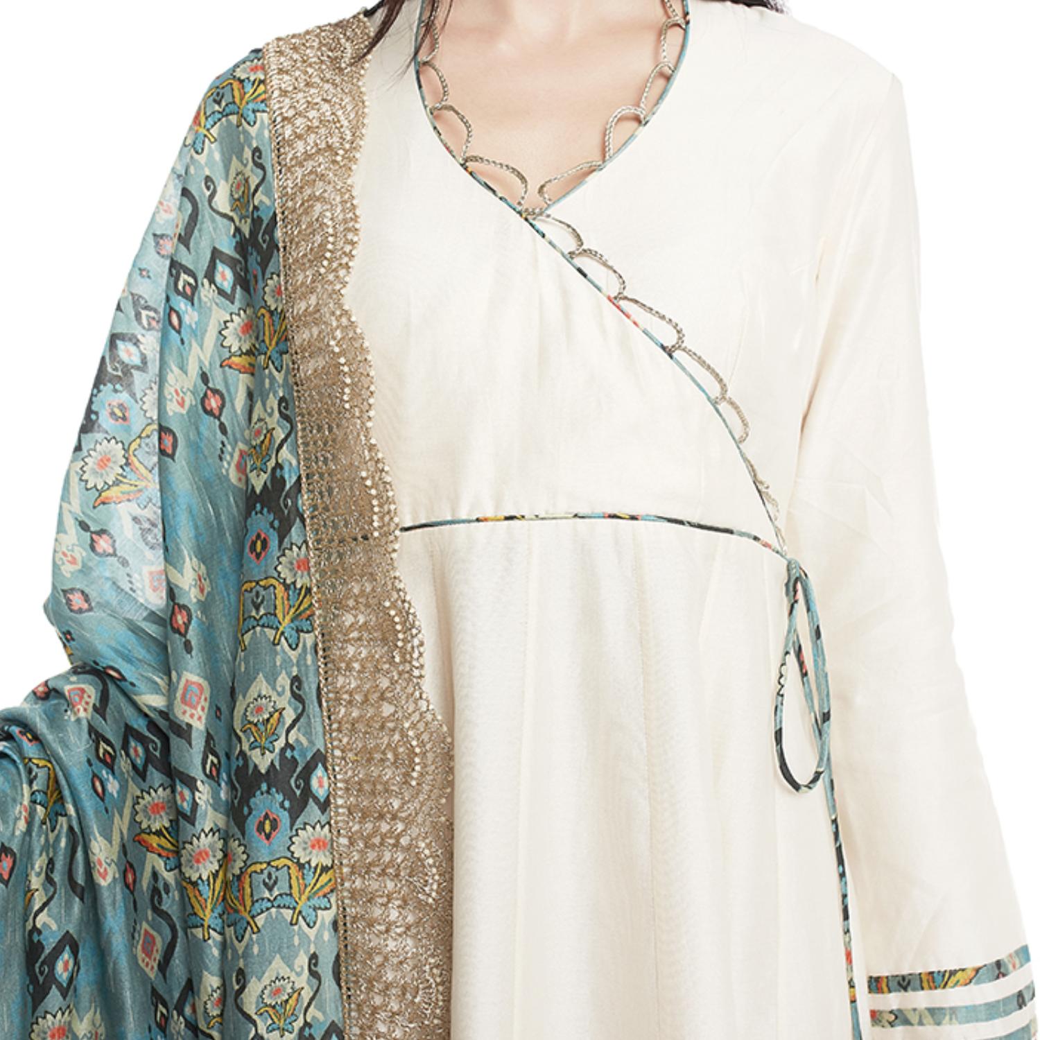 This stunning set comes in a soft cream shade. The anarkali has an elegant overlap design with full sleeves and a v-neck, creating a classic and graceful look. The anarkali is made of silkmul, providing a soft and comfortable feel. The set includes a soft net churidar, which complements the anarkali with its delicate and airy texture. It has a blue love print silkmul dupatta, which adds pattern and contrast to the outfit.