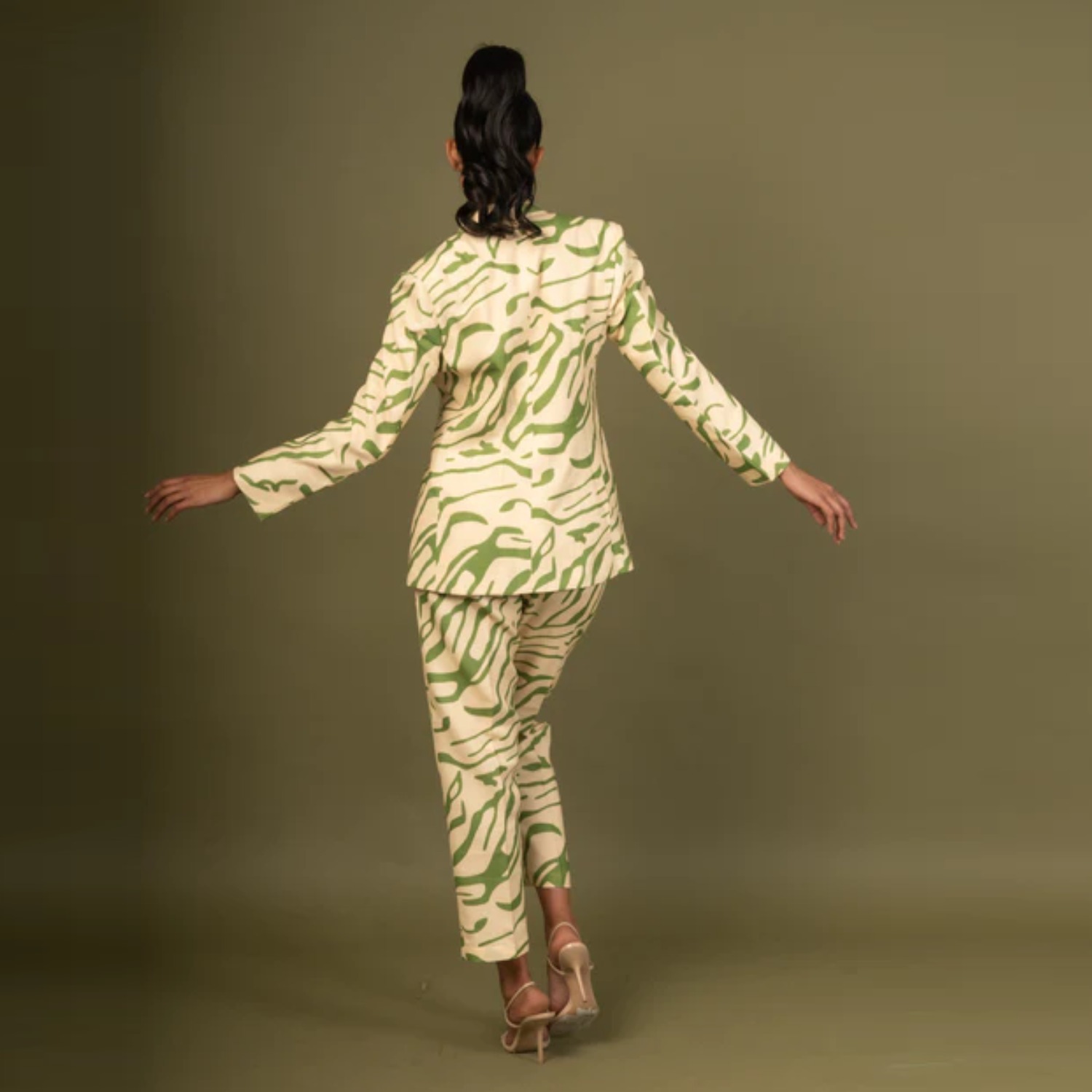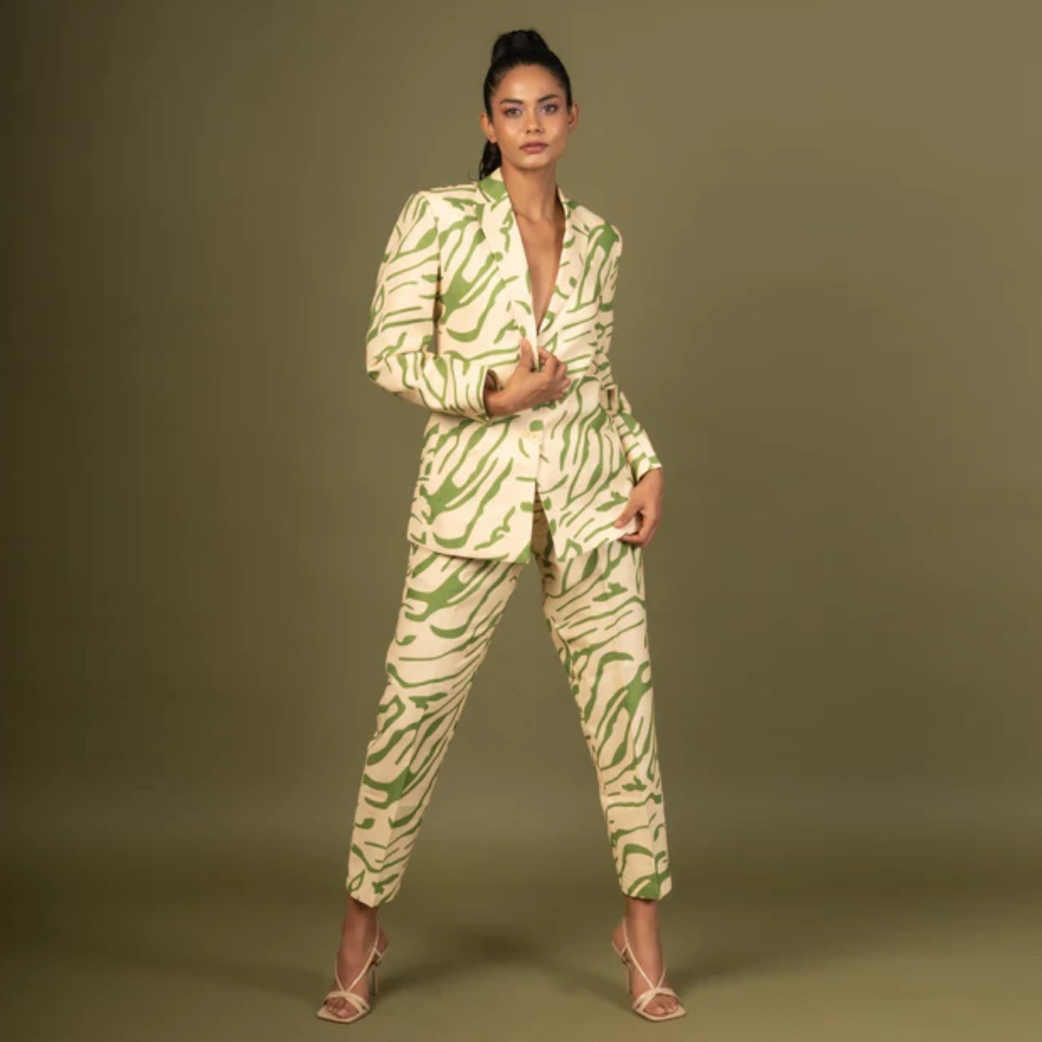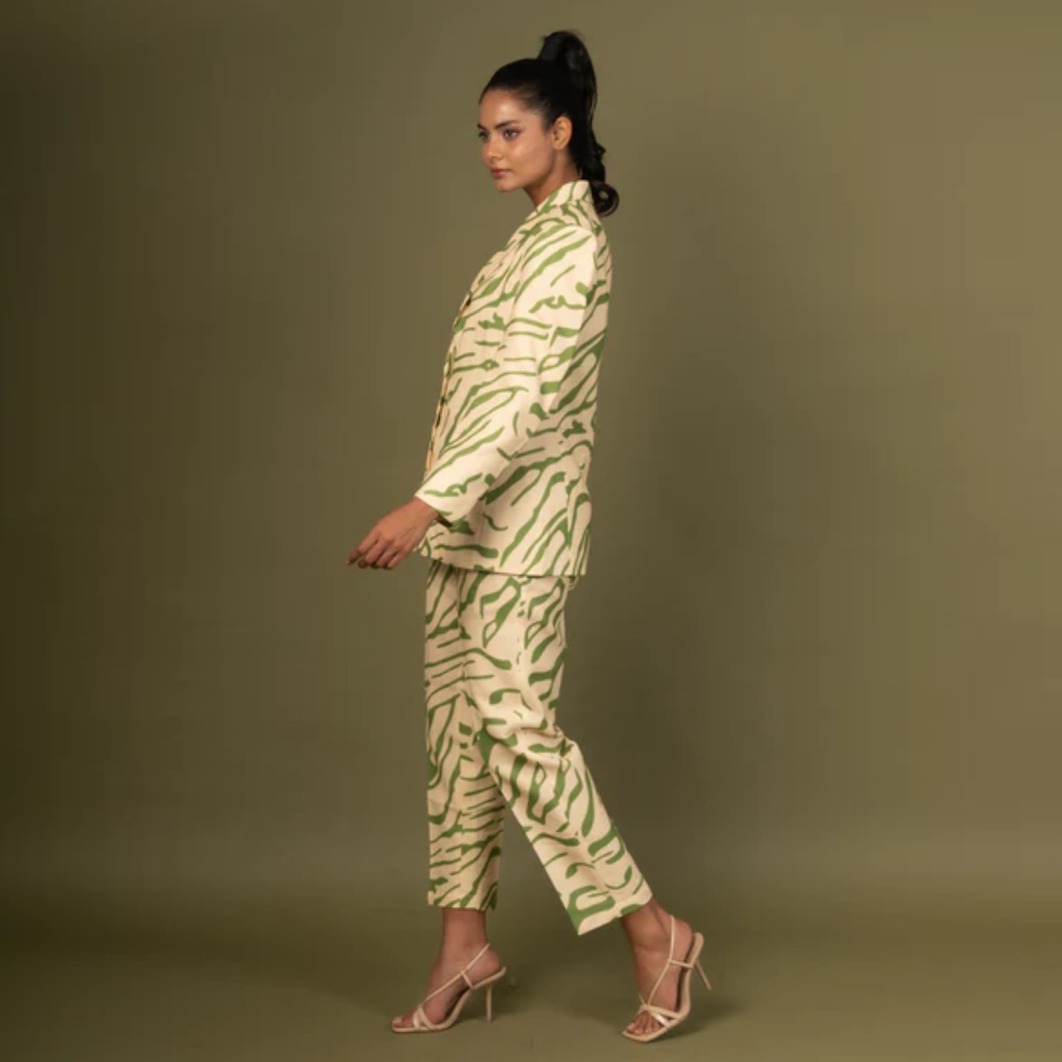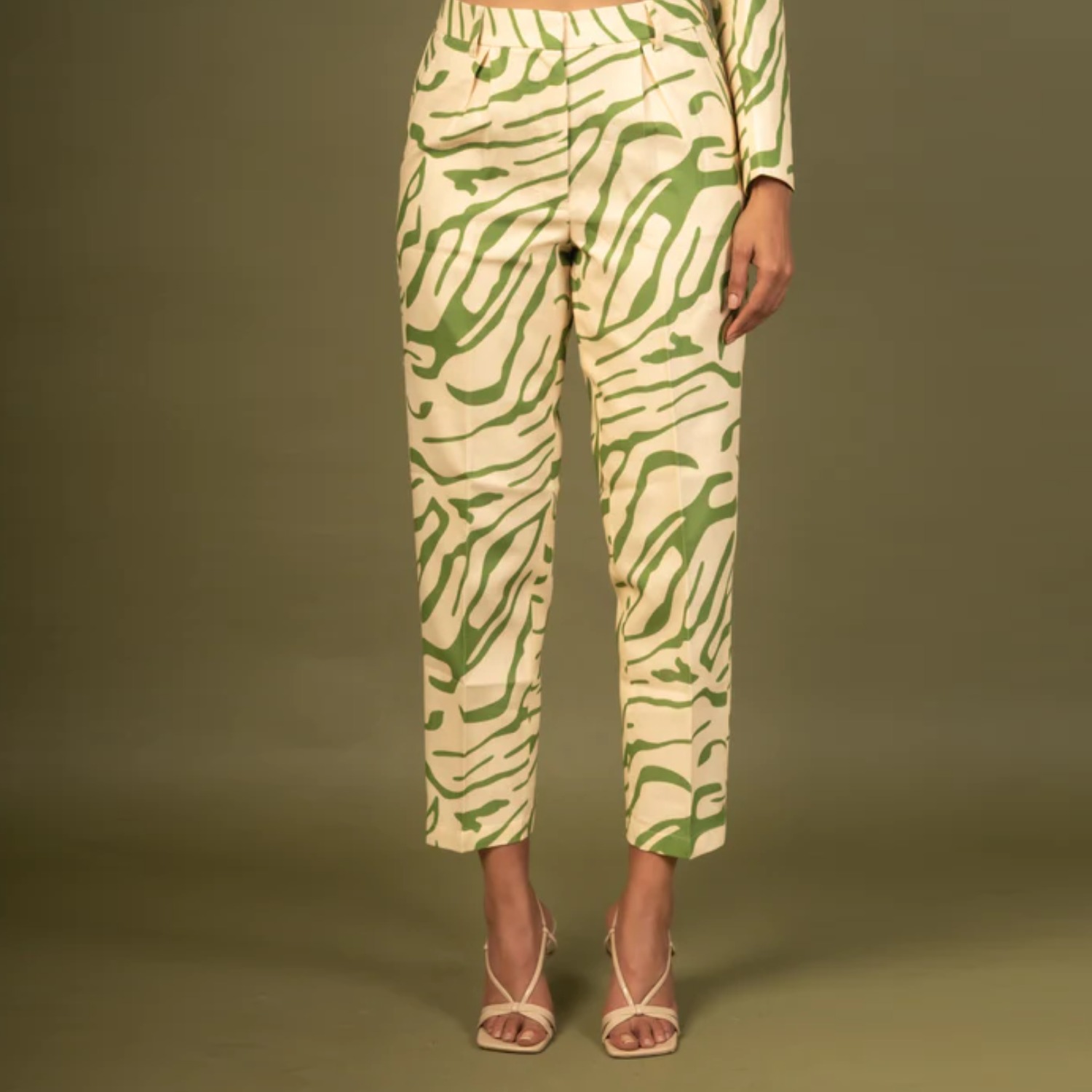 ₹ 3,900 (25% off)Crafted from high-quality linen fabric, these pants feature cream zebra prints on a green base. These pants have a relaxed fit, offering a flattering silhouette. Style it with statement gold hoops and heels for a dressy event.