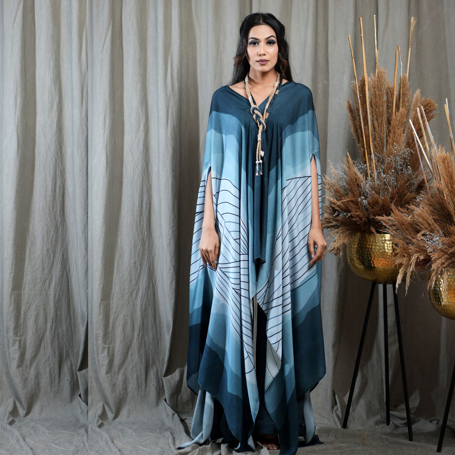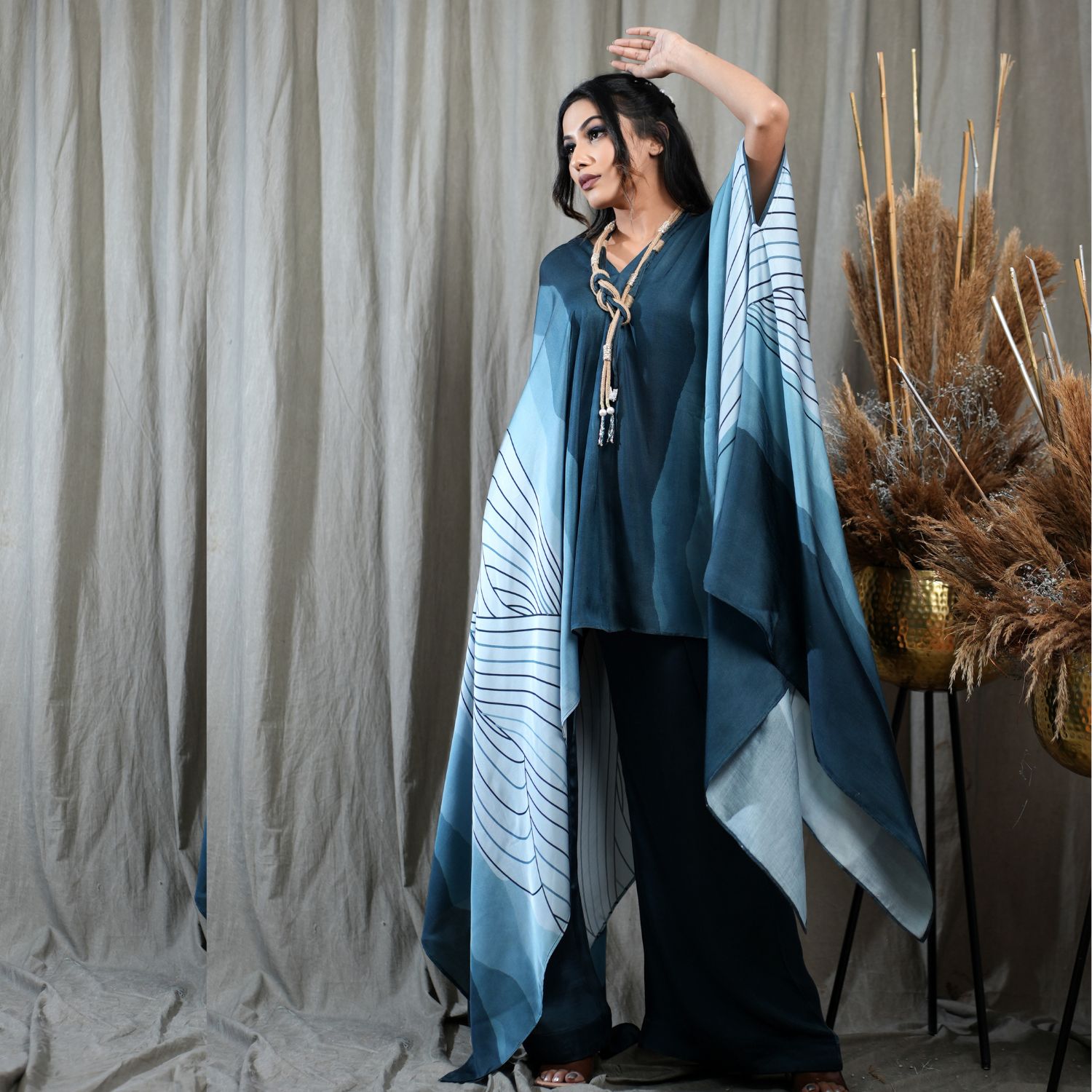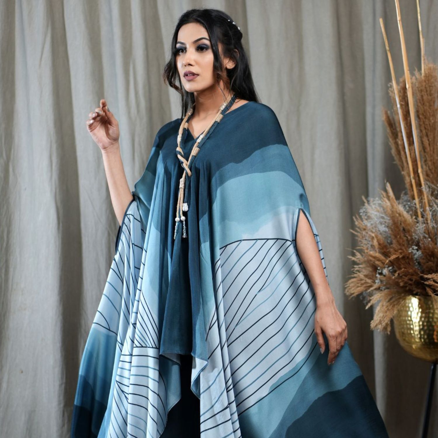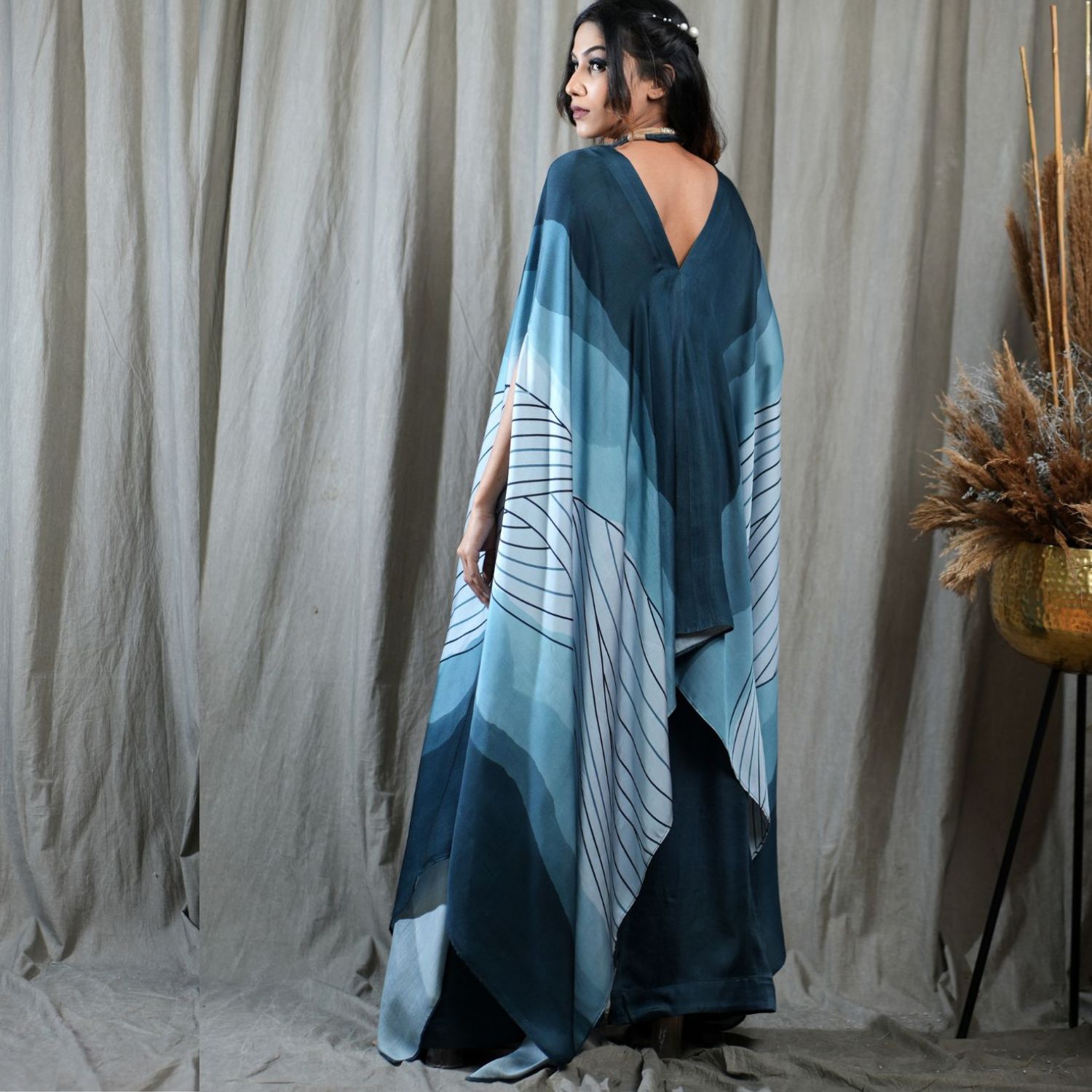 Discover the allure of this dark blue v neck printed long and short cape. With stylish slit sleeves, this cape exudes modern elegance. Complete the look with a complimentary handcrafted necklace, adding a touch of uniqueness to your style. Paired with flared-fit solid color pants, this ensemble promises a chic and graceful appearance. Embrace the charm and versatility of this fashionable outfit, perfect for making a statement on any occasion.