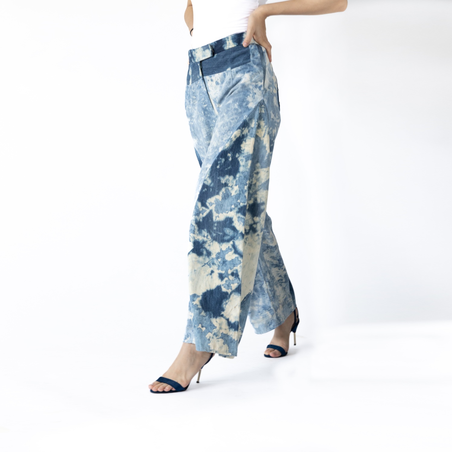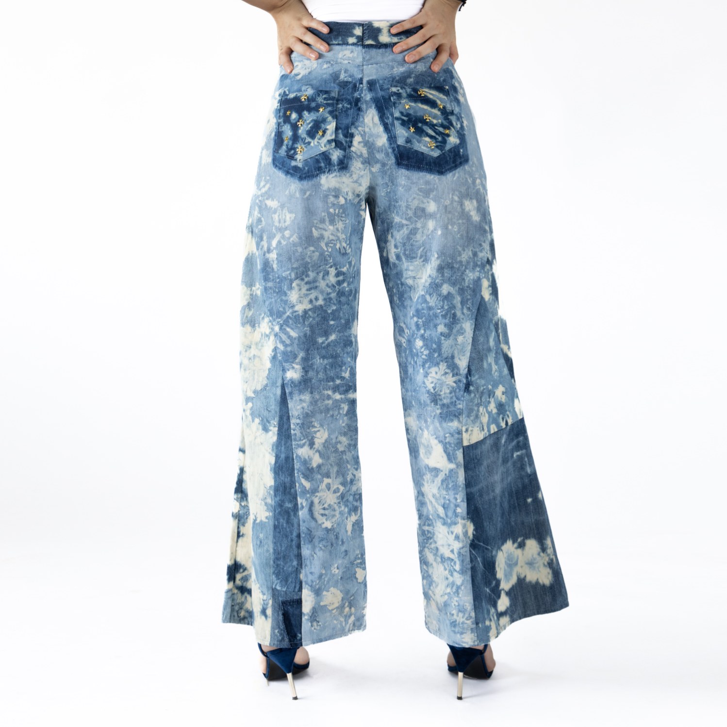 ₹ 8,200 (10% off)Elevate your fashion game with these flared denim pants, a fusion of three upcycled denim pairs. Featuring gold stud detailing on the patch pockets at the back, this stylish ensemble seamlessly blends sustainability and flair for a distinctive and chic look.
