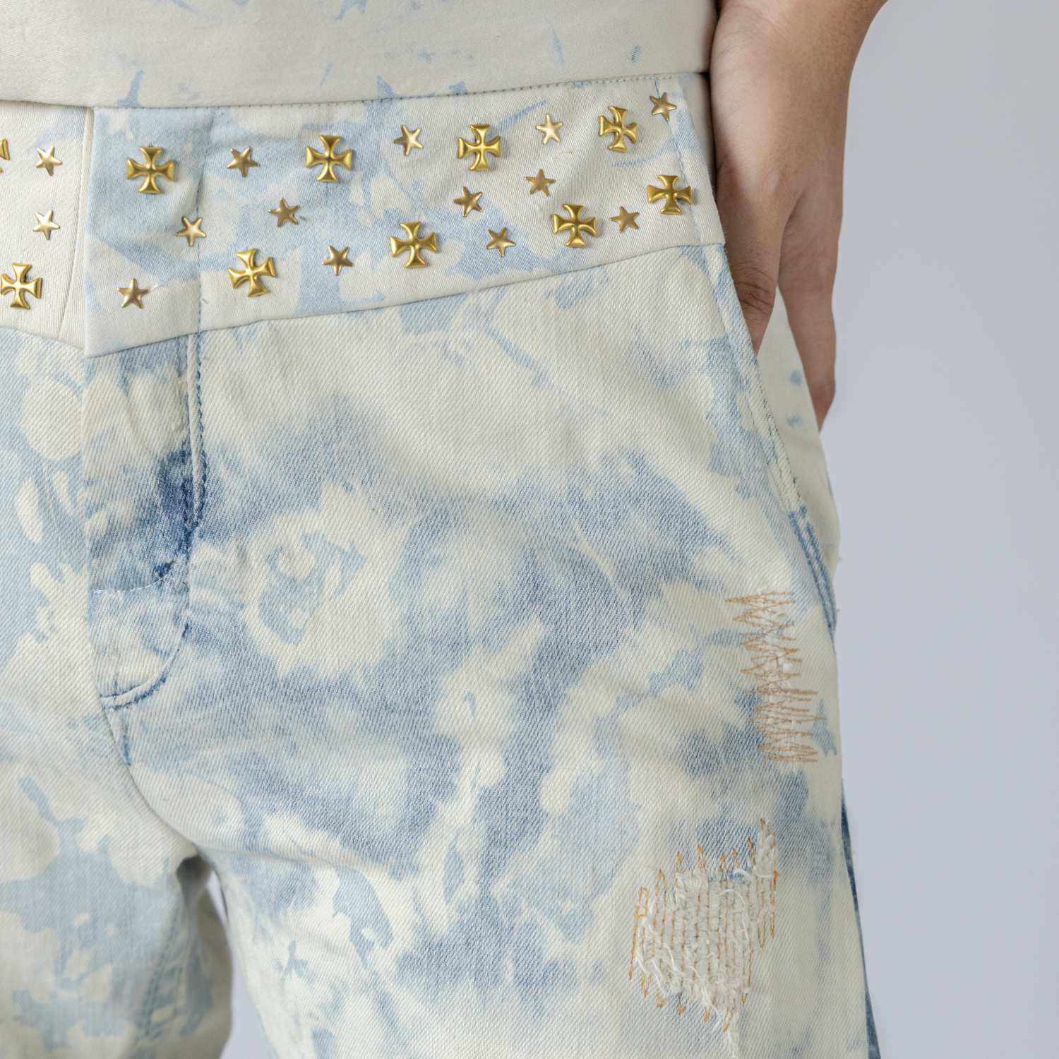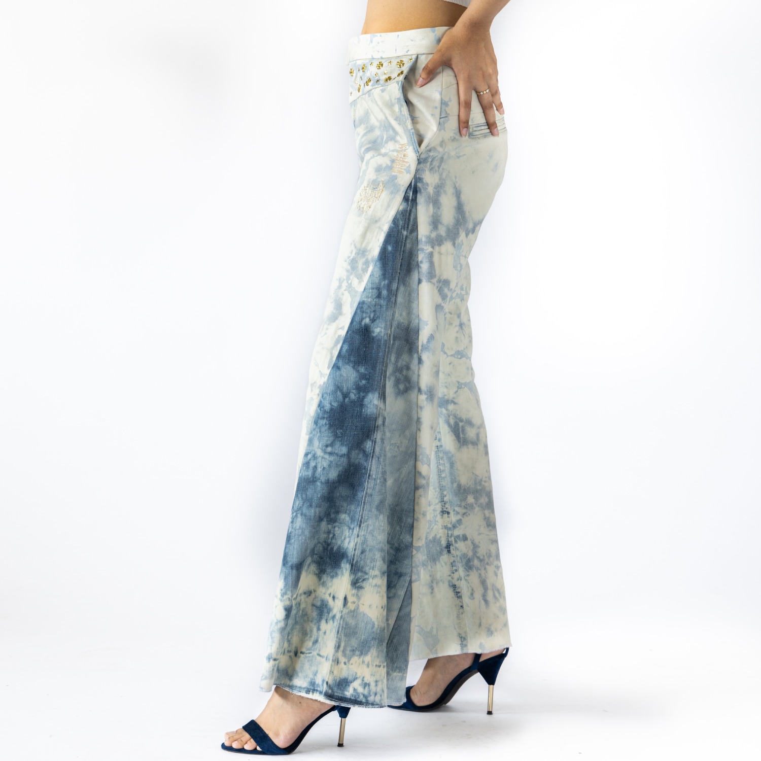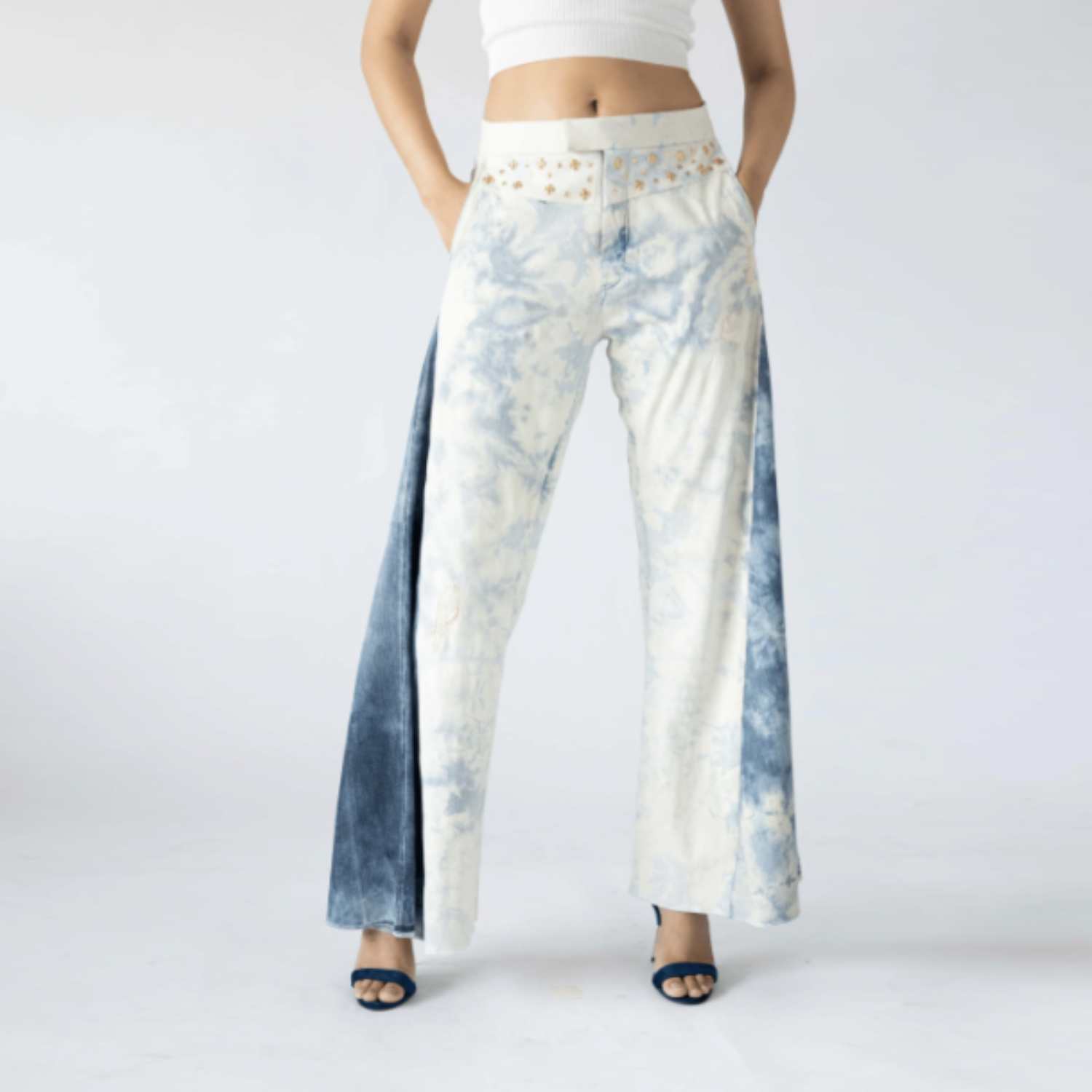 These flared pants are made with two different pairs and shades of denim, embellished with gold studs. Pair this with blue jeans and sneakers for a casual day out.