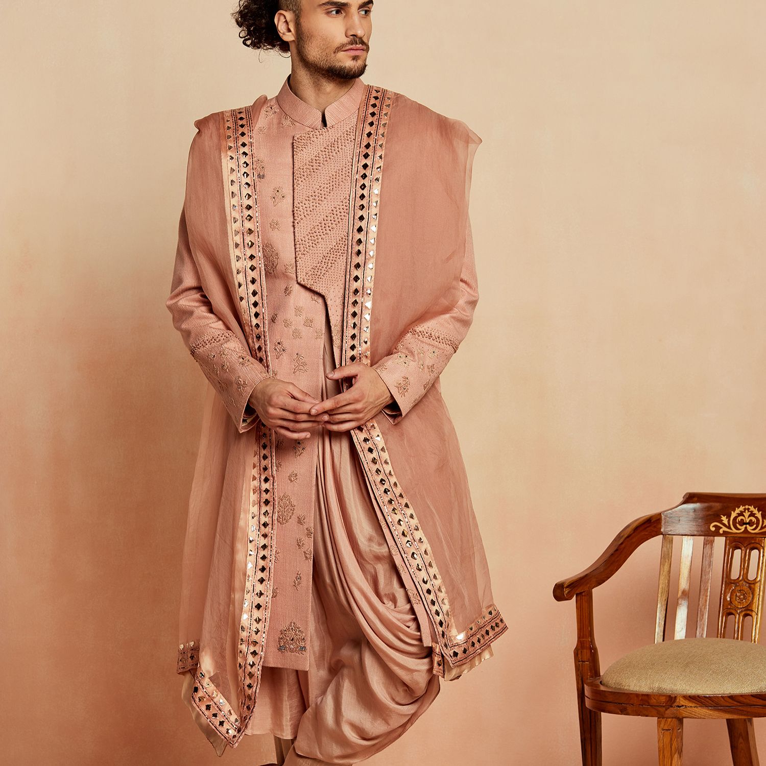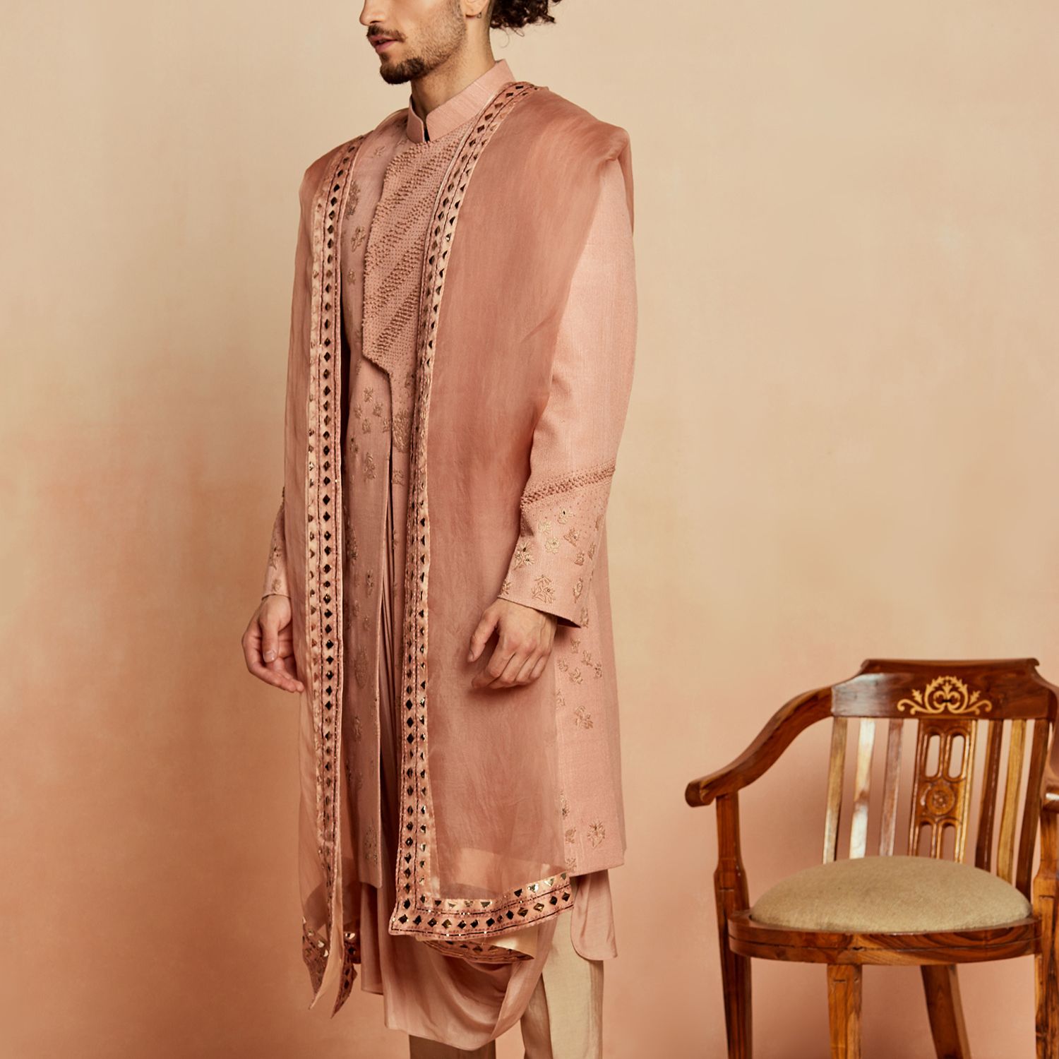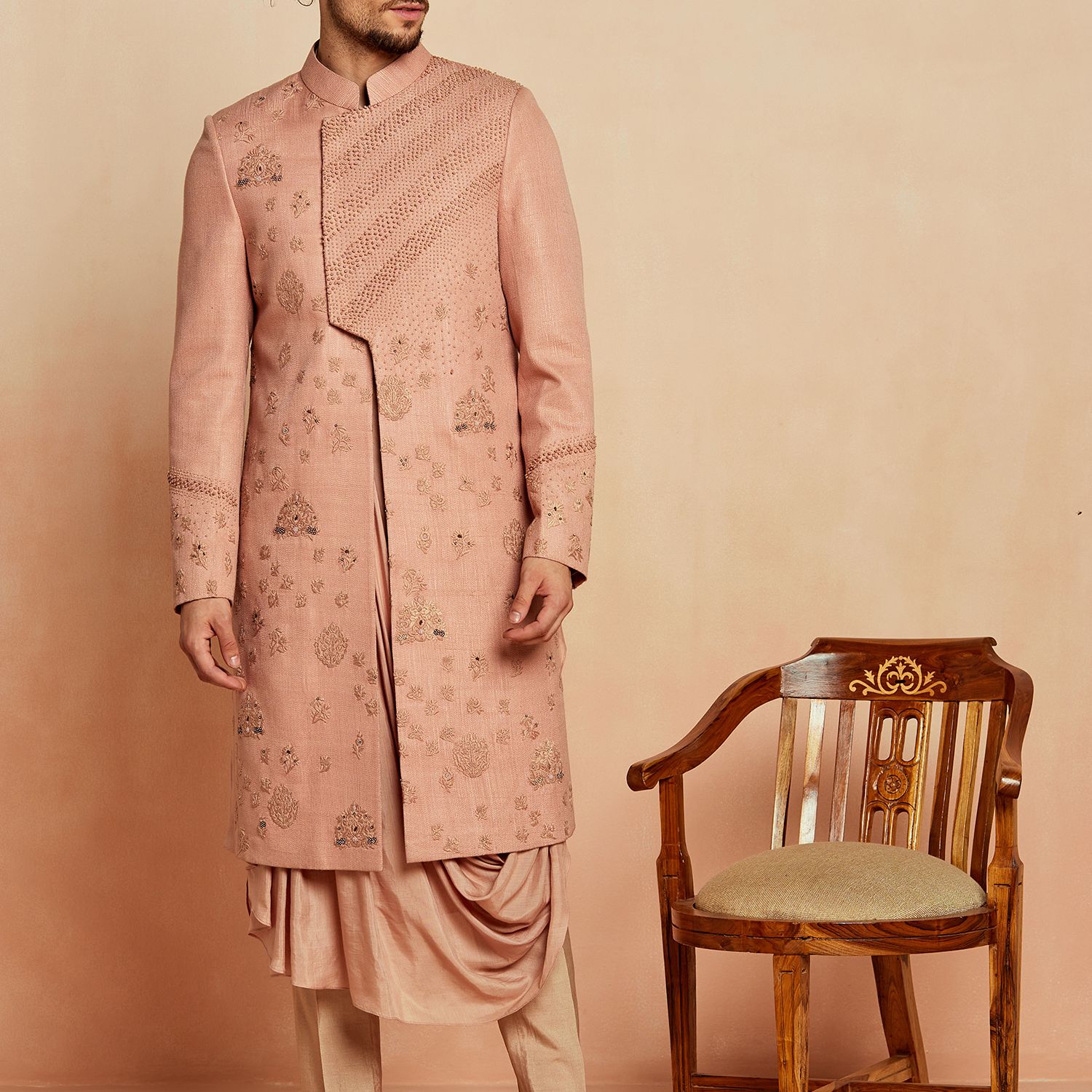 This sherwani features a stunning dusty pink color, exuding elegance and sophistication. It is crafted from premium silk fabric, ensuring a luxurious and comfortable wearing experience. The sherwani showcases intricate lineage patterns, adding a touch of traditional charm to your look. With its classic design and impeccable craftsmanship, it is perfect for special occasions, weddings, or cultural events.