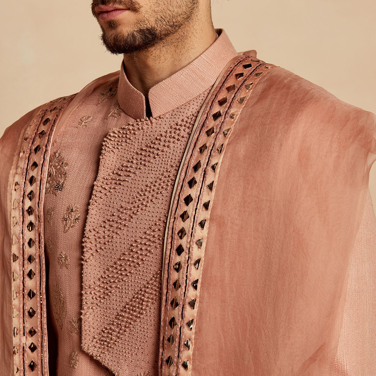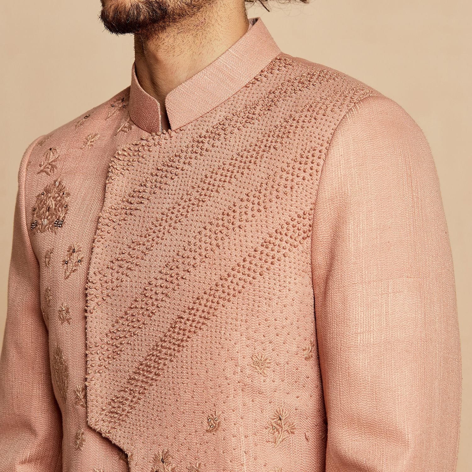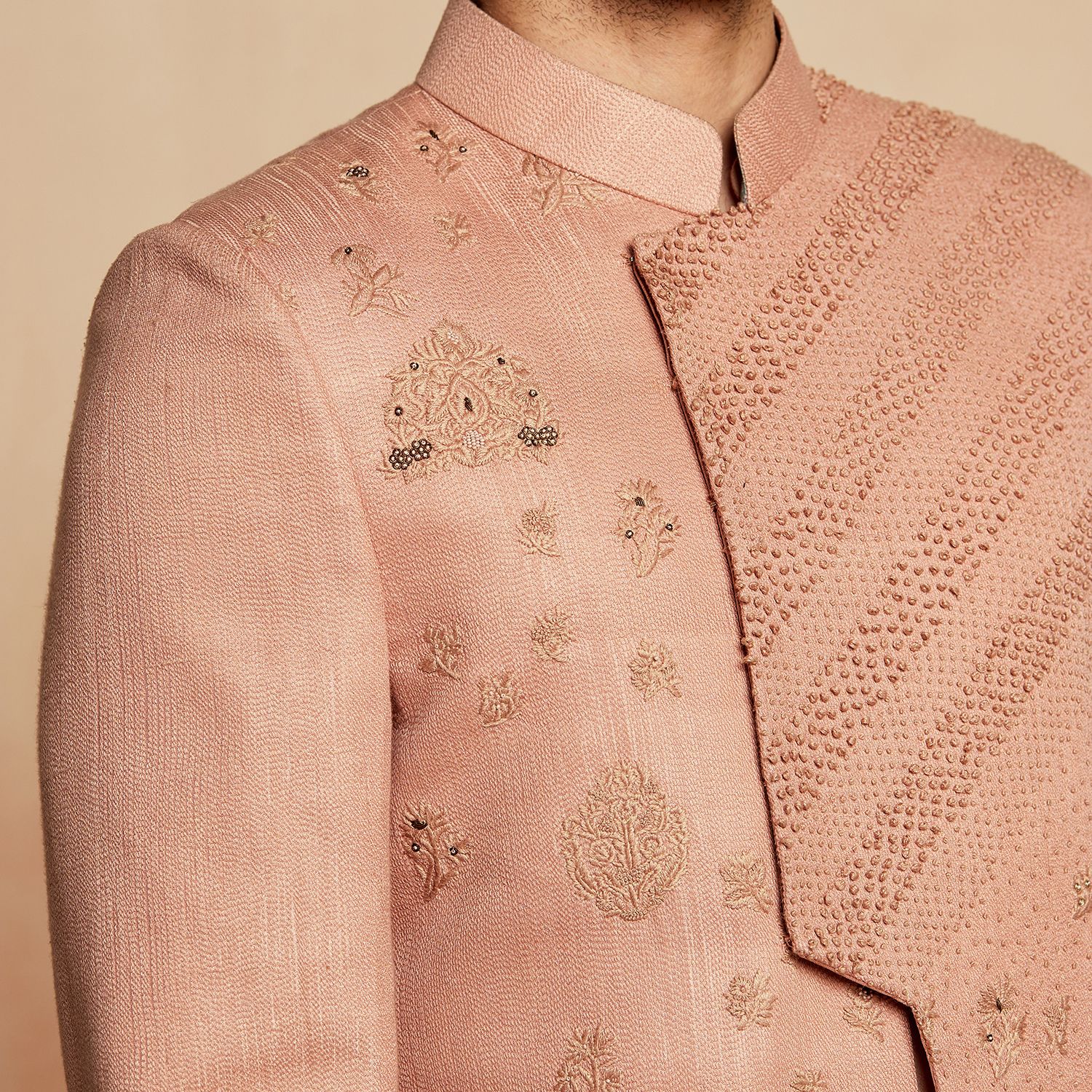 This sherwani features a stunning dusty pink color, exuding elegance and sophistication. It is crafted from premium silk fabric, ensuring a luxurious and comfortable wearing experience. The sherwani showcases intricate lineage patterns, adding a touch of traditional charm to your look. With its classic design and impeccable craftsmanship, it is perfect for special occasions, weddings, or cultural events.