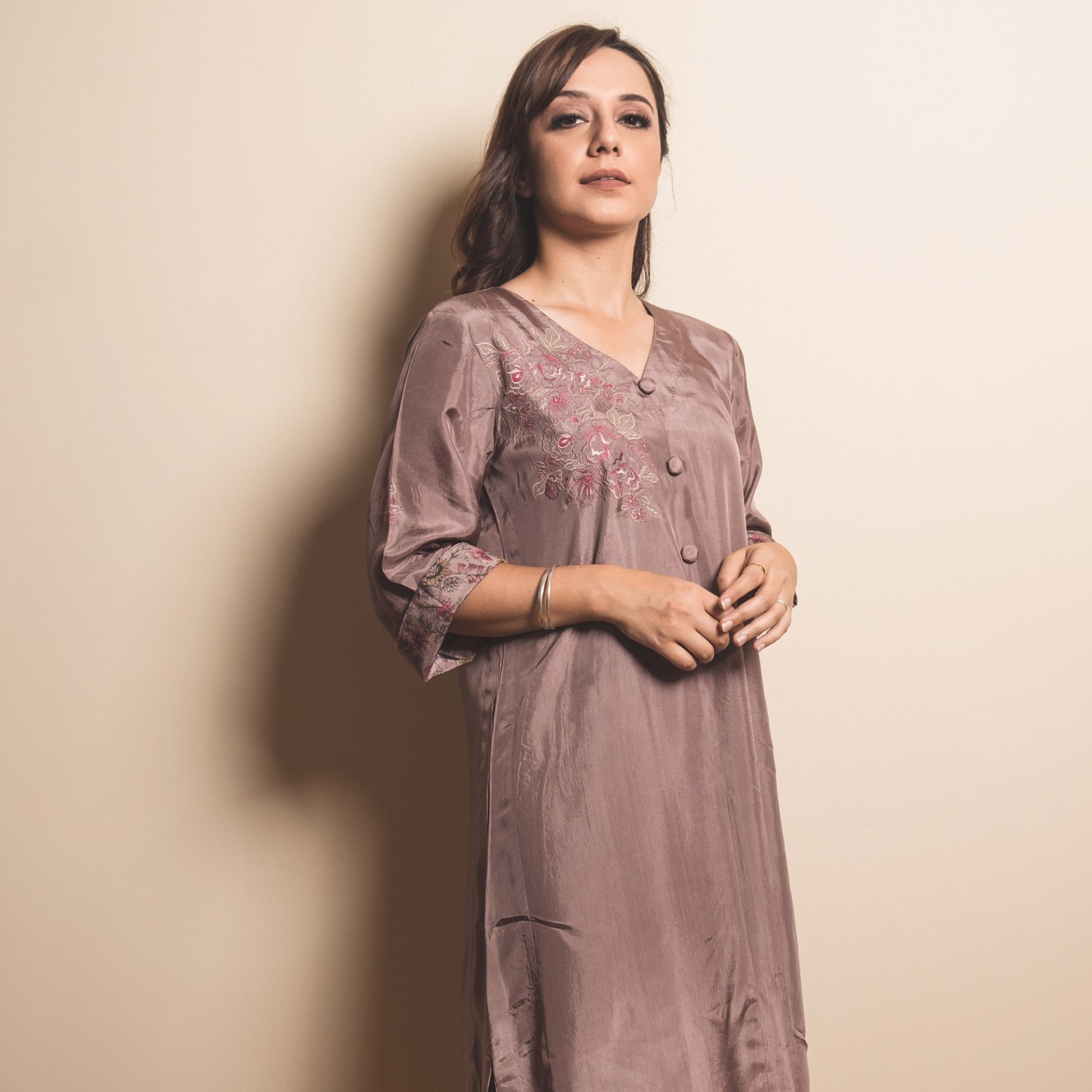 ₹ 14,500 (10% off)This mauve plain kurta, exquisitely crafted from pure silk, is enhanced with embroidered floral patterns in the front and at the back. Paired with matching straight pants, this set creates a seamless, sleek silhouette that offers modern glamour. Pair it with delicate jhumkas and juttis for a traditional look.