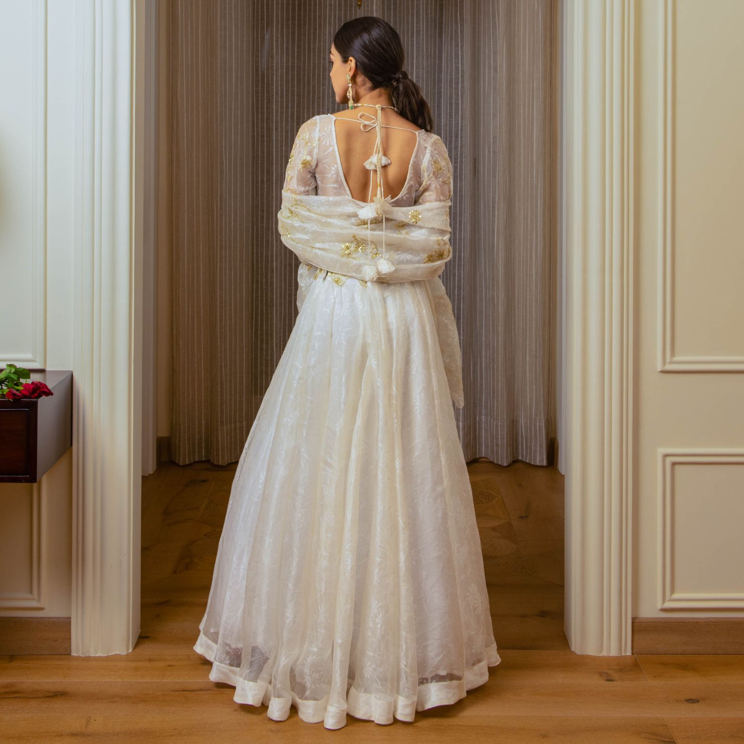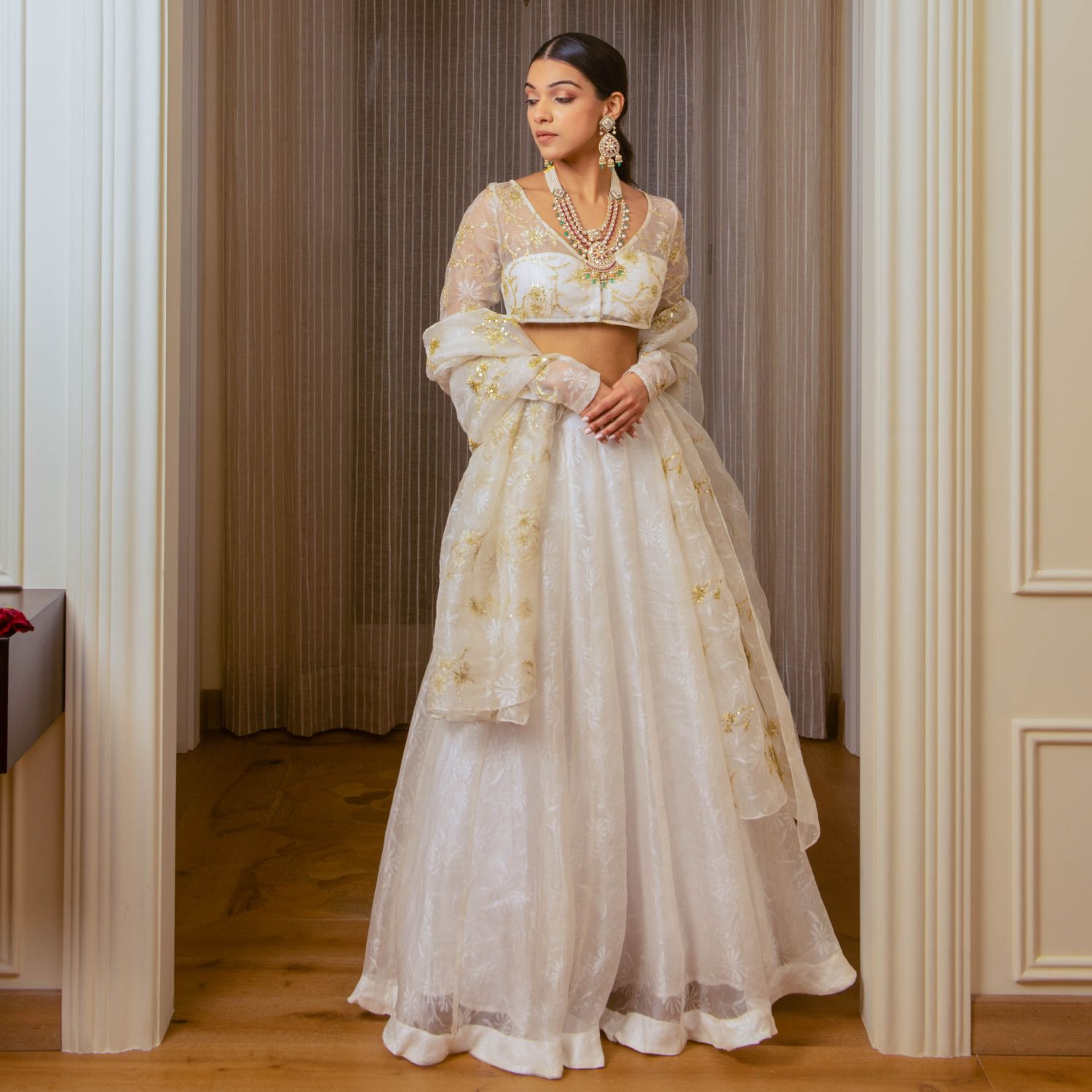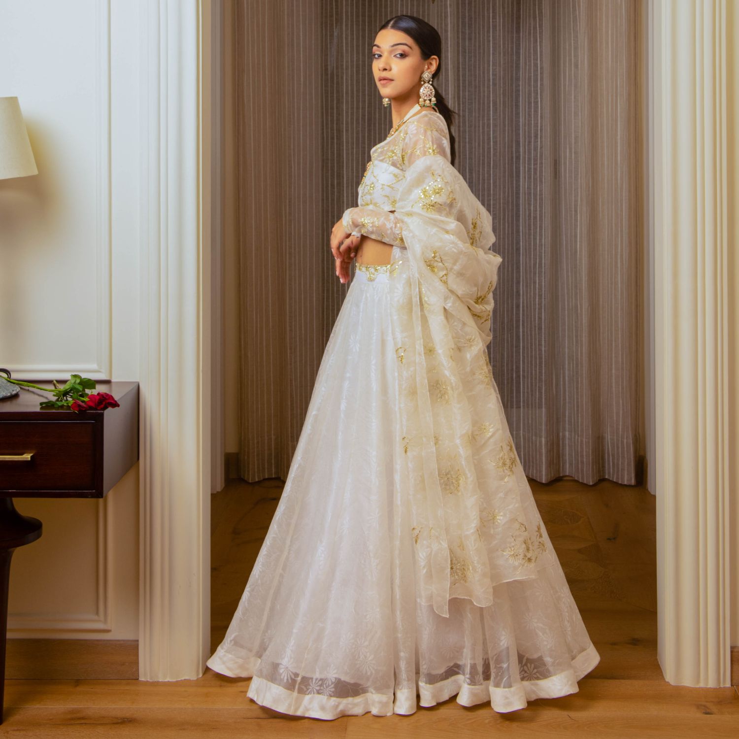 ₹ 48,000 (5% off)This lehenga set, crafted from silk organza, is adorned with zari and delicate sequin work, creating a timeless and refined look. The dupatta in kota silk features detailed hand embroidery at the border, adding sophistication to the outfit. Accompanied by matching burnt red mid-waist pants in chanderi fabric with a back elasticated waist and side pockets, this ensemble offers both style and comfort.