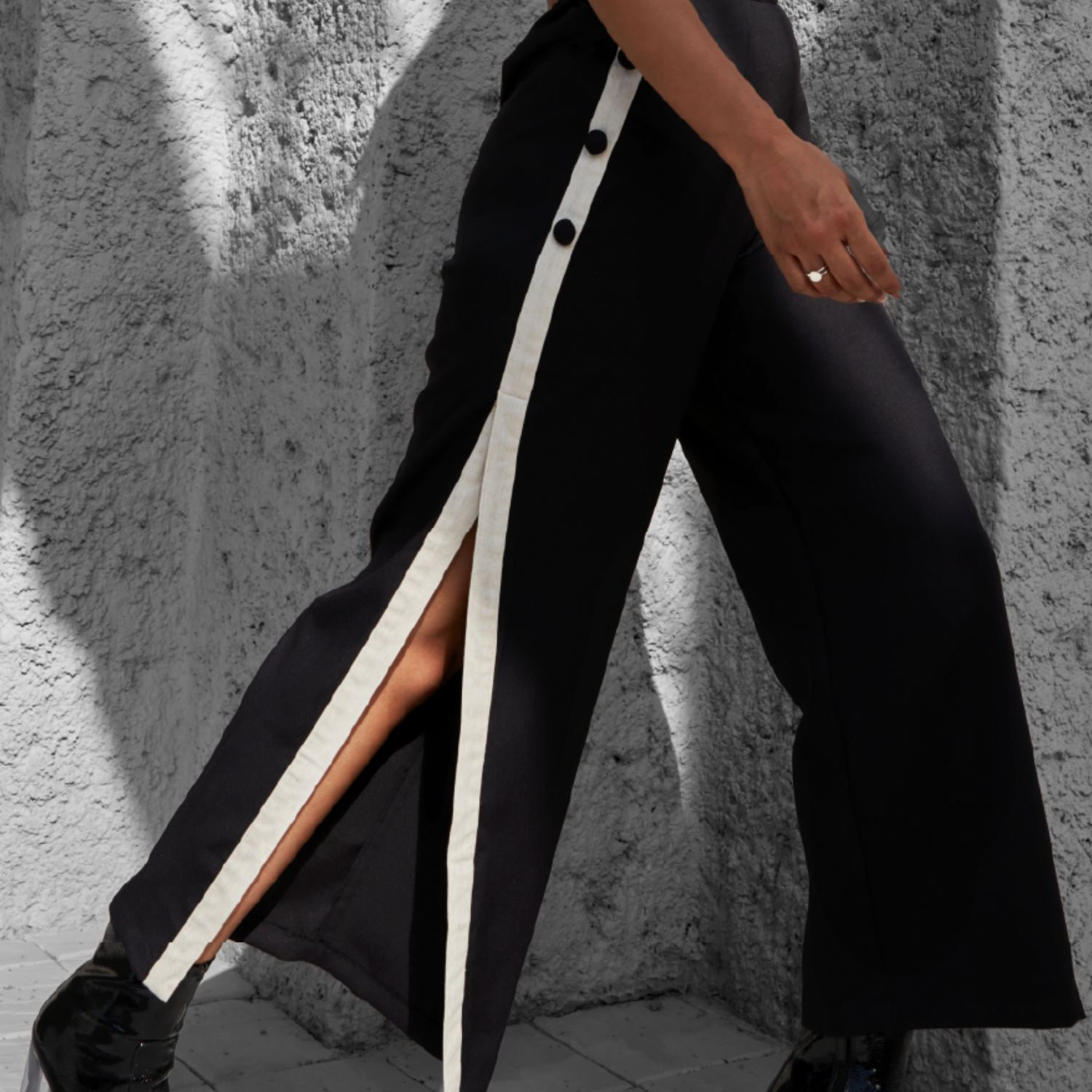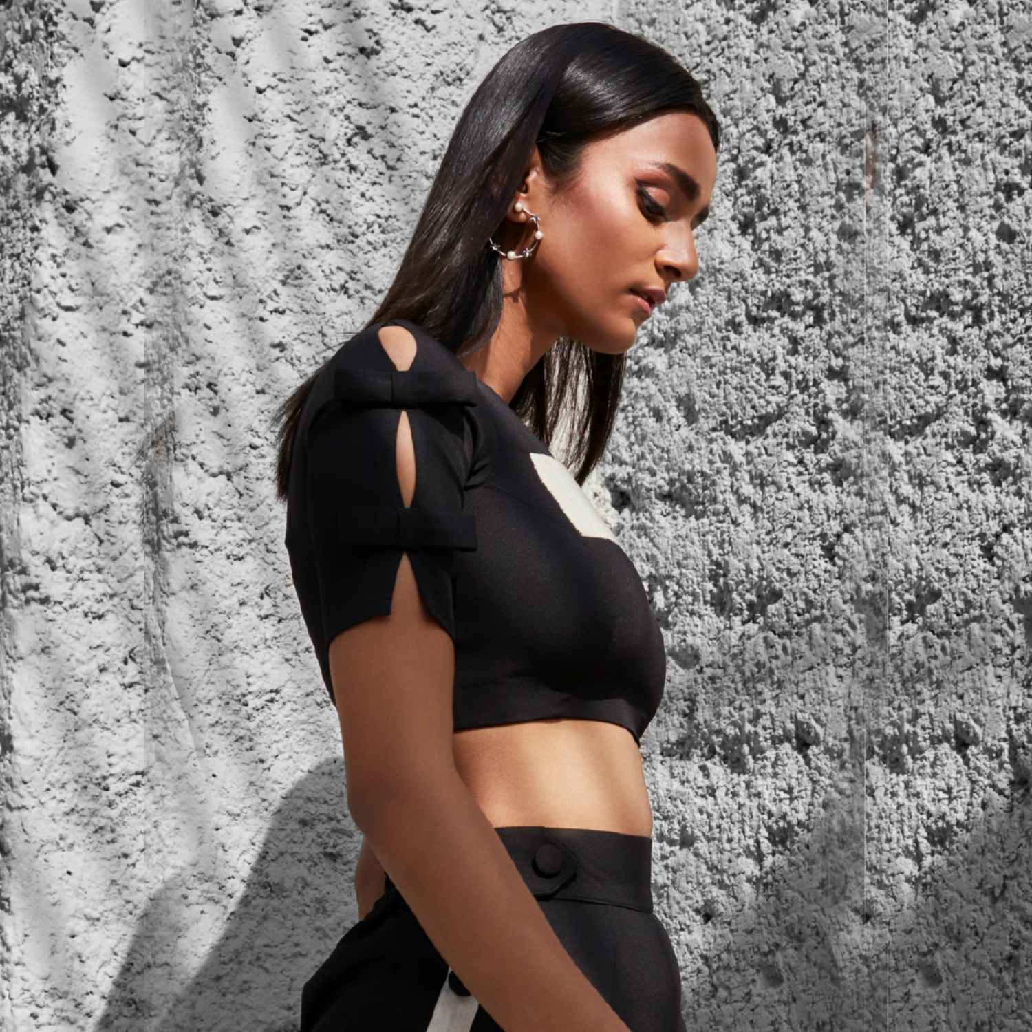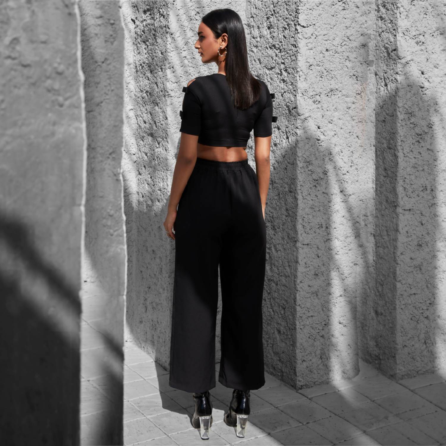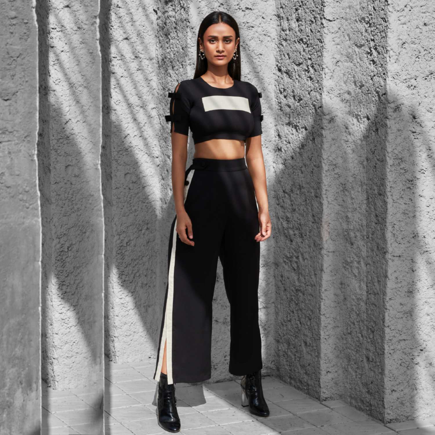 This co-ord set features a black and white color-blocked crop top with a round neckline, slit half sleeves, bow detail, concealed back, and side zip, offering a stylish look. The black high-waist palazzo pants with a single side slit, white side stripe, and black bound buttons create a trendy outfit. Pair this outfit with minimal jewellery and a cross-body bag for a casual outing with friends.