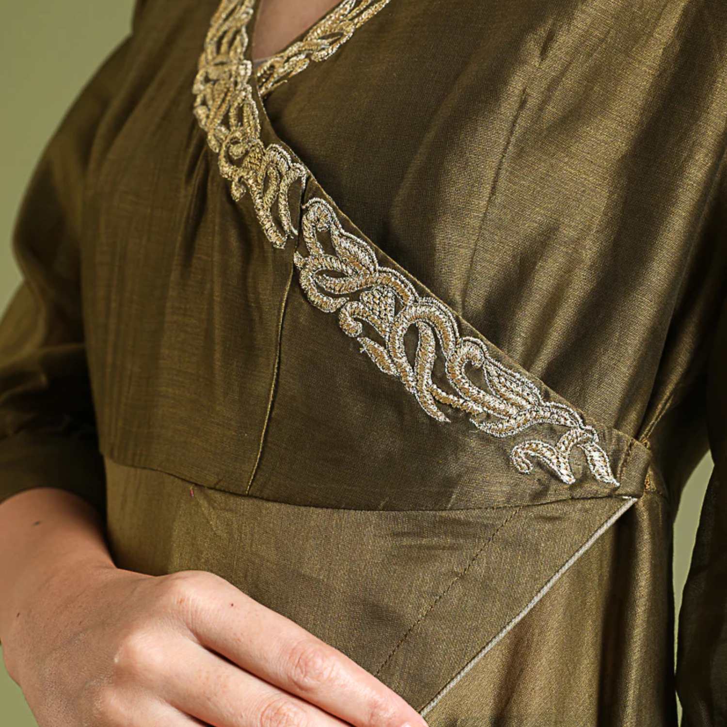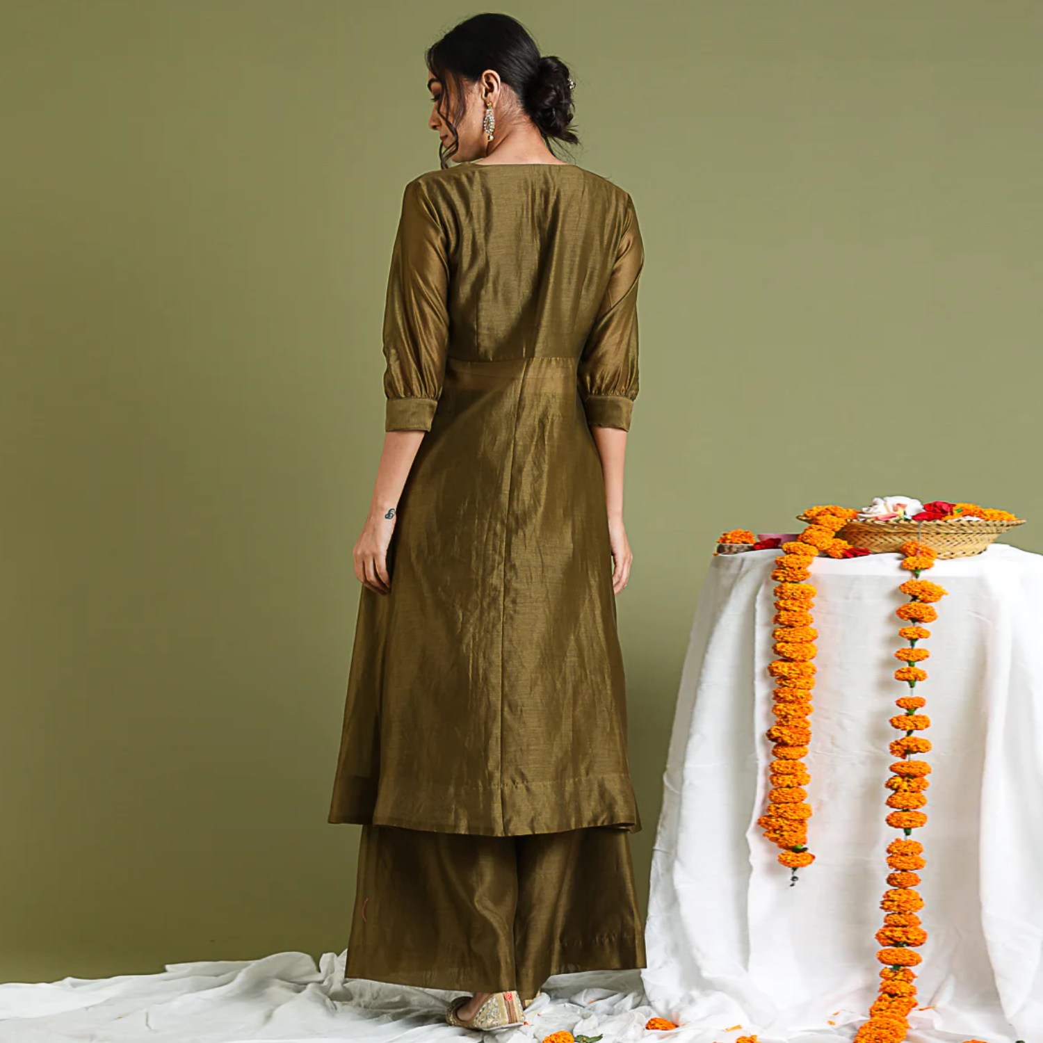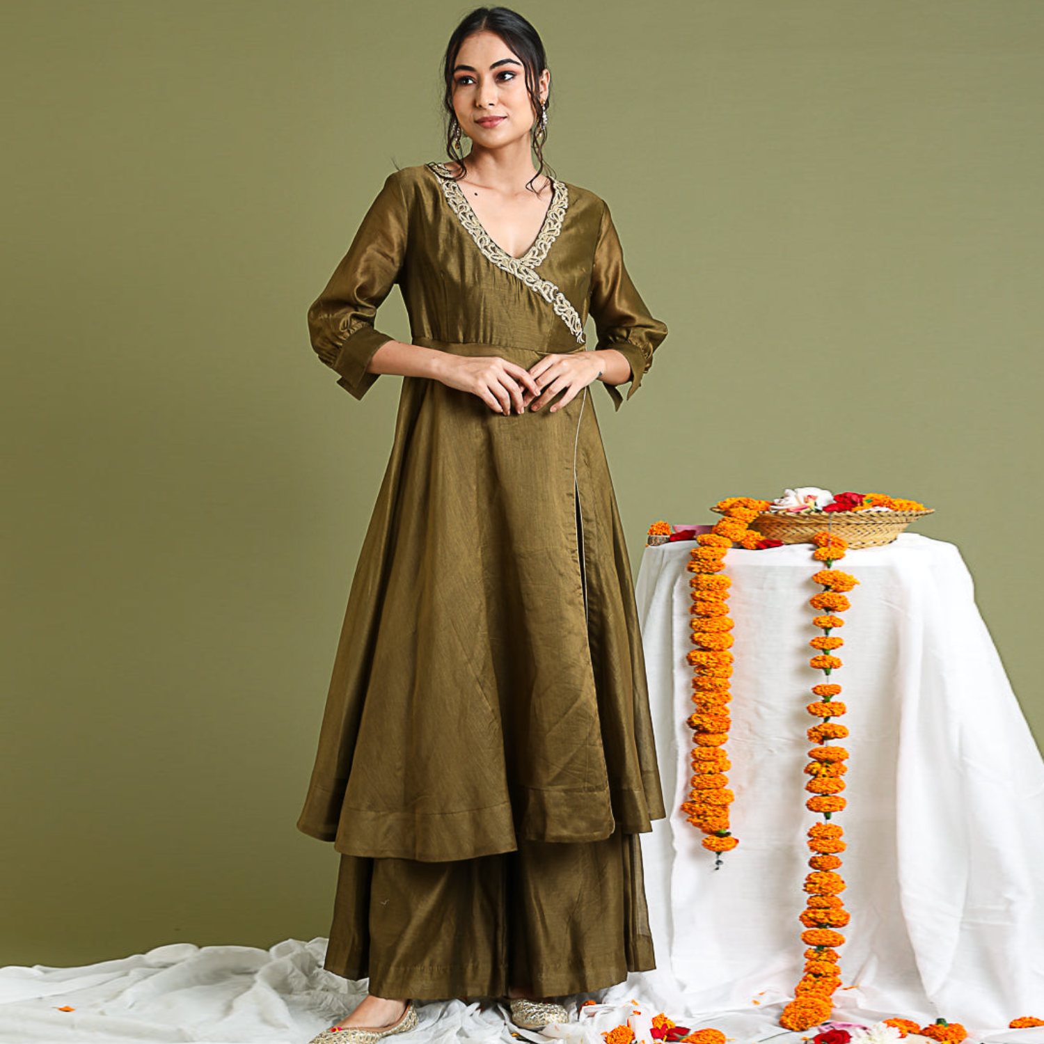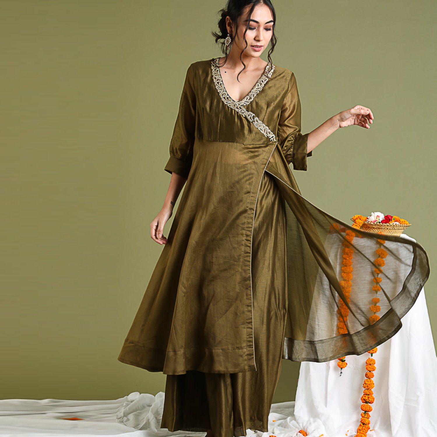 ₹ 8,499 (10% off)Discover timeless elegance in our chanderi wrap-around anarkali kurta with high slits and side closure, adorned with floral gold embroidery and tissue trims. Paired with a chanderi flared pallazo in tobacco brown, this handcrafted ensemble exudes versatility for festive occasions and formal wear.