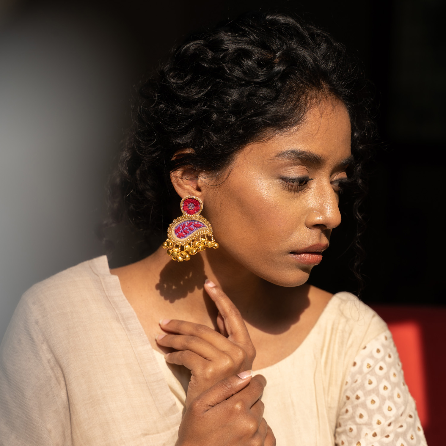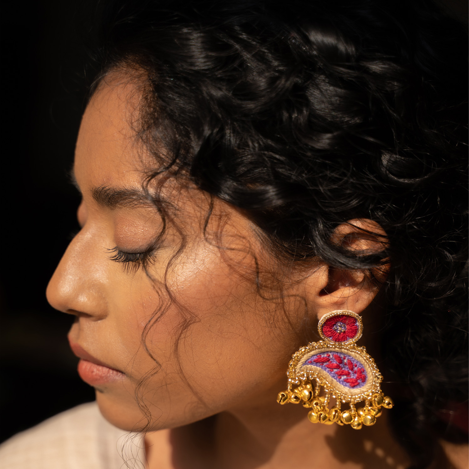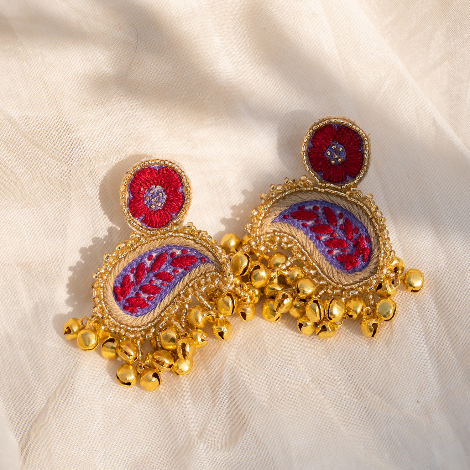 These earrings feature exquisite kashmiri threadwork motifs. They have stunning paisley designs and ghungroo tassels that dangle gracefully. They are secured with a clasp closure for easy and comfortable wear.