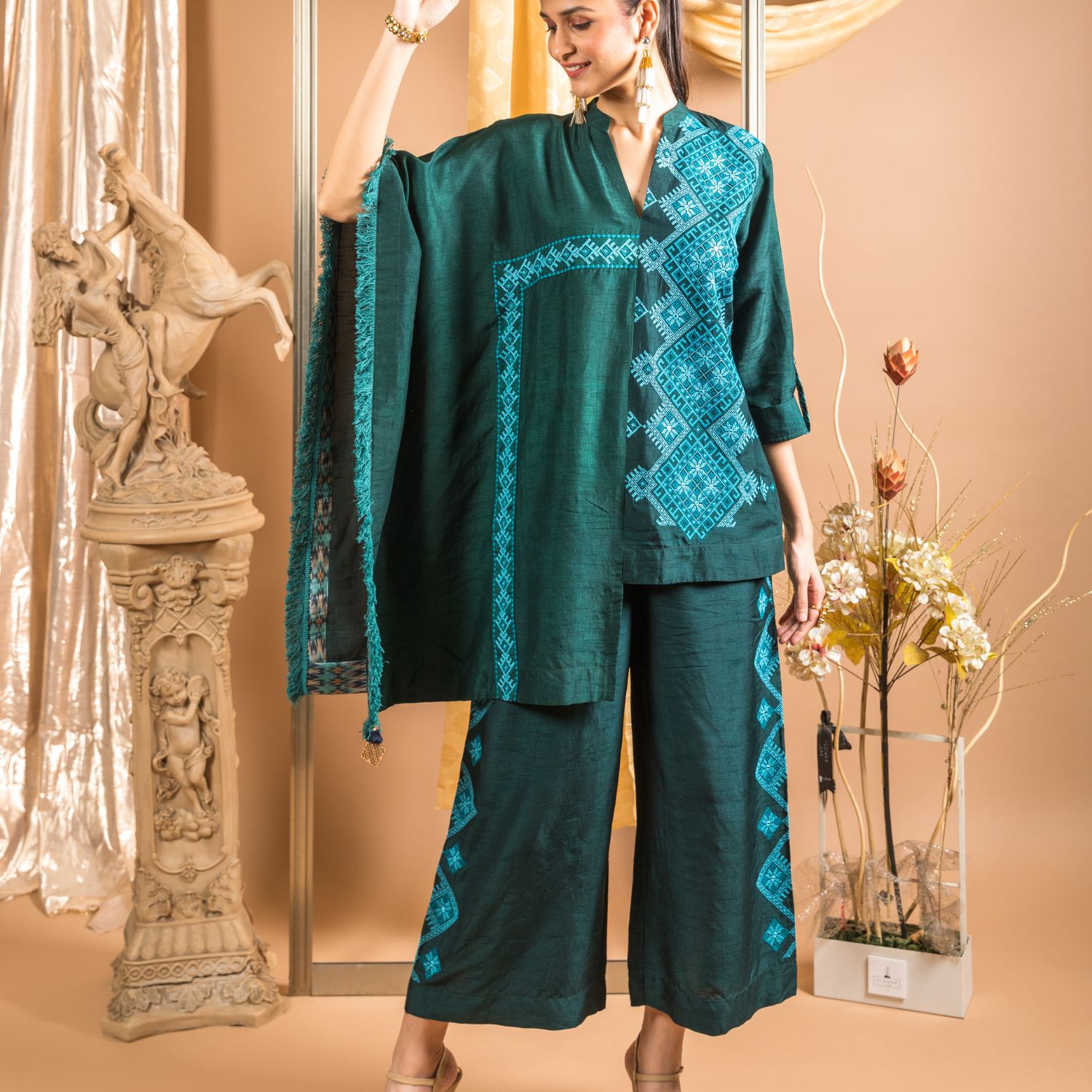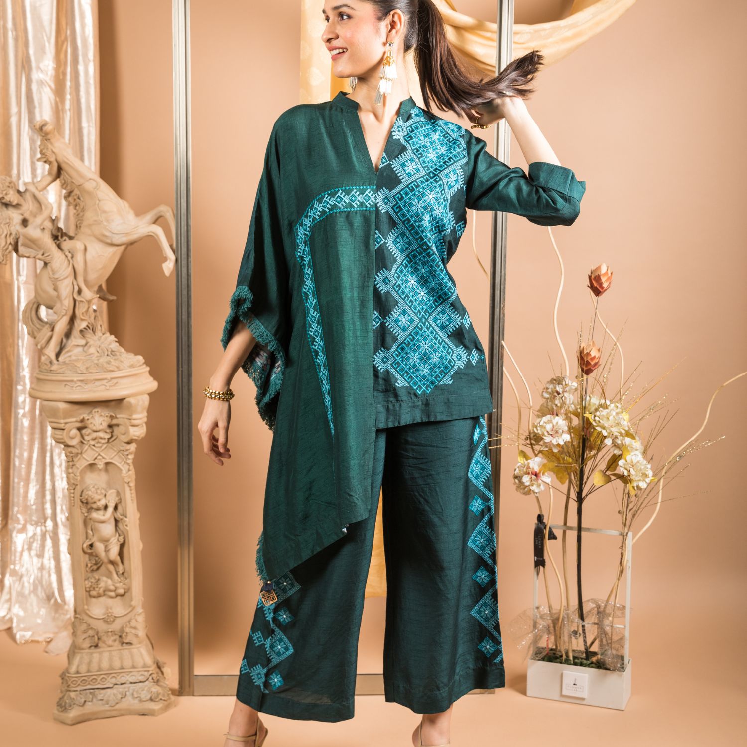 This statement emerald green co ord set is perfect for the festive season. The intricate blue cross stitch embroidery adds a pop of colour to this monochrome look. Style this set with statement studs to complete the look.