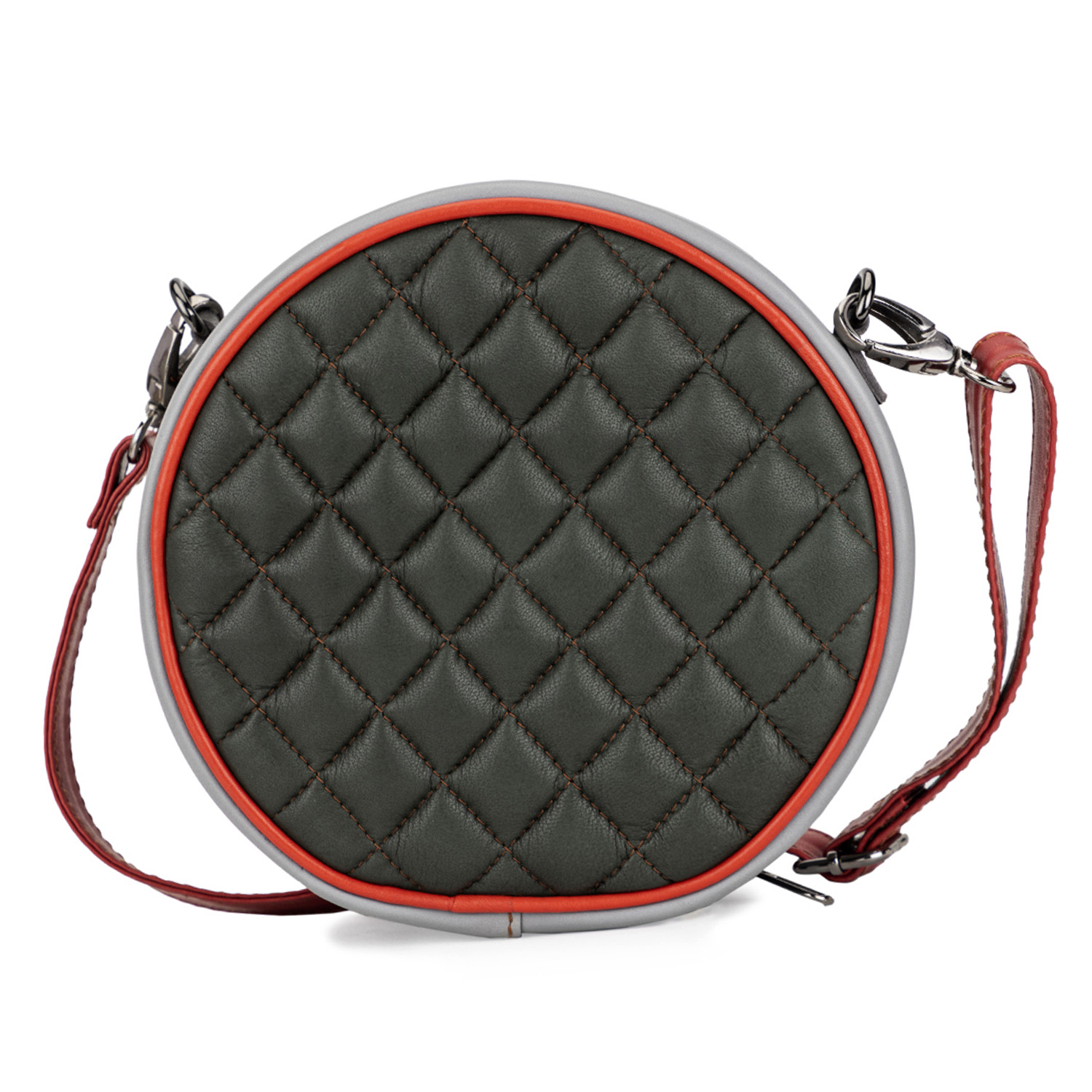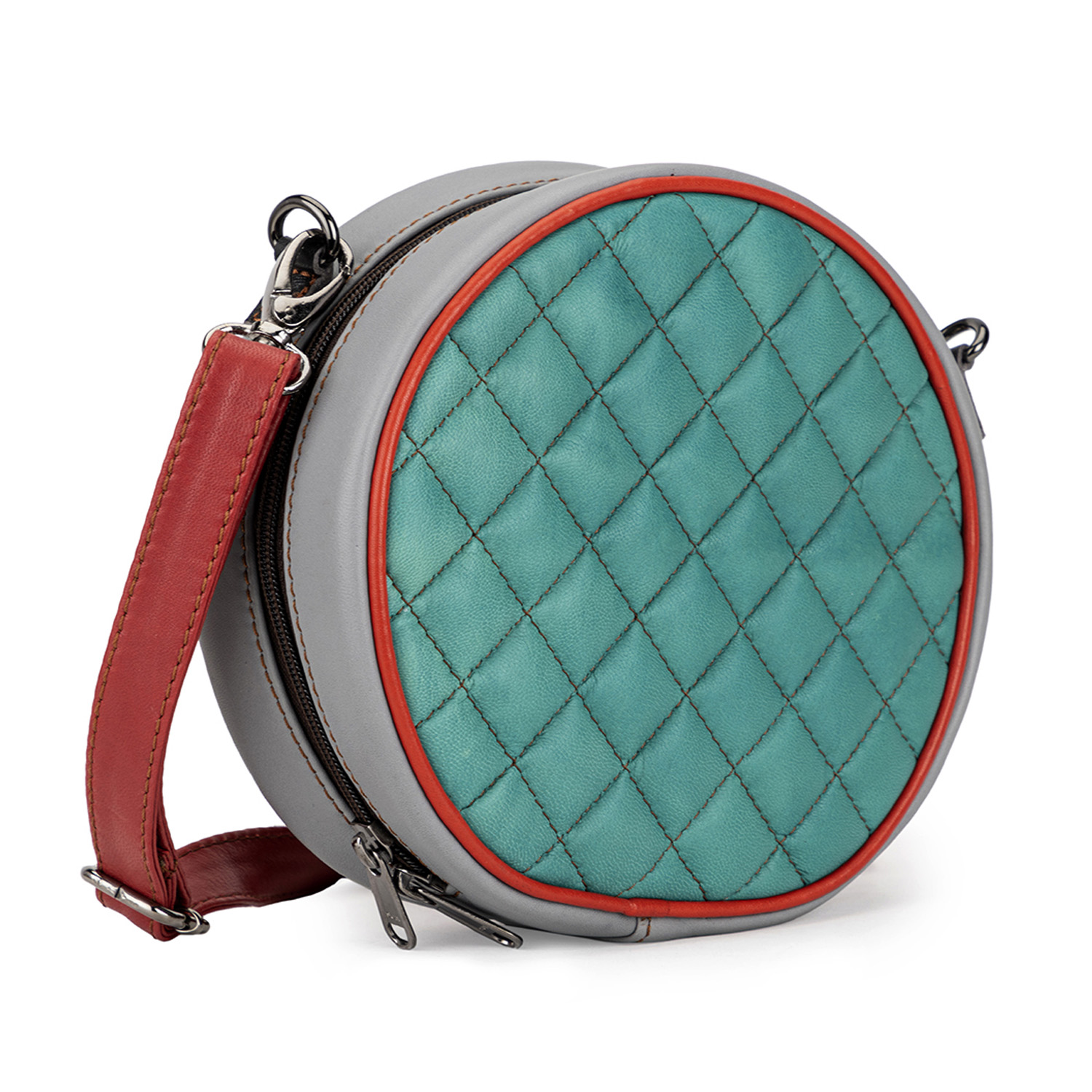 This leather sling bag features a beautiful green color and an elegant quilted design. This bag has a round shape and a zipper closure, ensuring the security of your belongings. Style it with a dress and classic pumps for a dressy day out.