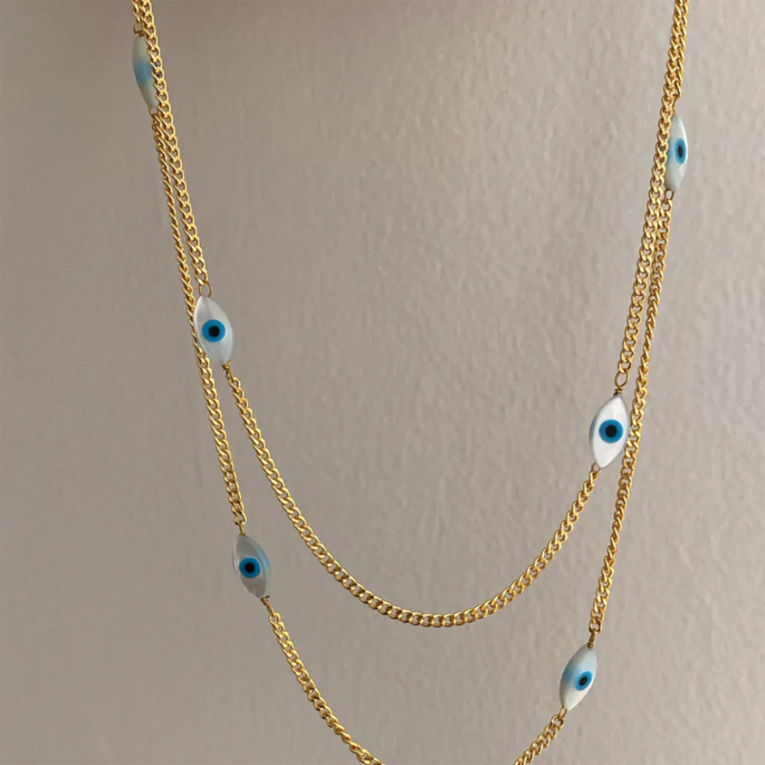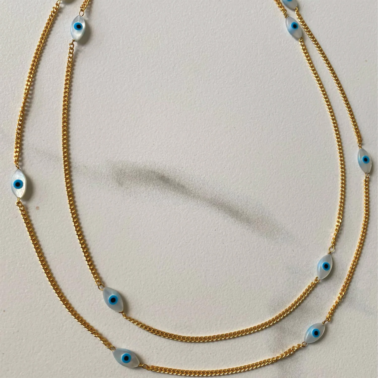₹ 1,099 (15% off)This layered chain is crafted from high-quality brass material with 18-kt gold plating. It has a lustrous gold shade and features an evil eye made of mother of pearl. Style it with a v-neck top and a sling bag for a dressy event.