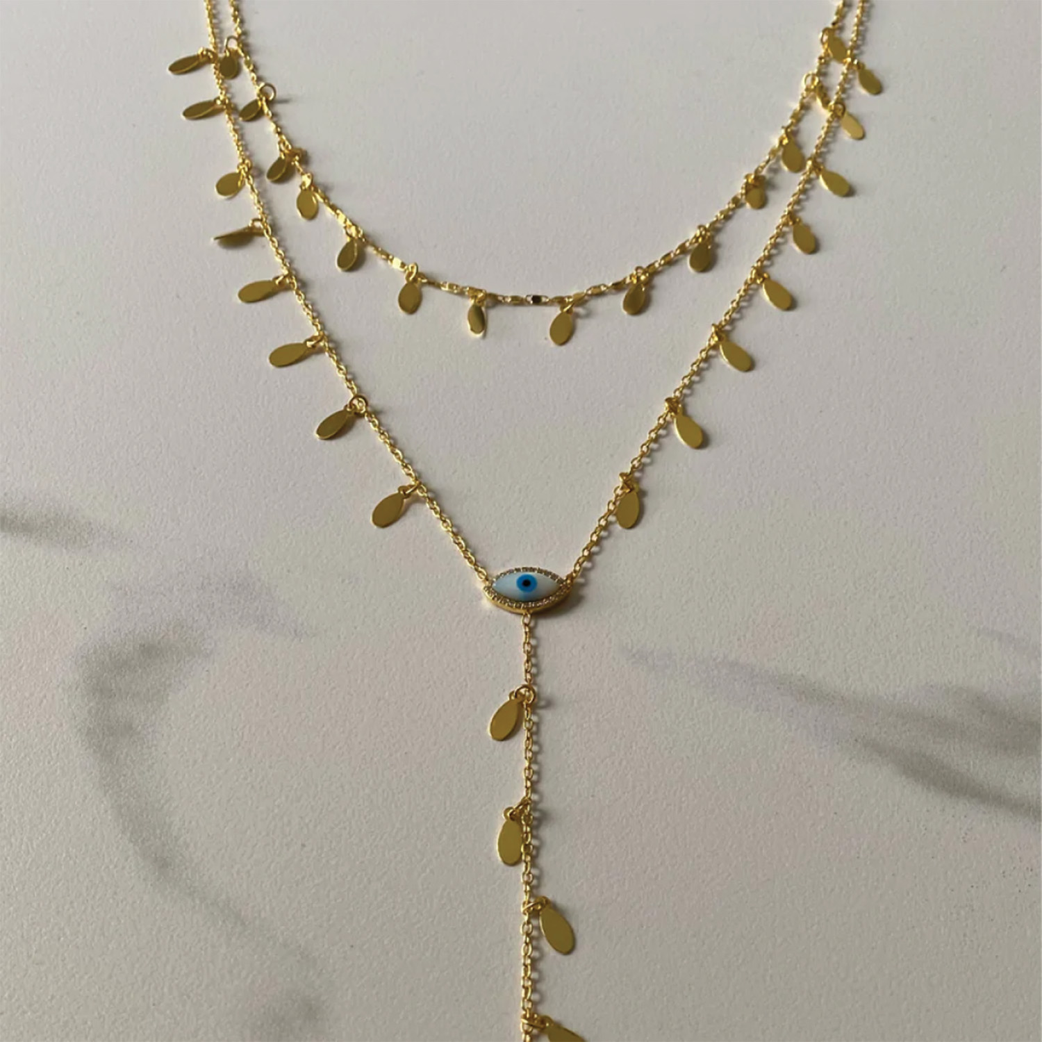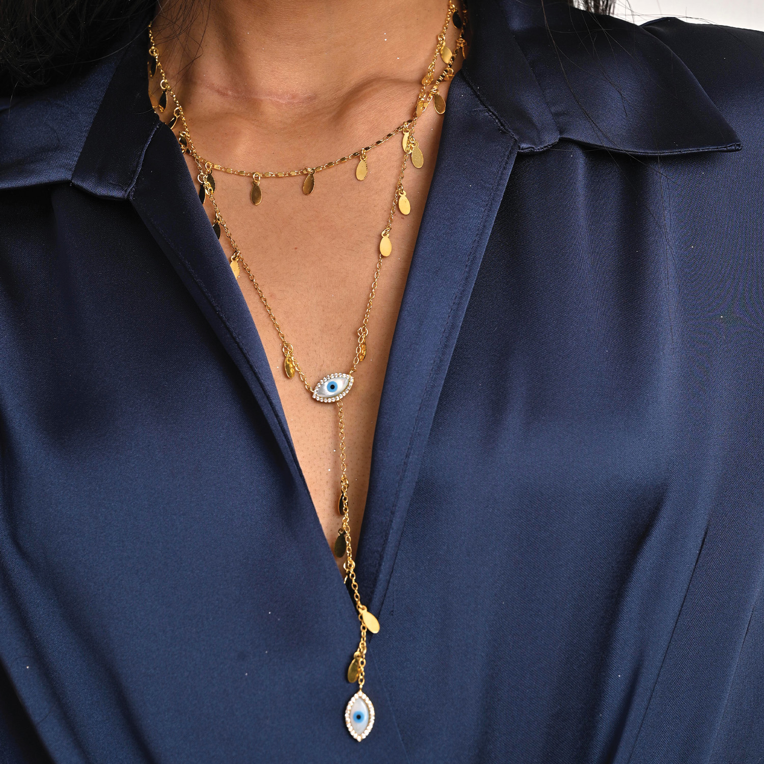 This layered necklace has a cute tag chain and an evil eye made of mother of pearl and cubic zirconia diamonds. Style it with a blazer and a sling bag for a chic look.