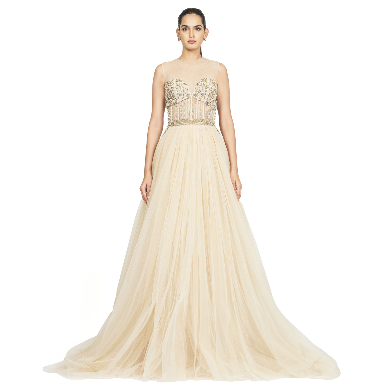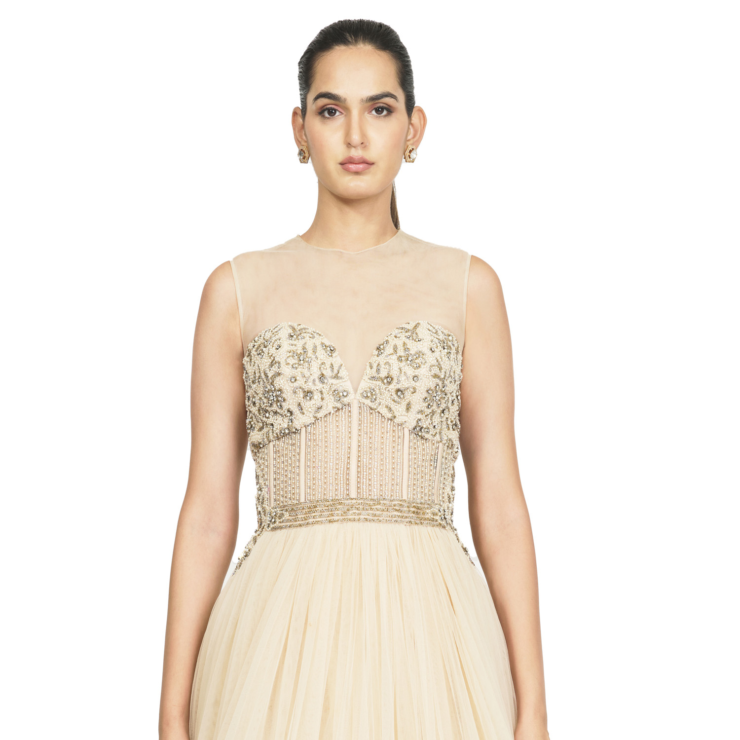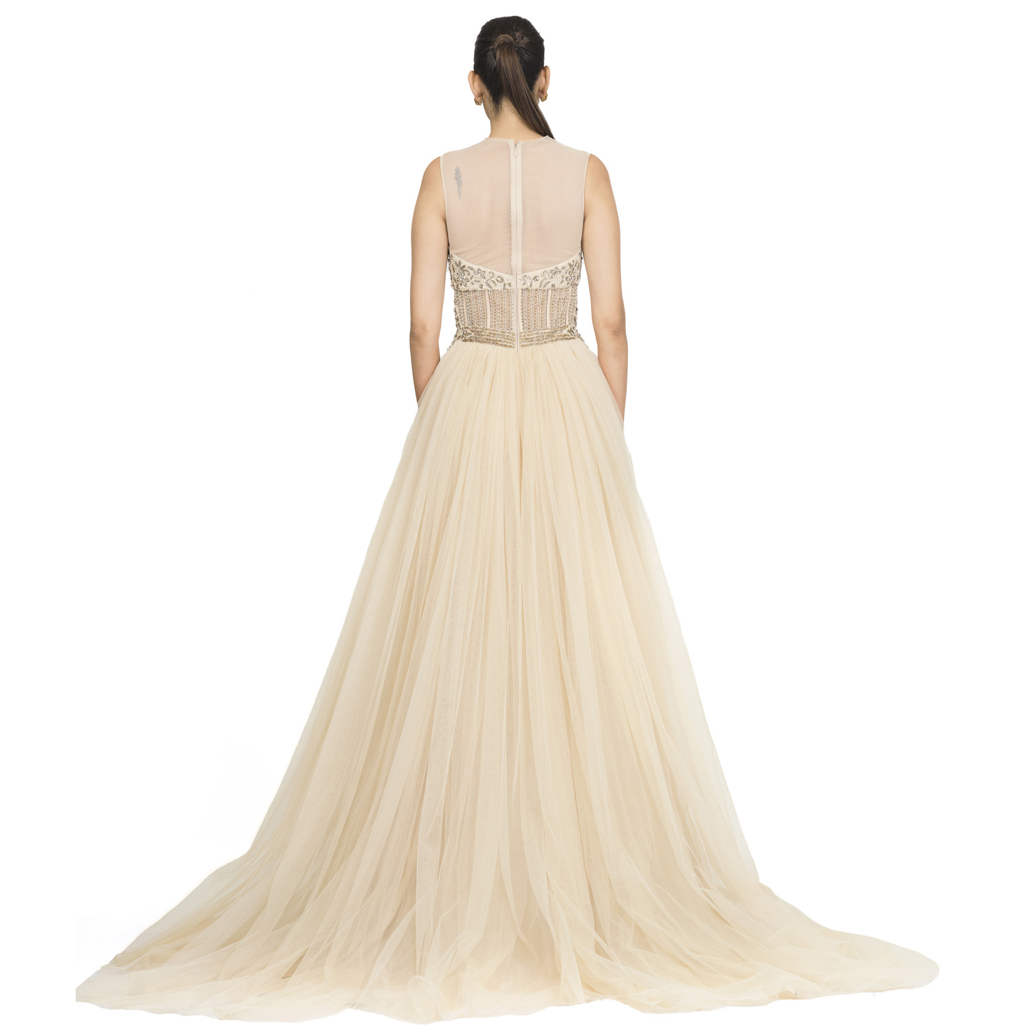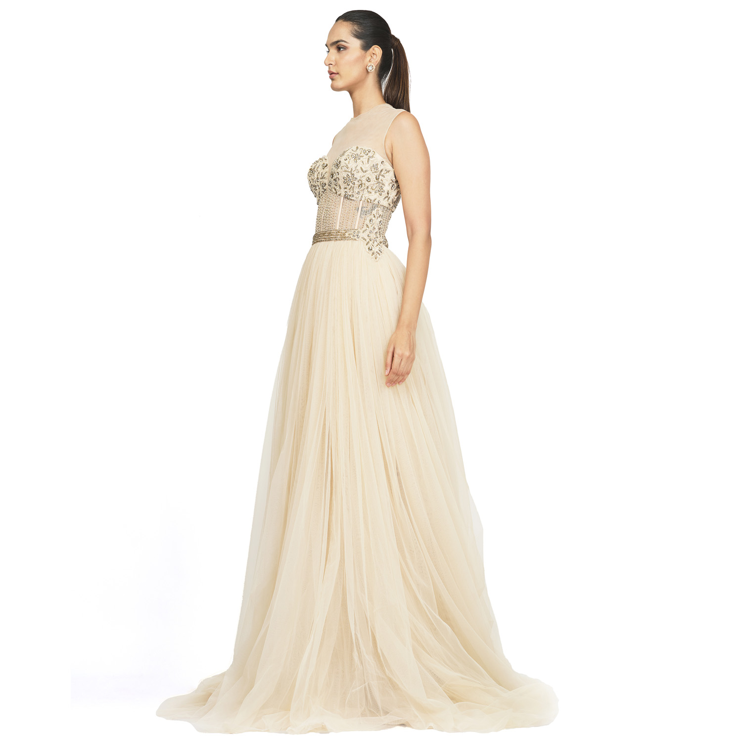 Crafted from high-quality tulle fabric, this ivory gown features intricate floral embroidery. It has a corset fit bodice, embroidered waistband and a free flowing design, adding elegance and drama to the look. Style it with dangling earrings and sling bag for an evening event.