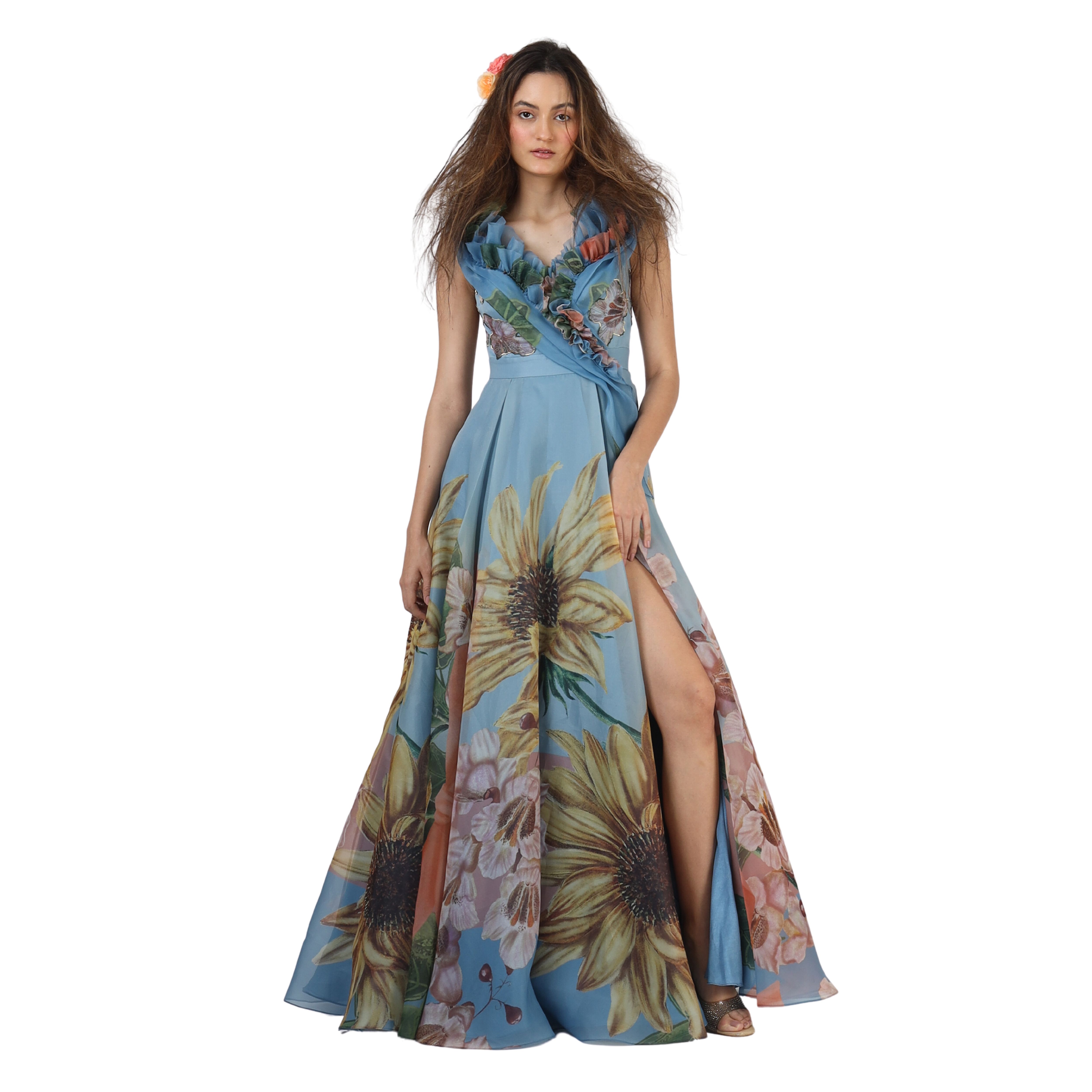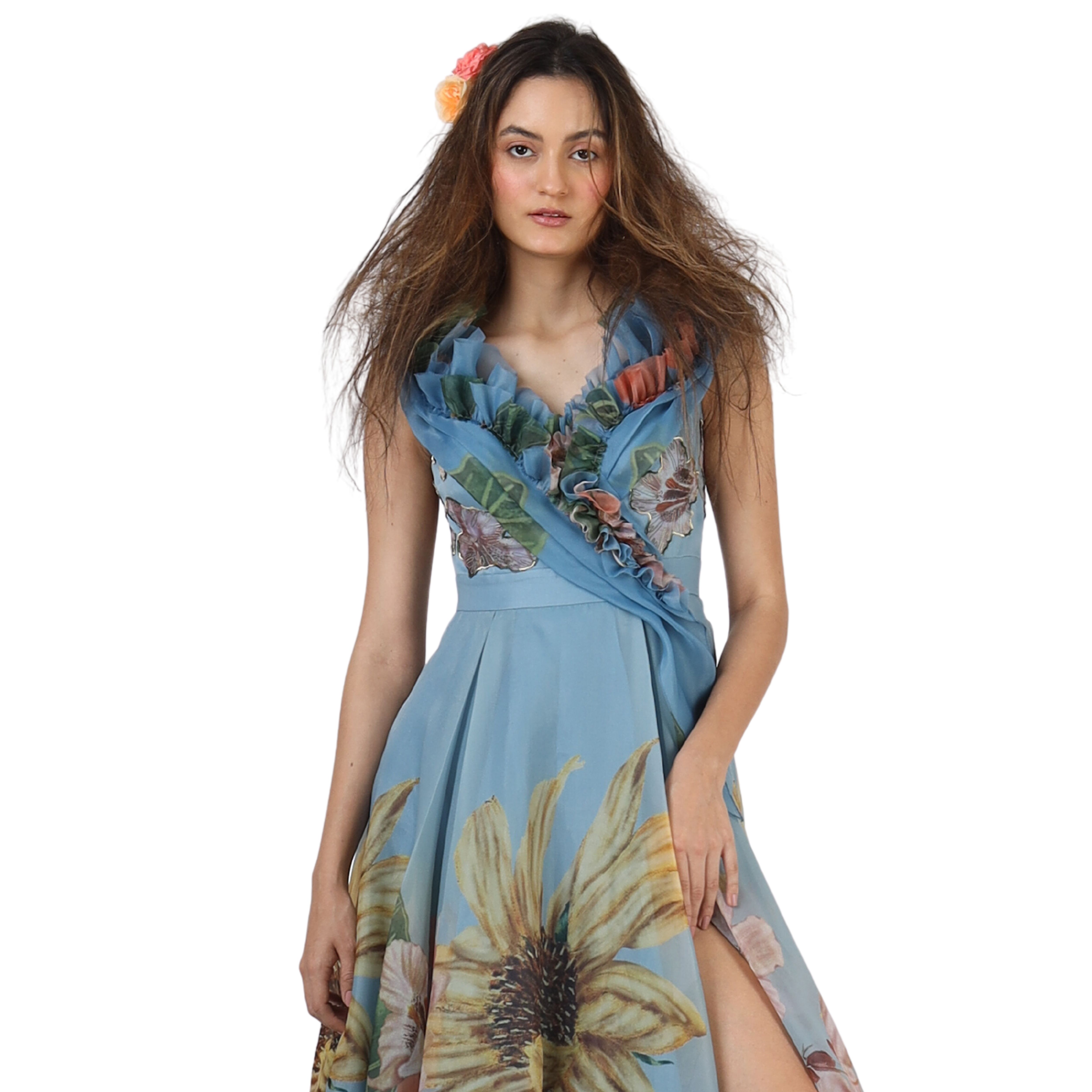 This charming floral gown features a statement ruffled neckline and a thigh high slit. This piece exudes drama and is perfect for a dressy evening. Style this statement piece with earrings and high heels for a glamorous look.