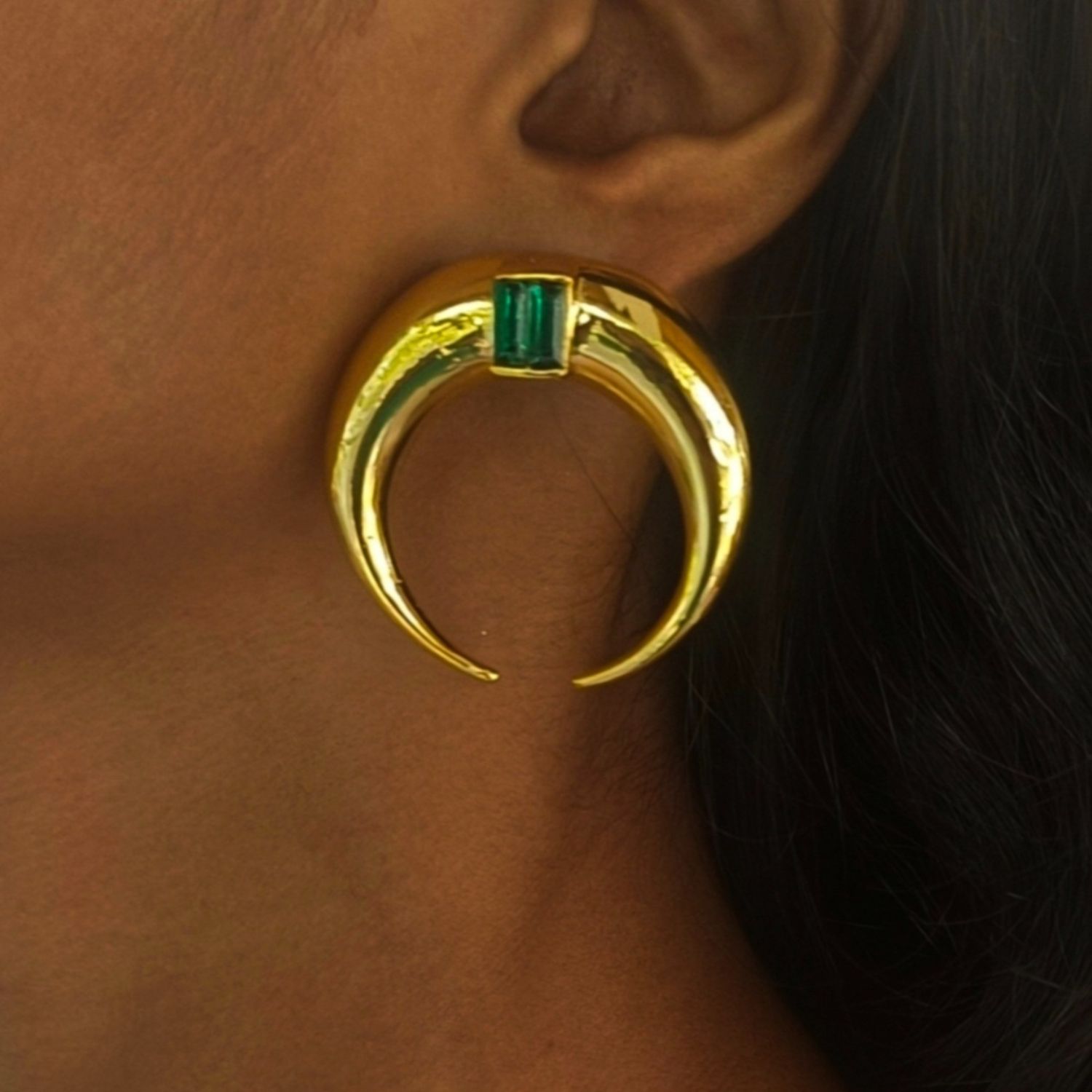 ₹ 4,800 (10% off)Make a bold statement with these stunning gold moon hoops featuring mesmerizing emerald green baguette crystals. The unique design and vibrant color create an eye-catching and glamorous look. The convenient push back closure ensures a secure and comfortable fit, making these earrings a must-have accessory for any occasion.
