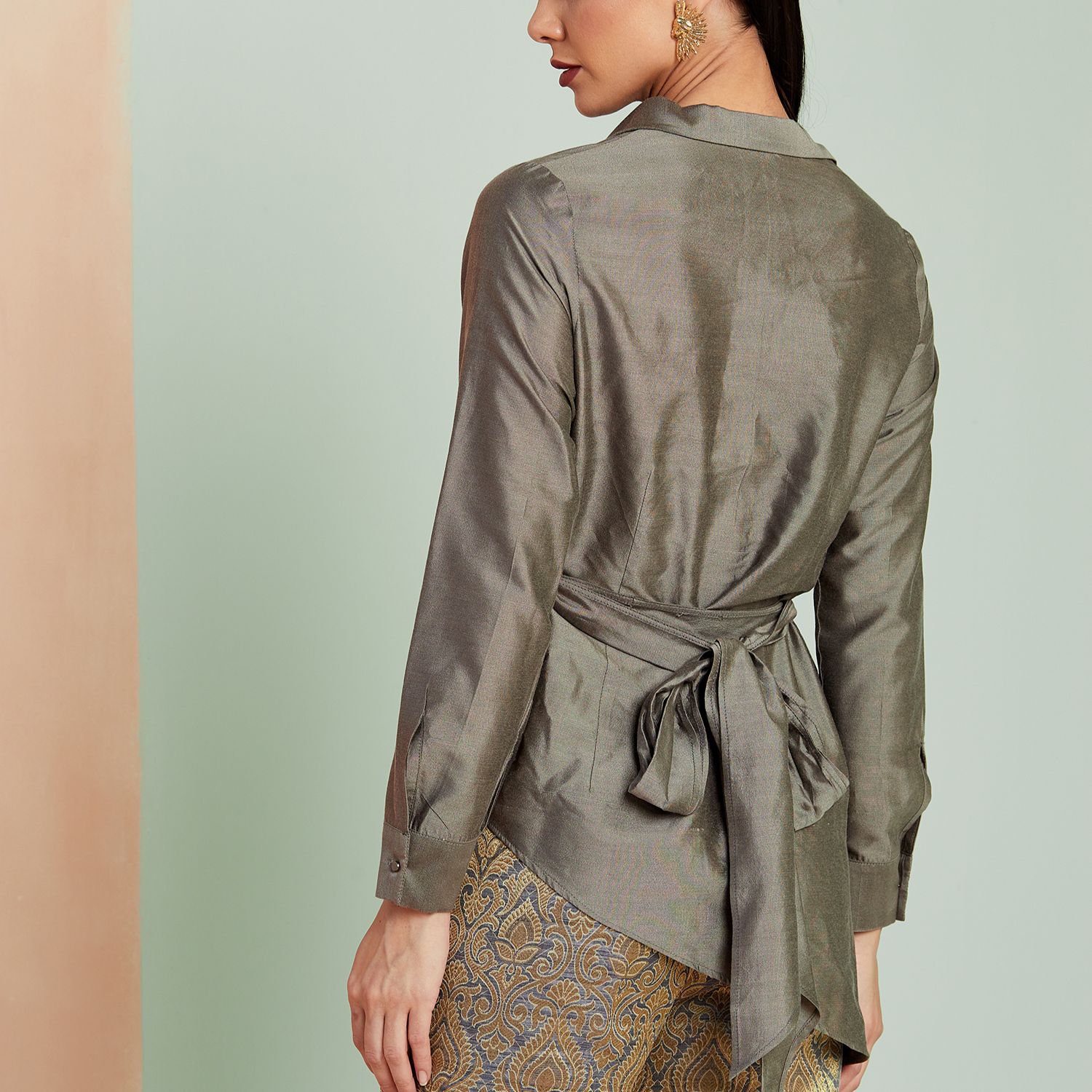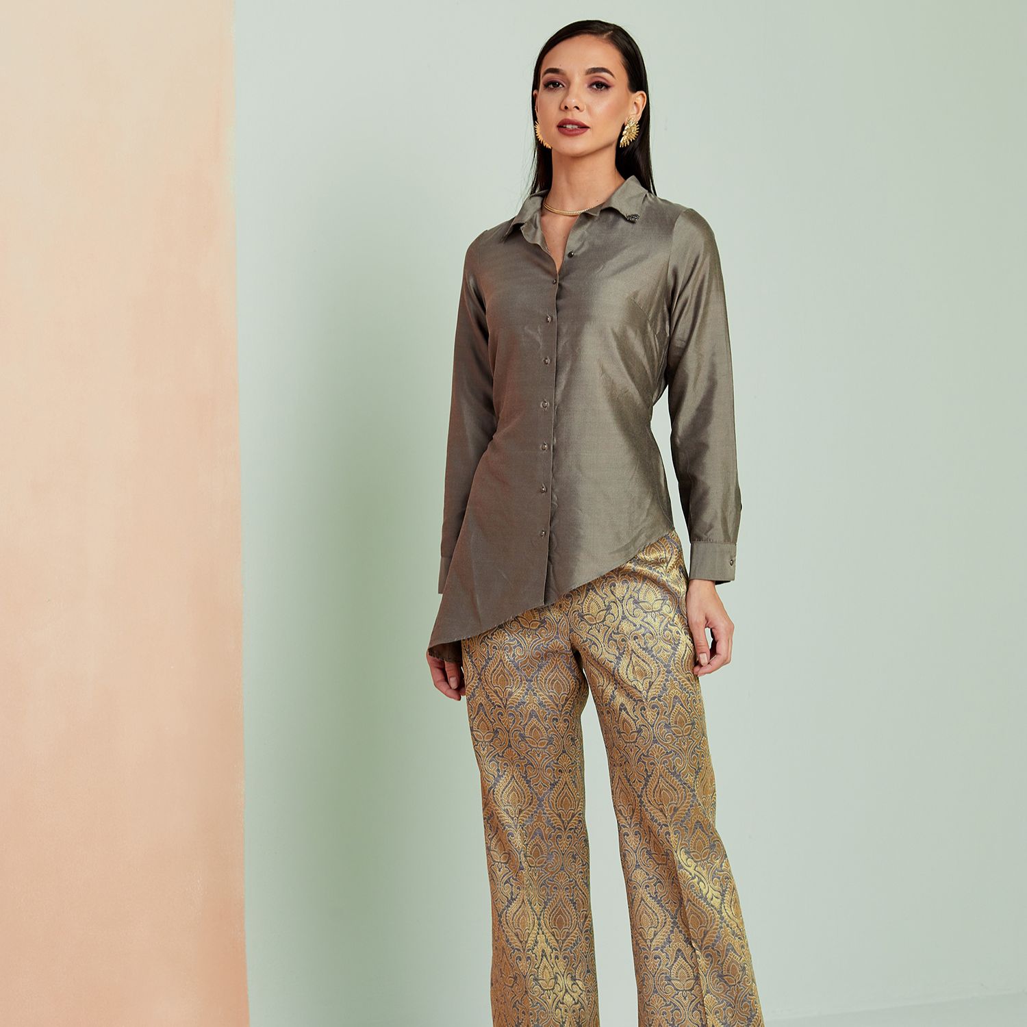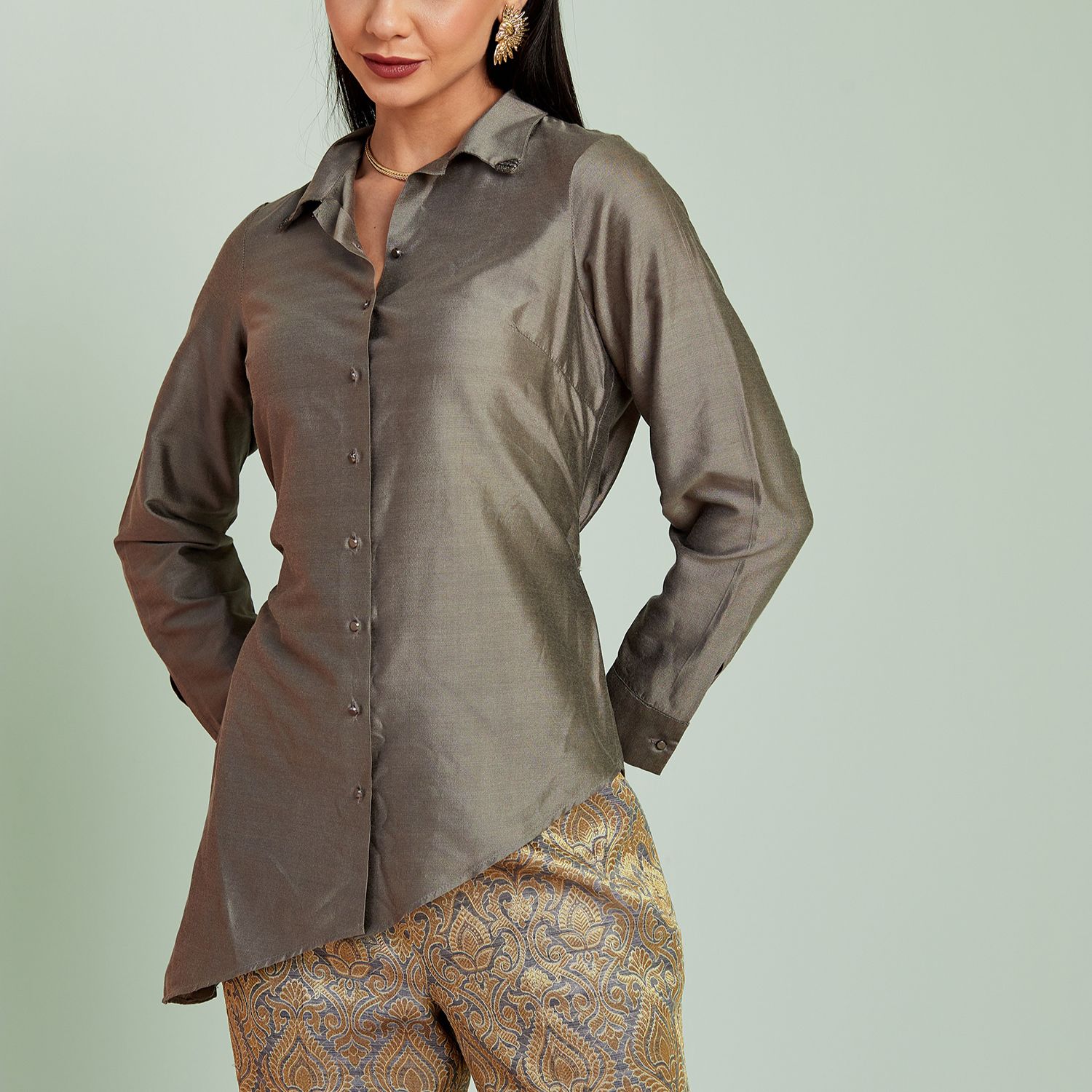 This shirt features a unique asymmetrical design that adds a touch of contemporary flair to your outfit. Crafted from a blend of cotton and silk, it offers a luxurious and soft feel against your skin. The gray color adds a sophisticated and versatile element to the shirt, allowing you to style it for various occasions. The asymmetrical hemline and modern details make this shirt a standout piece in your wardrobe.