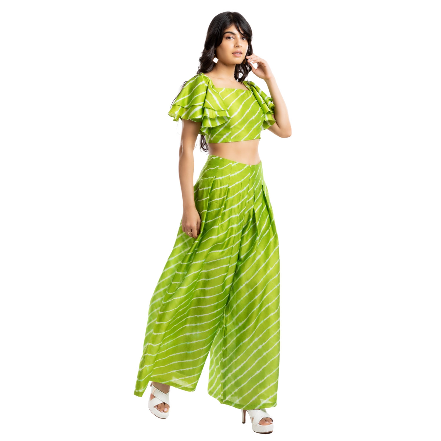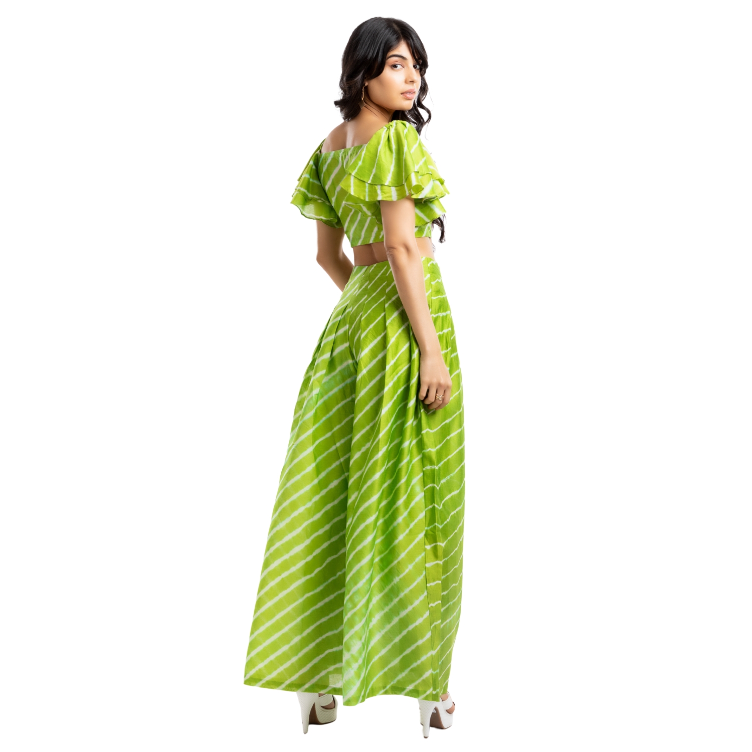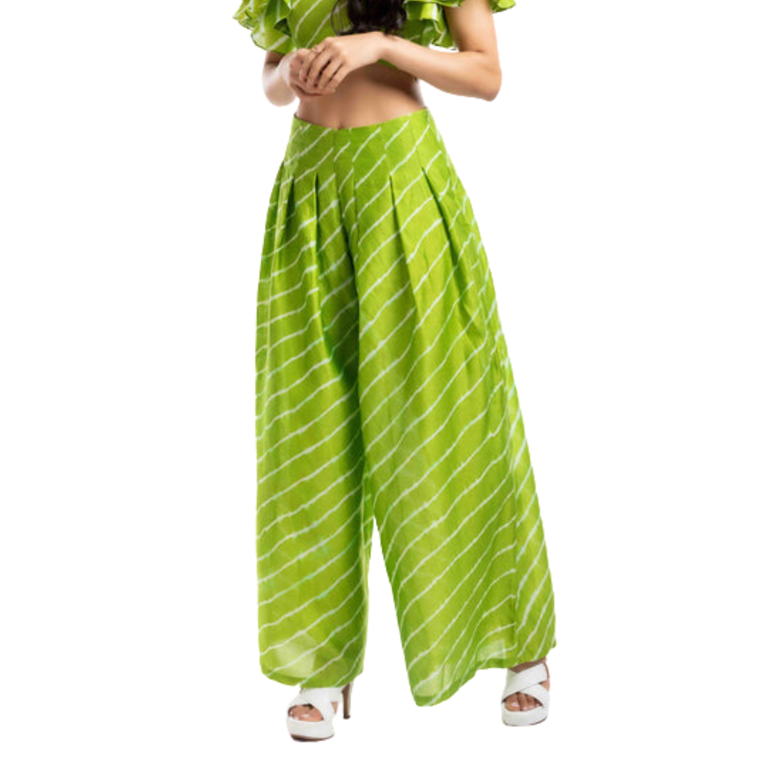 Leheriya is a traditional tie-dye technique originating from Rajasthan, India. The process involves creating beautiful, undulating patterns on fabric, resembling waves or rippling water. Artisans fold and tie the cloth before dyeing it, resulting in unique, vibrant, and colorful designs. Leheriya patterns are commonly used in sarees, scarves, and other traditional Indian clothing, celebrating the region's rich cultural heritage.