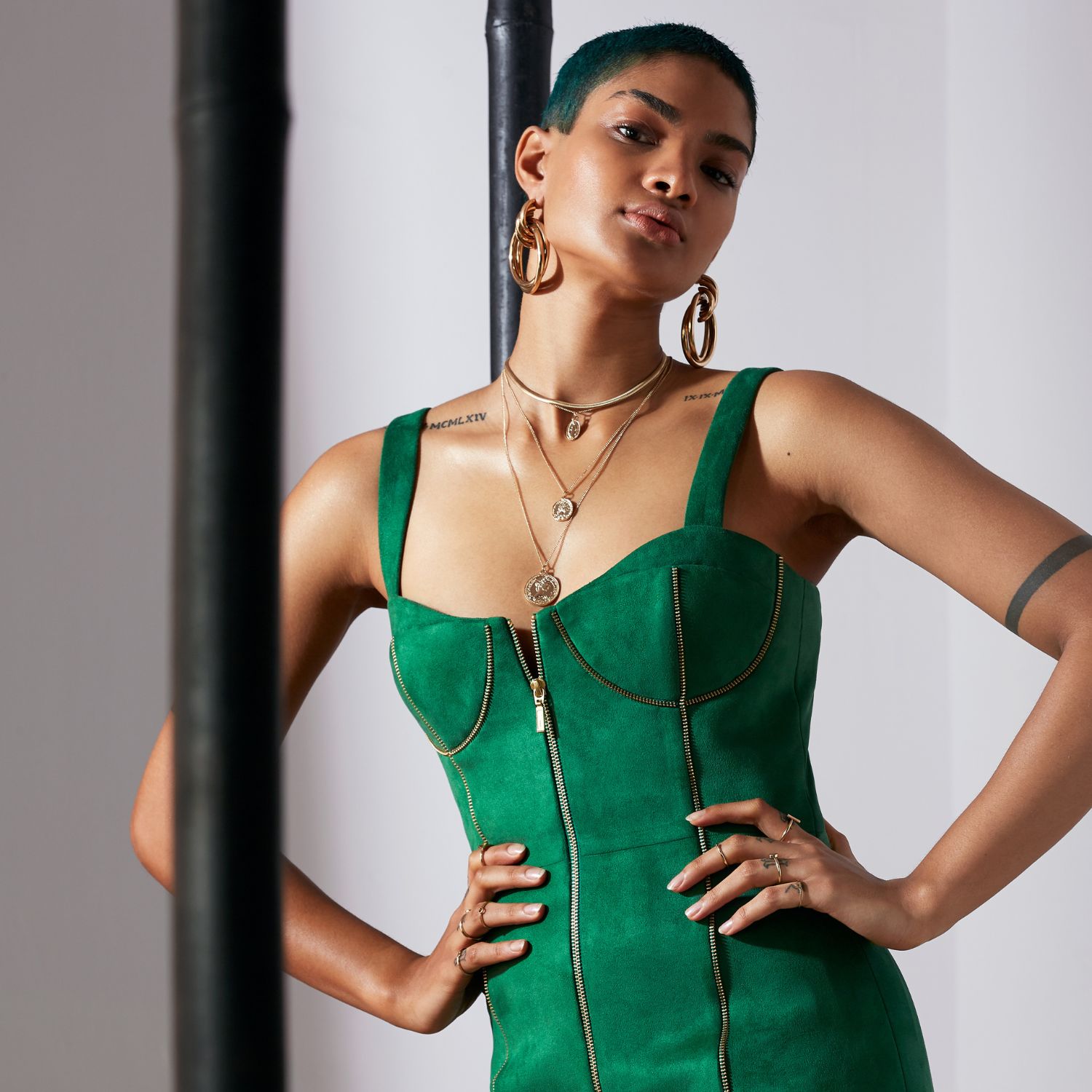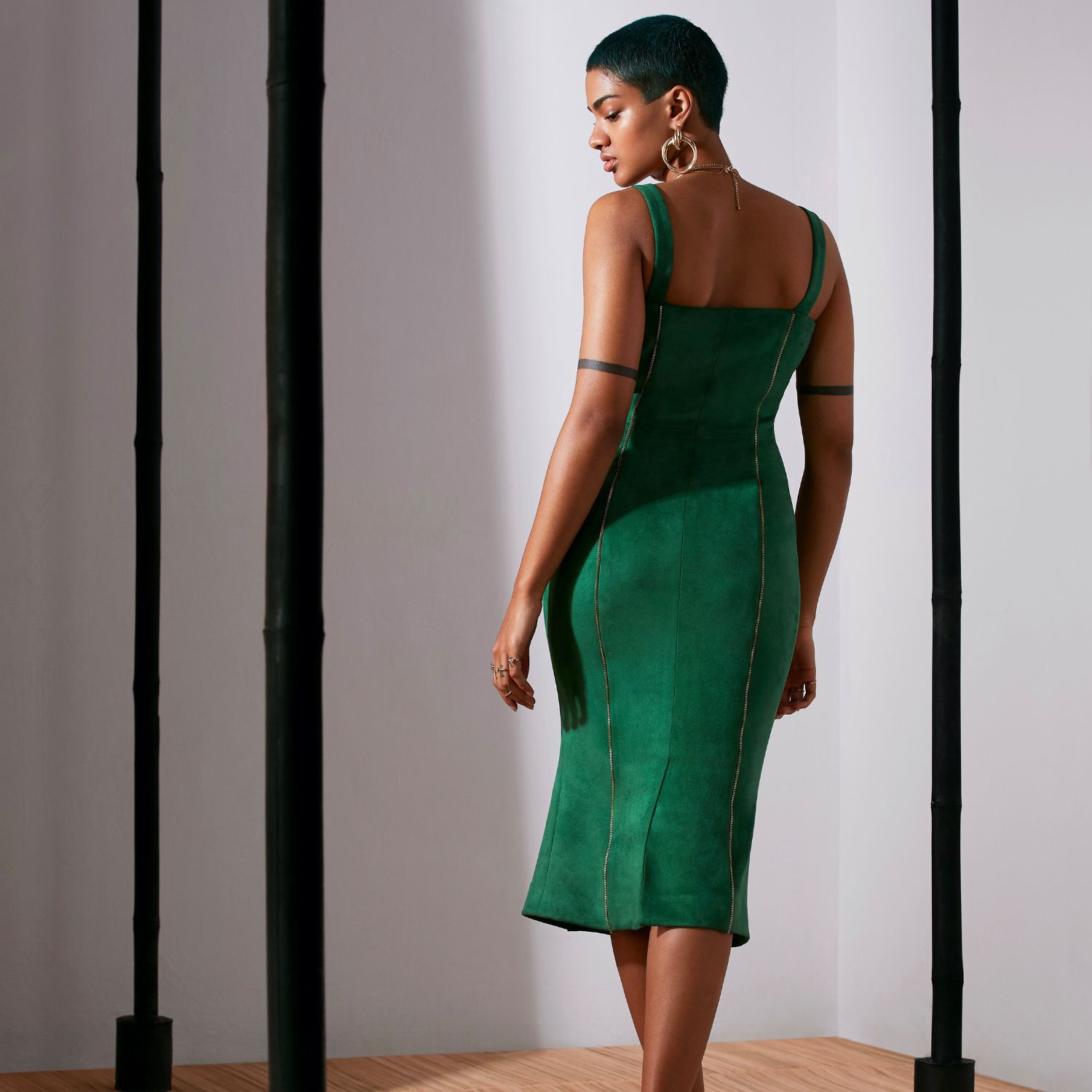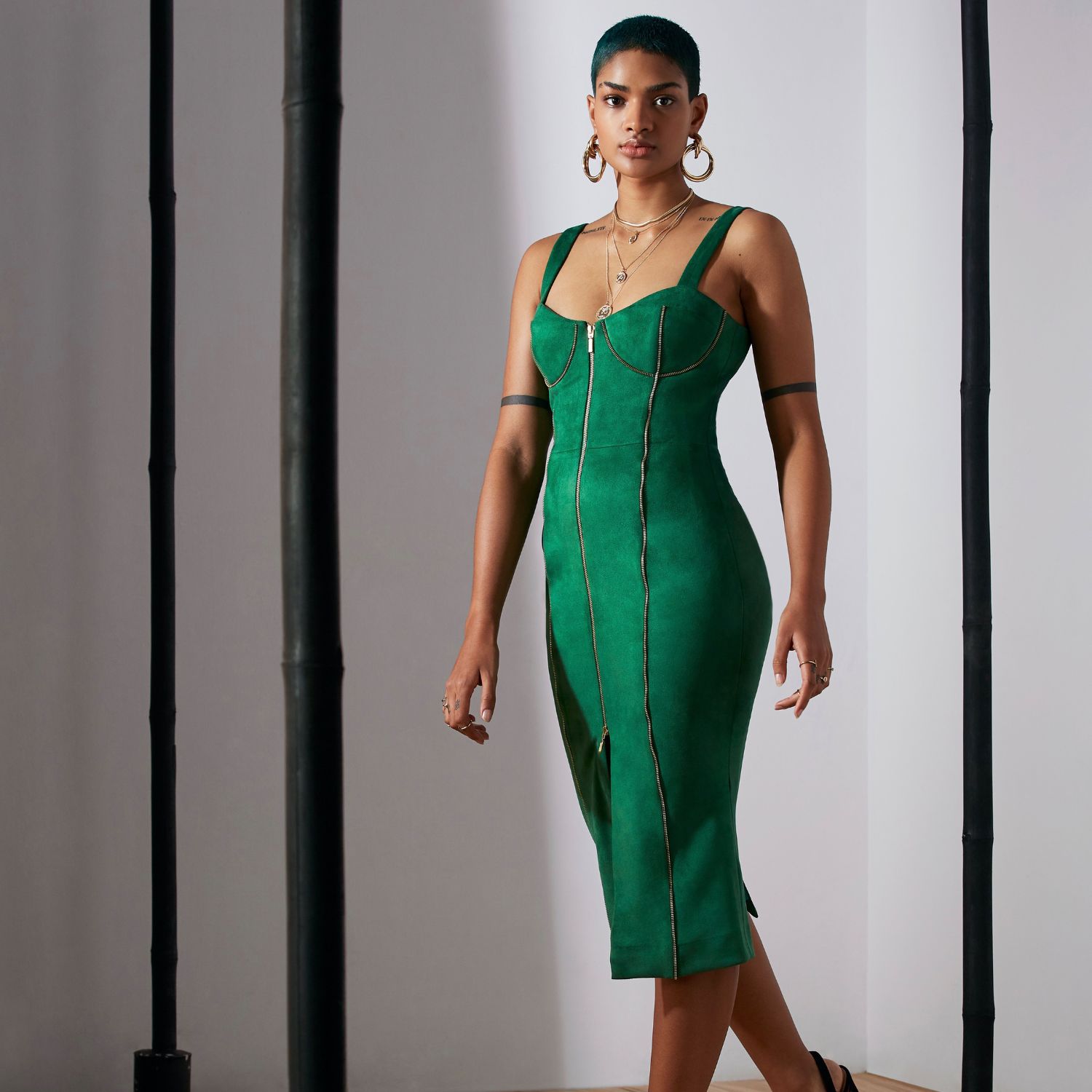 This emerald green bodycon dress is perfect for any event, look absolutely gorgeous in this rich green colored dress that has been combined with neoprene-suede that provides a distinct and eye-catching style.