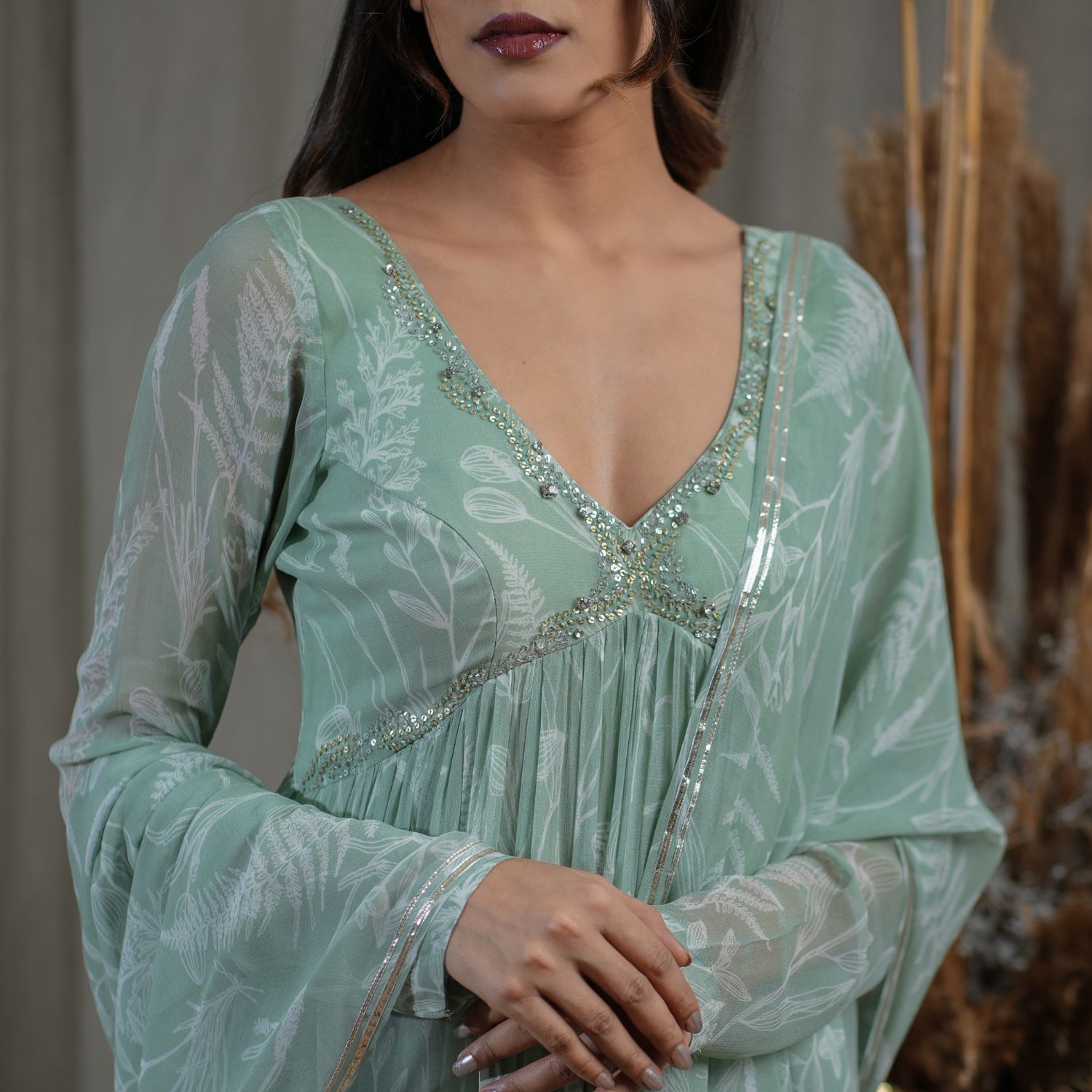 Elevate your style with this green v neck hand-embroidered full sleeves kurta. Adorned with exquisite embroidery, this kurta exudes sophistication. Complete the look with a dupatta featuring borders and tassels, adding a touch of elegance. Paired with full-length flared pants with borders, this ensemble promises a chic and graceful appearance. Embrace the fusion of tradition and contemporary fashion effortlessly.