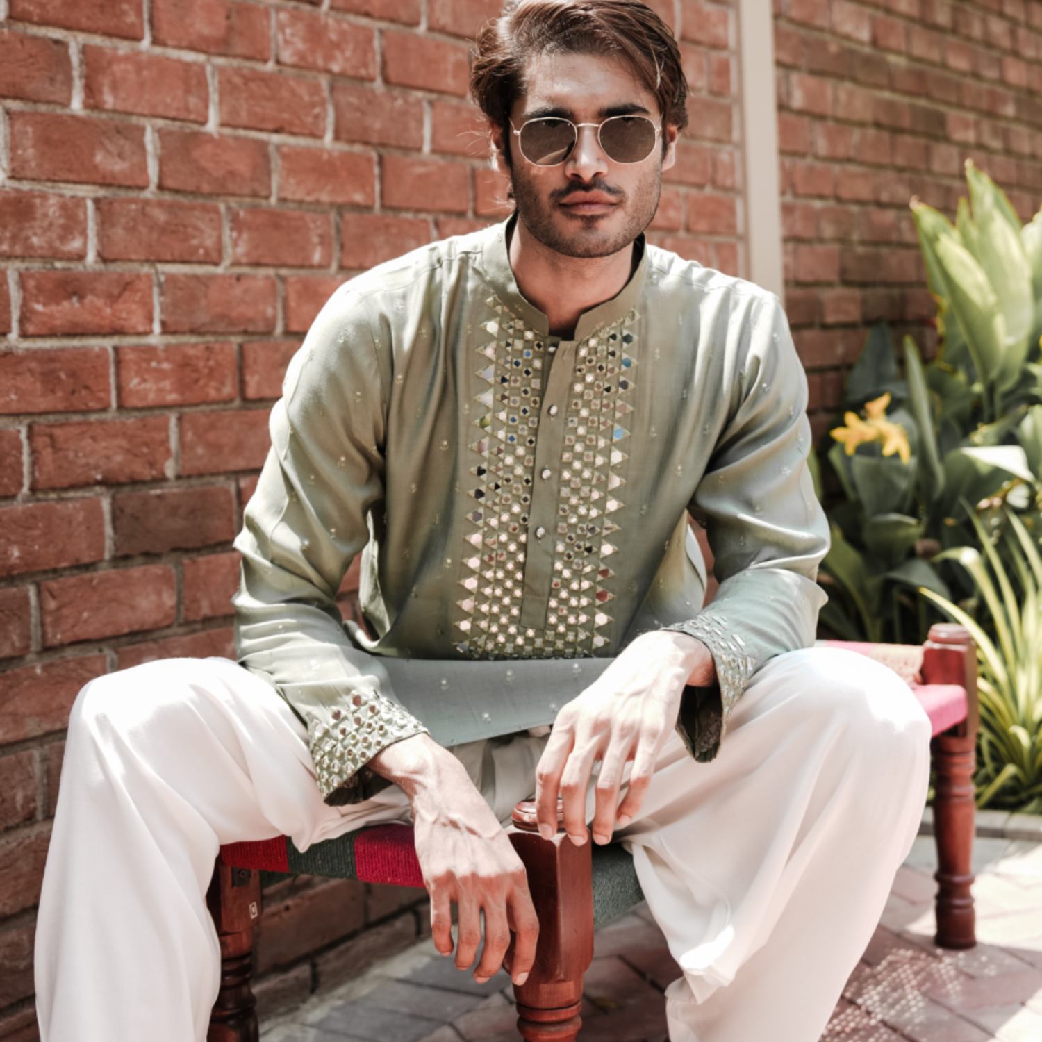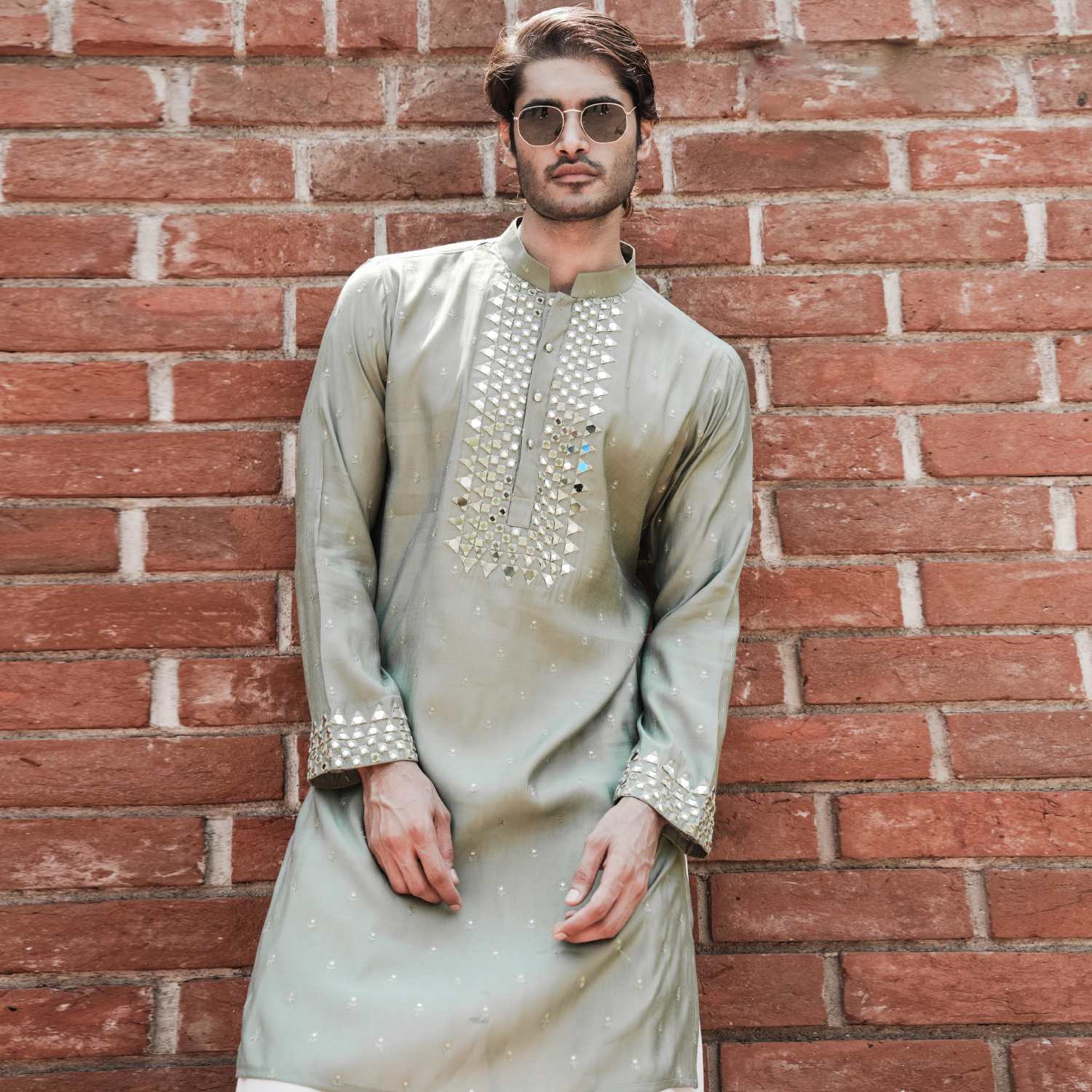₹ 24,975 (5% off)Crafted from luxurious cotton silk with a comfortable cotton lining, this set comes in a beautiful green shade. It includes a vibrant green kurta adorned with intricate mirror work, featuring full sleeves for a classic look. Paired with a crisp white salwar, it creates a beautiful contrast. Style it with minimal accessories and formal shoes for a dressy evening glam.