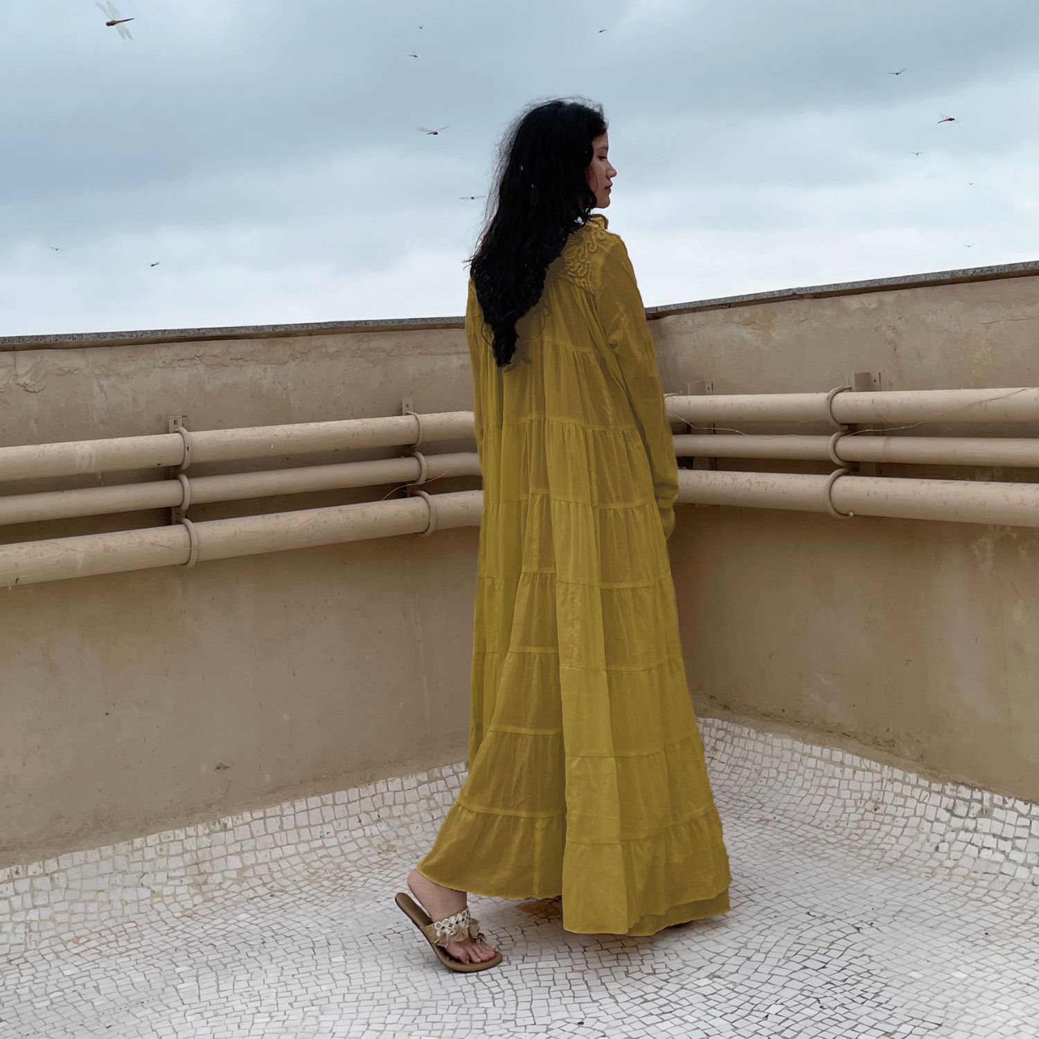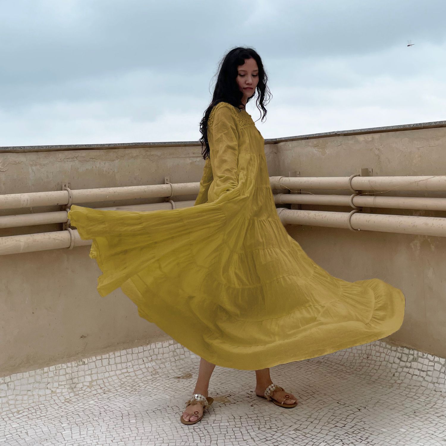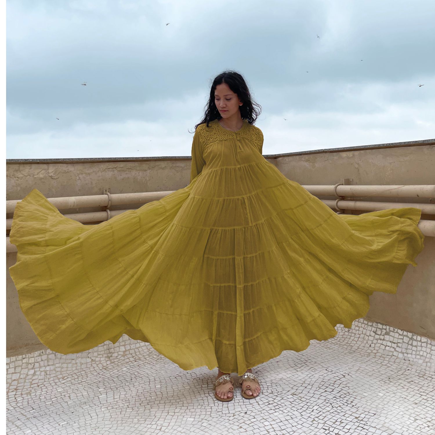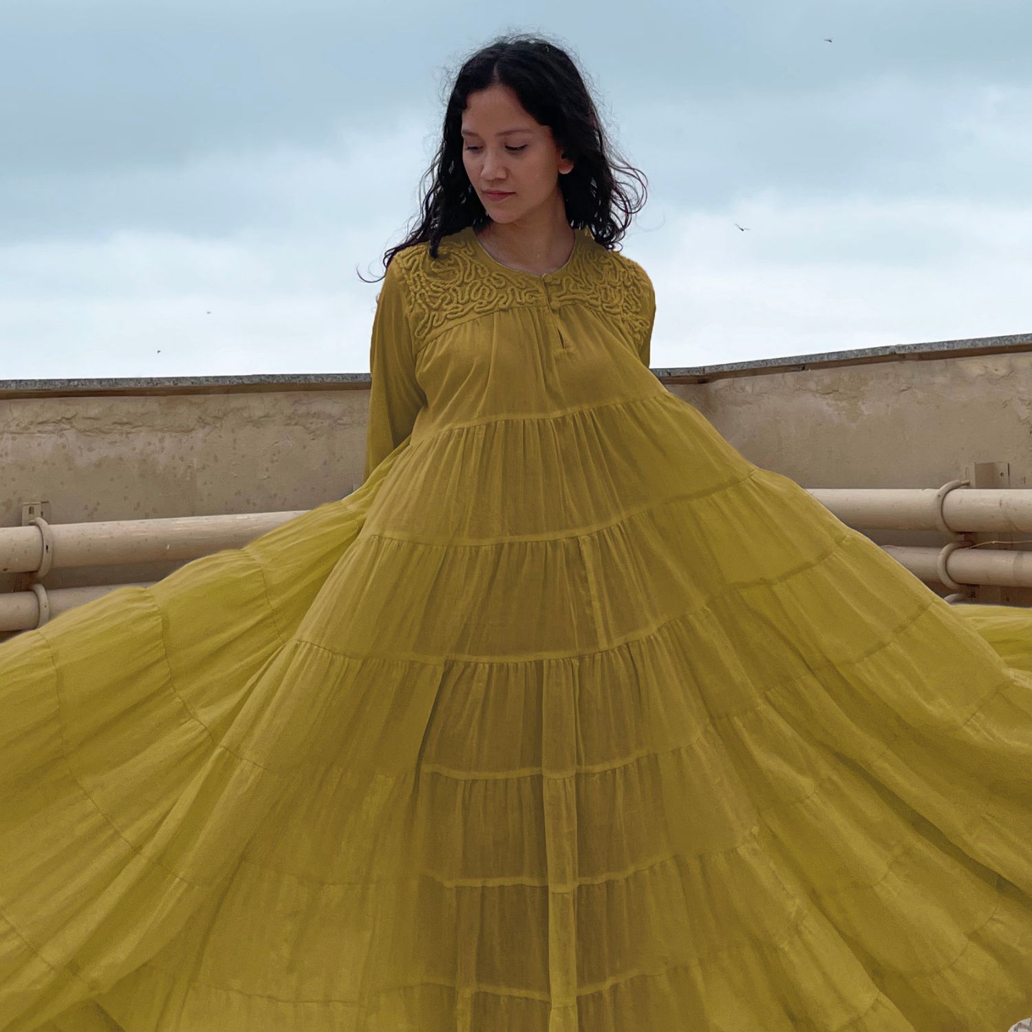 Indulge in opulent charm with our mustard voluminous tiered chudi sleeves dress. Adorned with intricate couching embroidery on the yoke, this dress effortlessly combines elegance and flair. With its voluminous tiered sleeves, it's a timeless piece that exudes grace and sophistication.