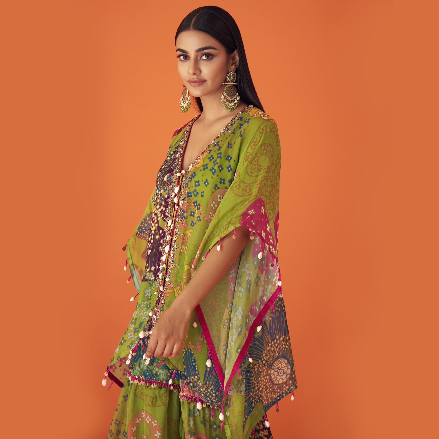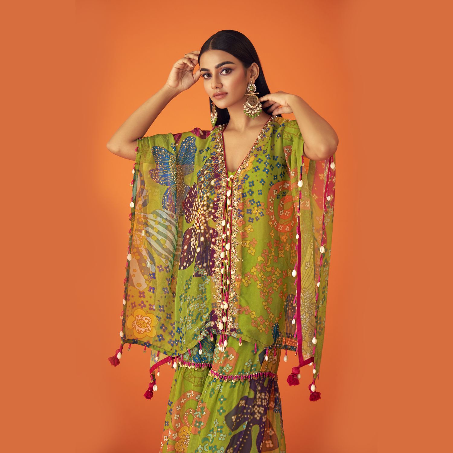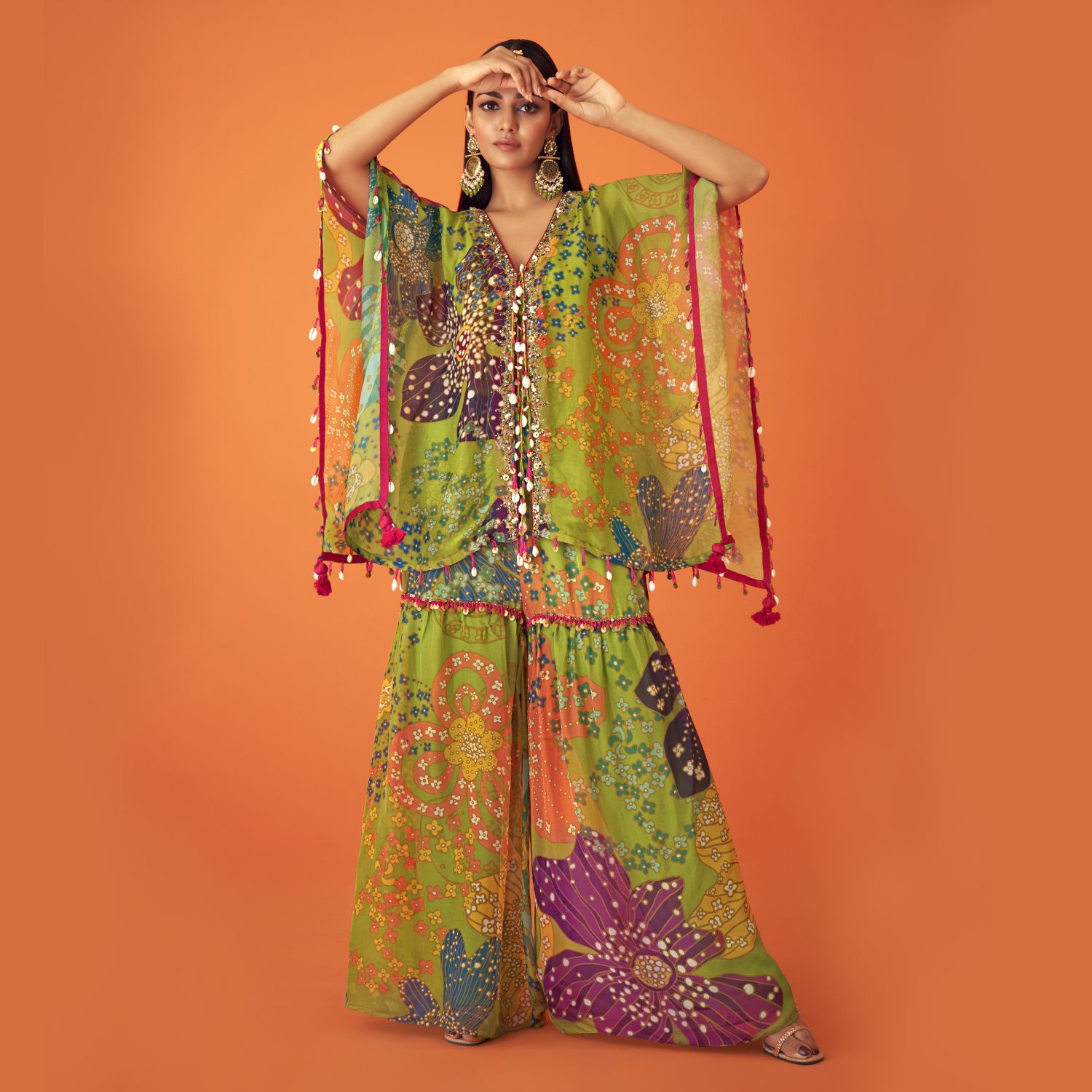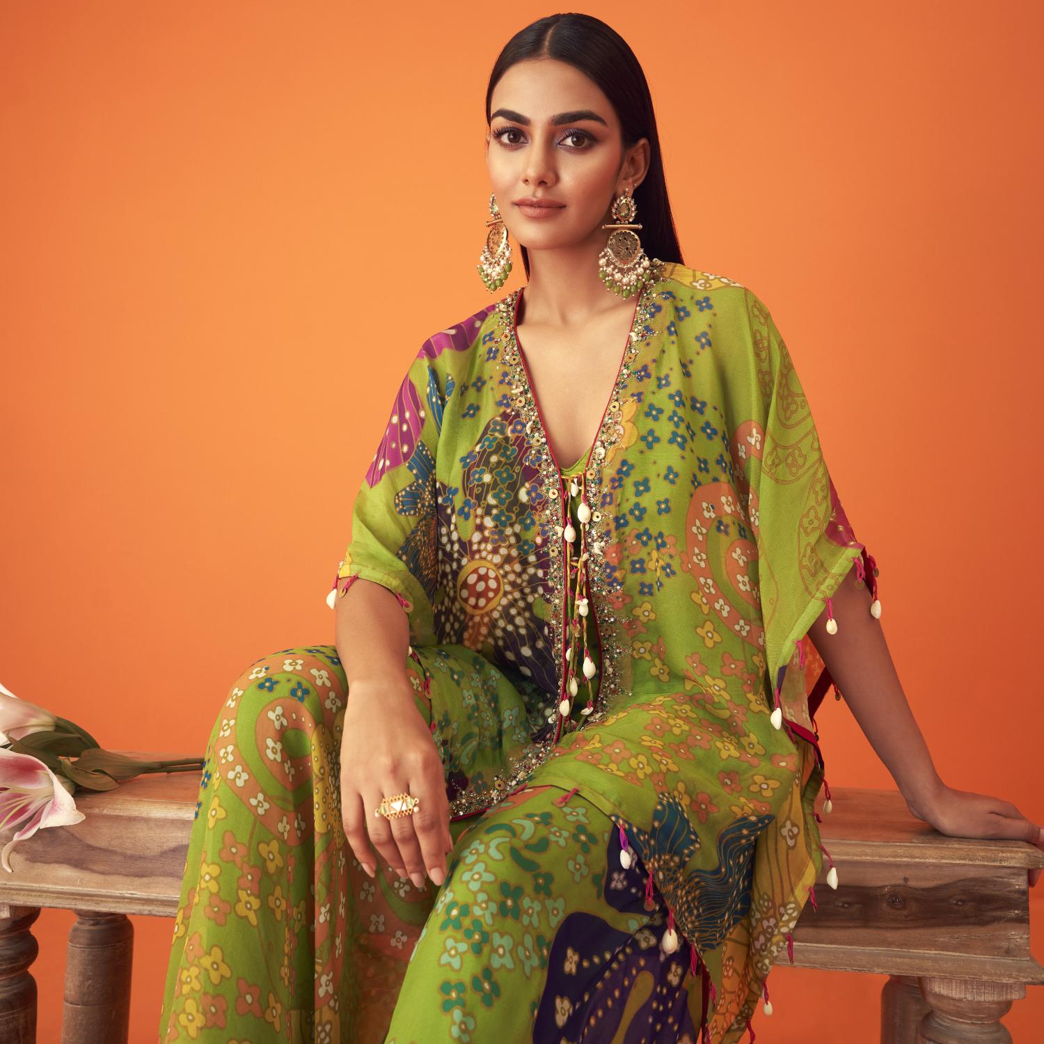 Crafted from luxurious tissue organza fabric, this set includes a green flared kaftan, an inner bustier, and sharara pants. The kaftan is adorned with a floral print and crystal embellishments lined with cowrie shells, giving it a unique and festive look. It features an open kaftan style with a draped bodice and tasselled detail, adding playfulness to the outfit. Style it with statement earrings and heels for weddings or festivities.
