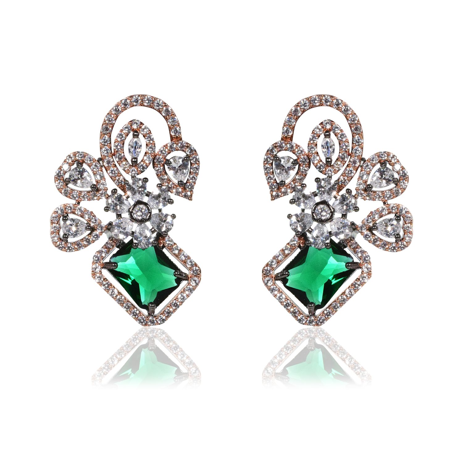 ₹ 2,500 (10% off)Meet Tizora's stunning mixed metal base earrings, featuring a rose gold-plated finish and dazzling faux diamonds. The perfect complement to any outfit, the emerald-colored synthetic stone adds a pop of colour and luxury to your look.