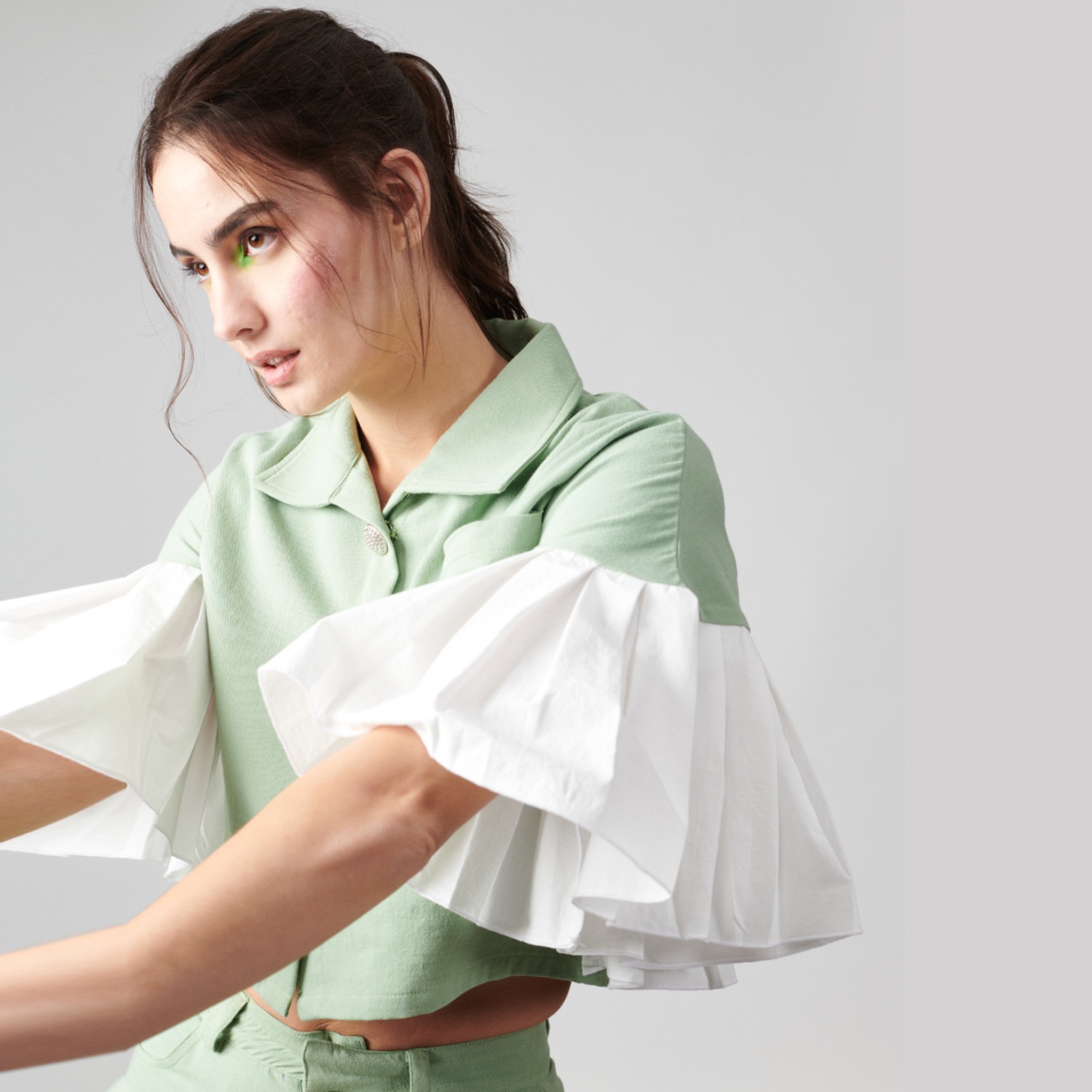 This set features a pleated poplin top that creates a voluminous silhouette in both the front and back. This green set includes boot-cut pants with a floor-length hem, which complements the dramatic top beautifully. Style it with statement earrings and a little bag for a dressy soiree.