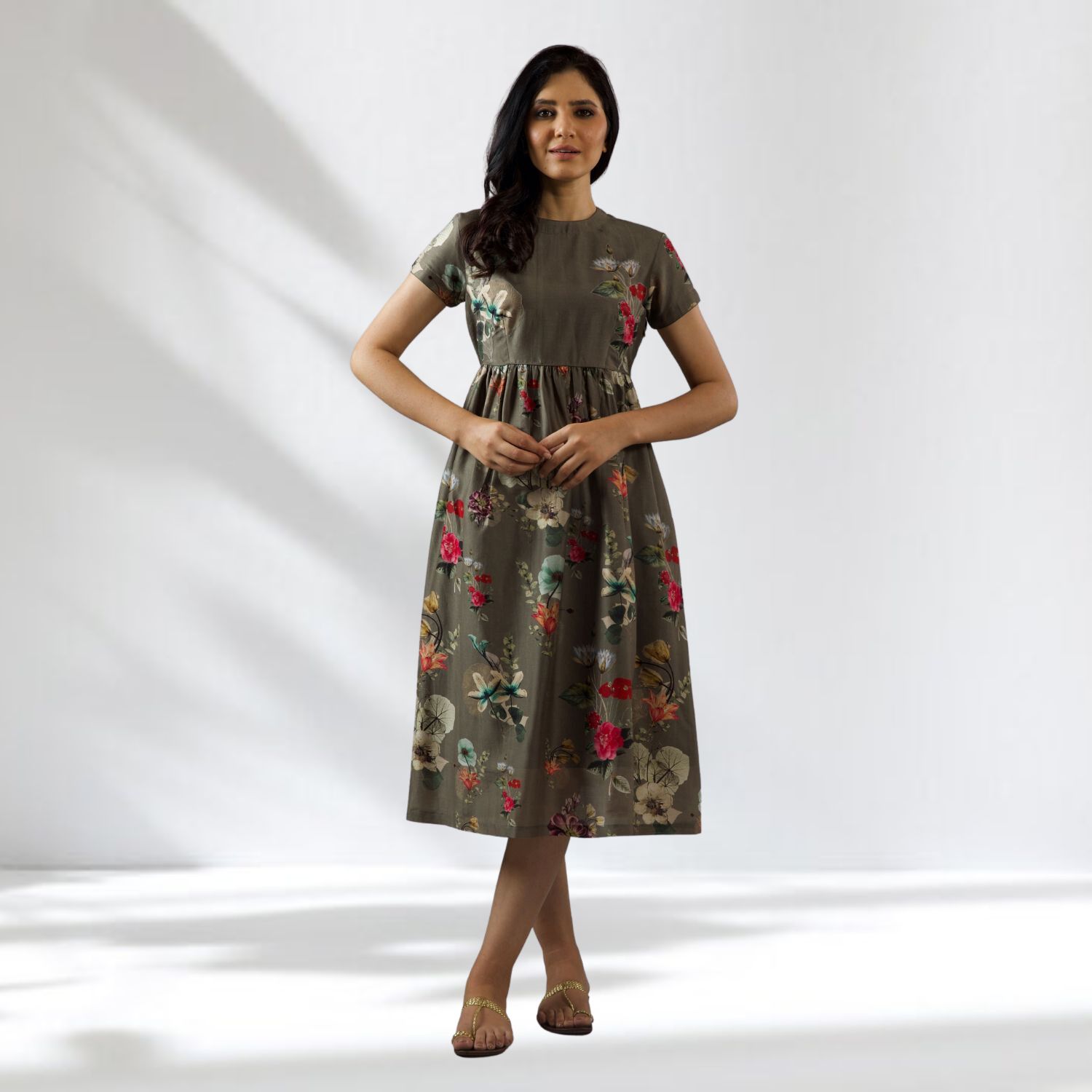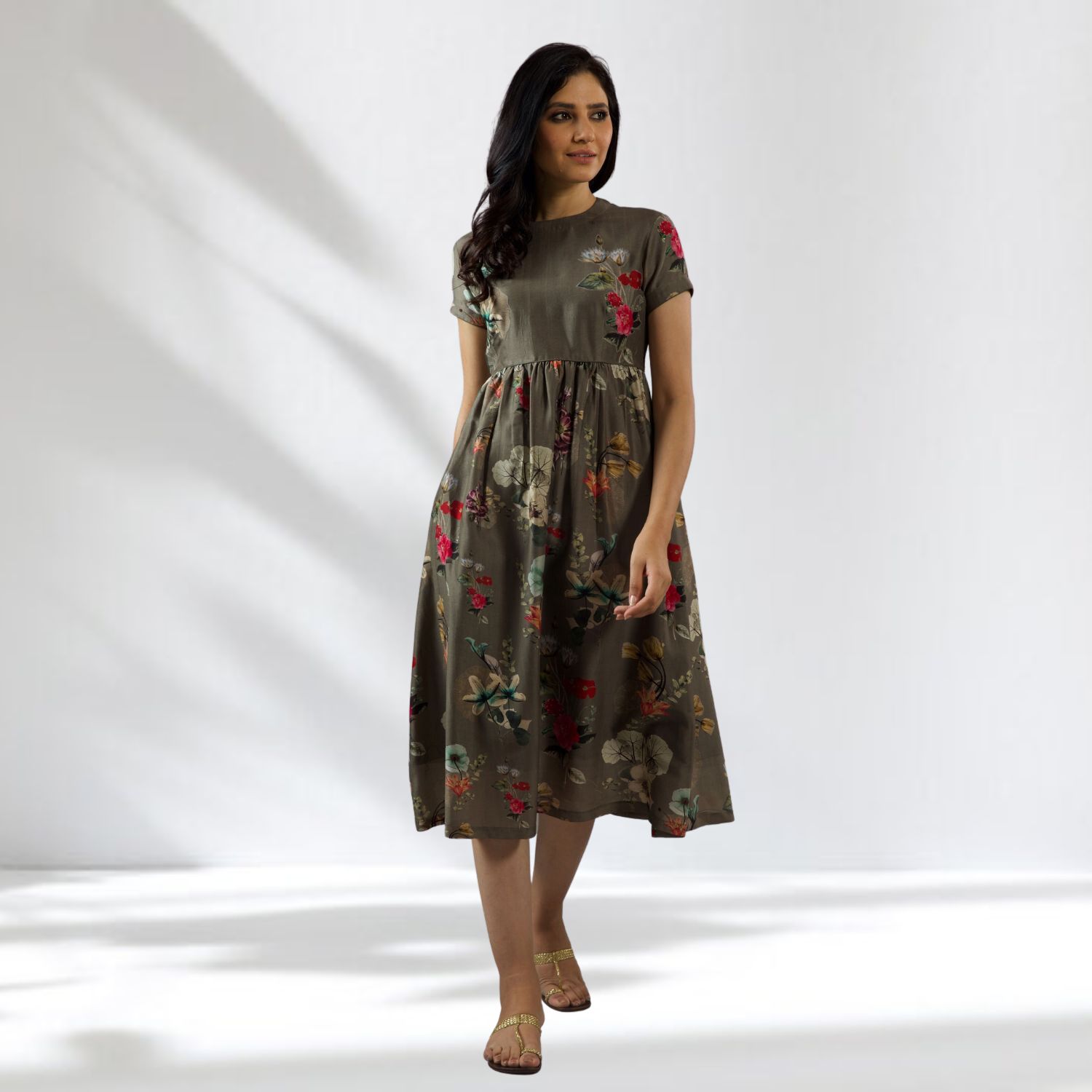 This dress features a captivating grey color, exuding sophistication and allure. The fitted silhouette accentuates the waist, creating a flattering and feminine look. Crafted from high-quality chanderi silk fabric, this dress offers a luxurious feel and a refined appearance.
