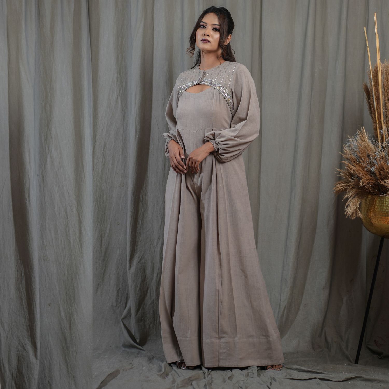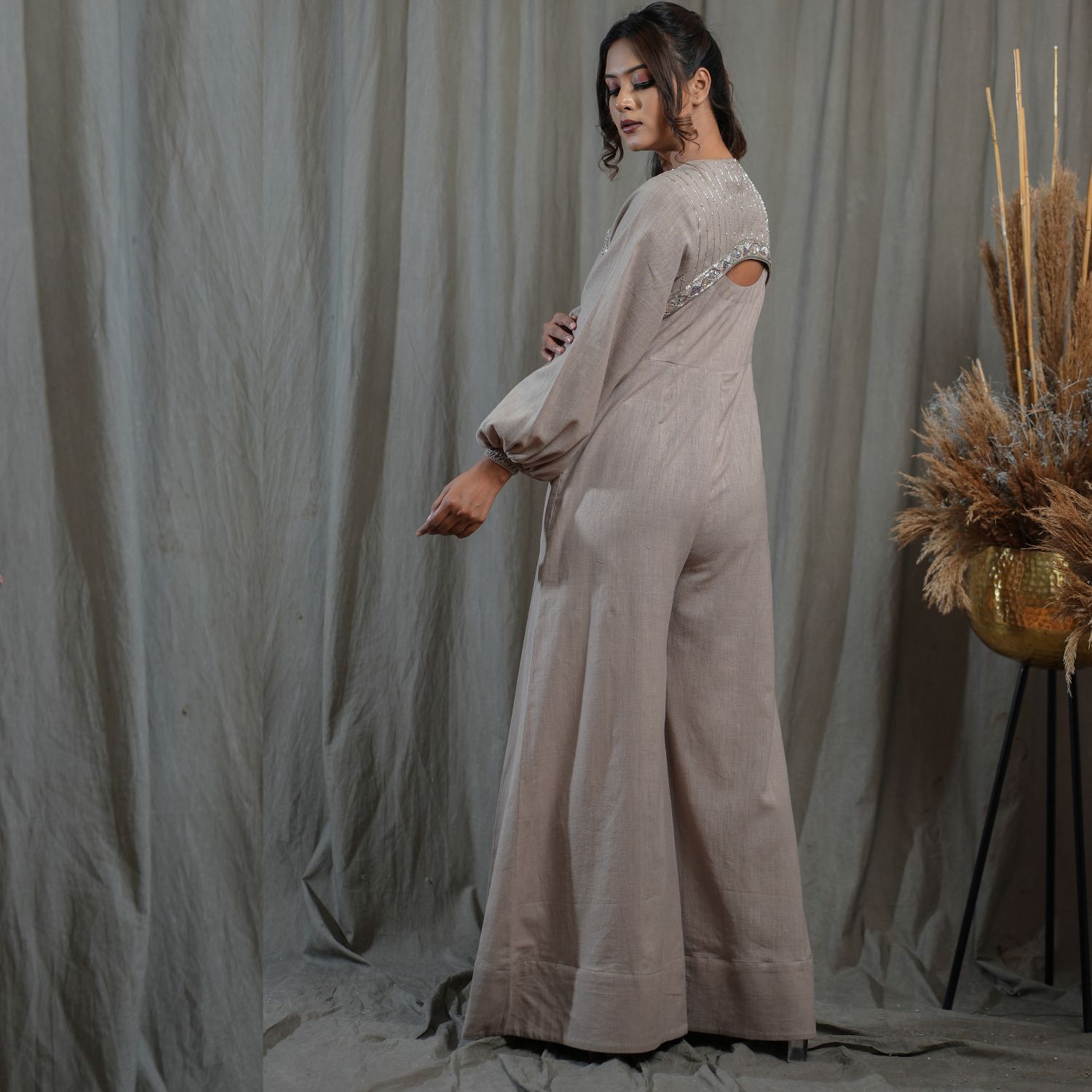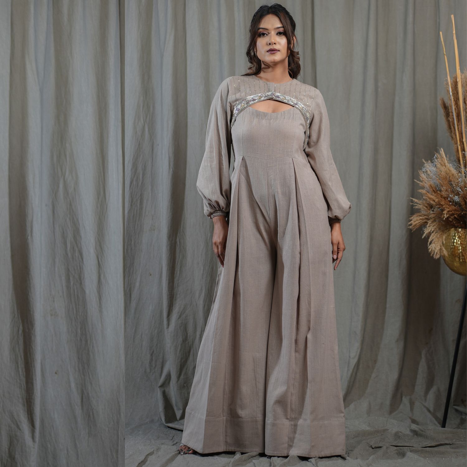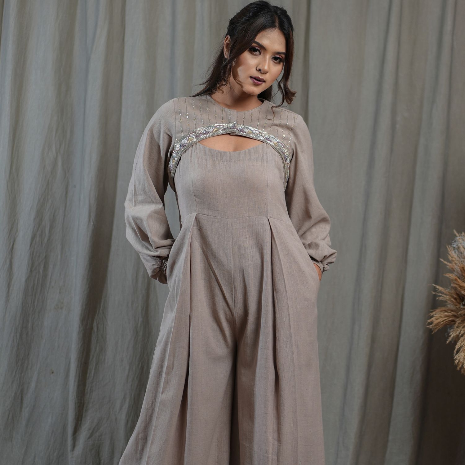 Elevate your style with this sleeveless jumpsuit, featuring a flared hem and convenient pockets for added functionality. Complete the look with a hand-embroidered cropped jacket, adding a touch of elegance and sophistication. This versatile ensemble is perfect for making a chic statement on any occasion.