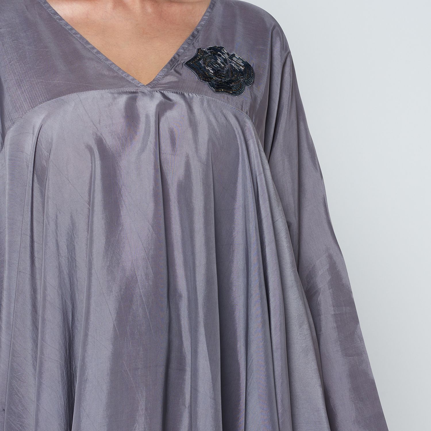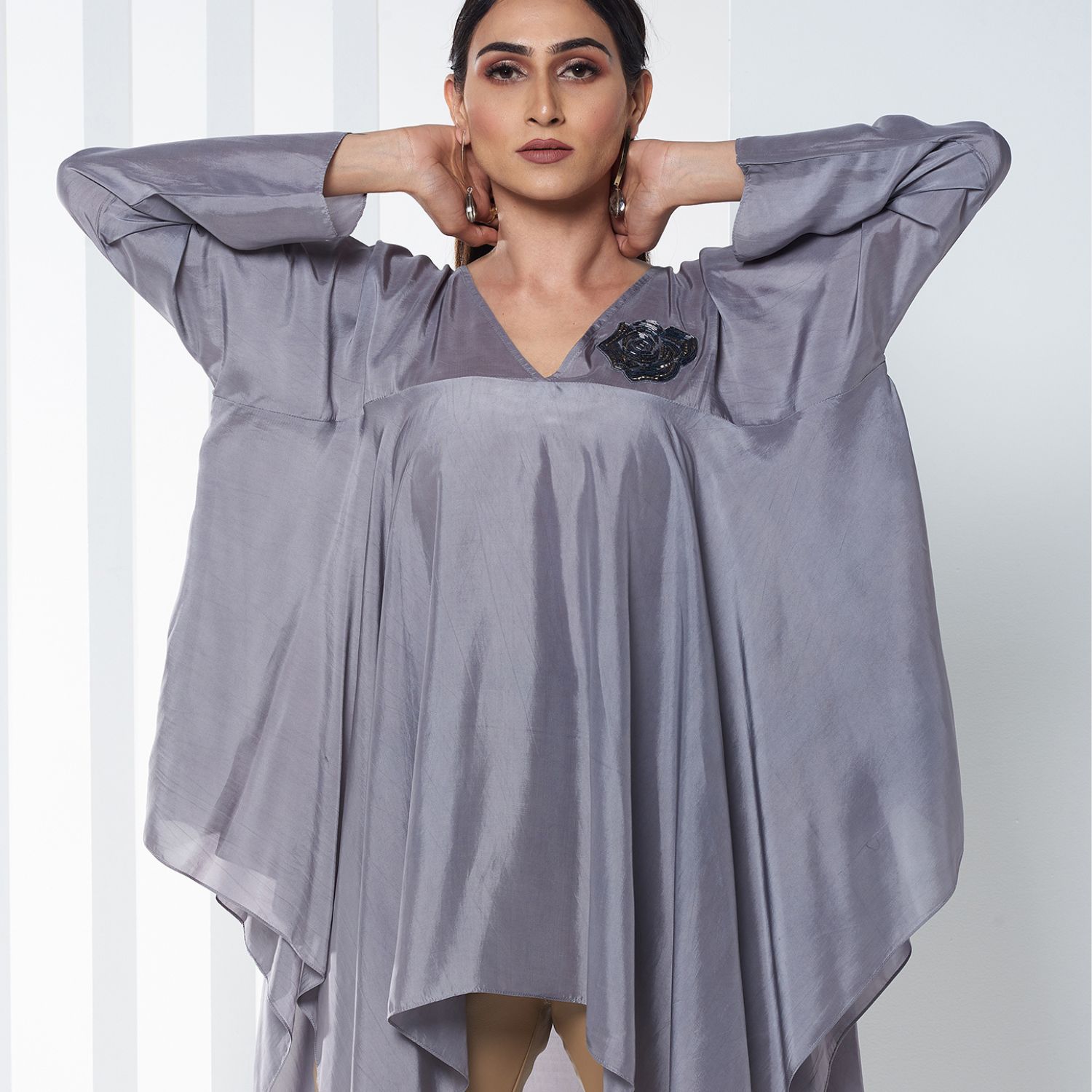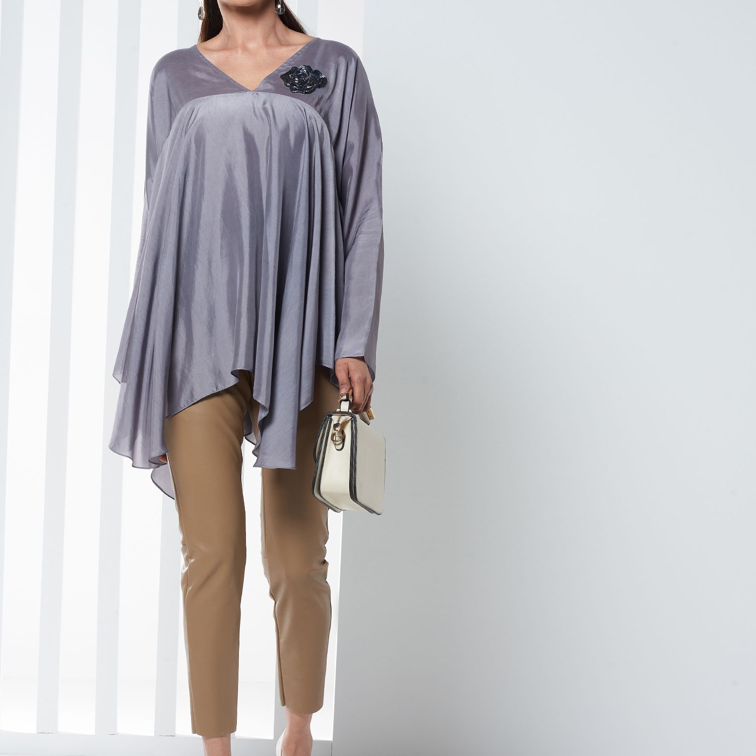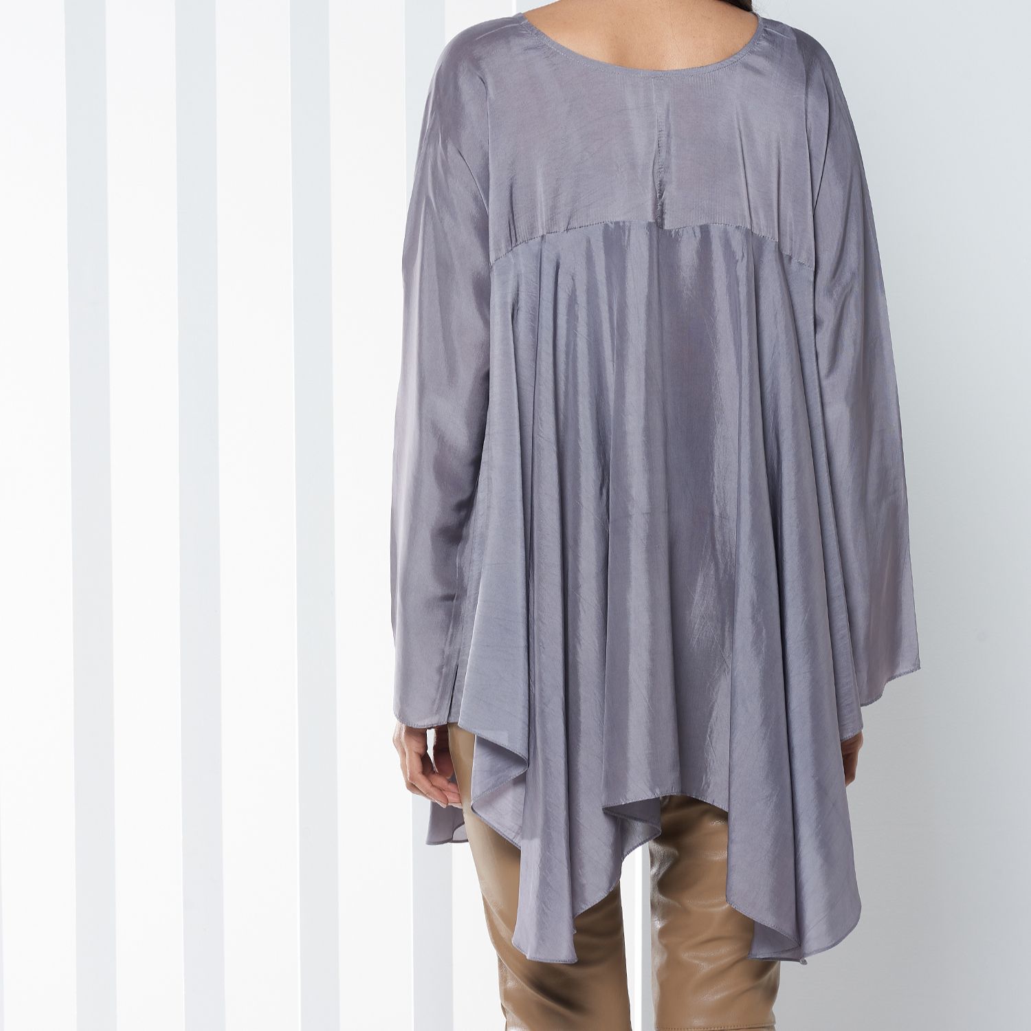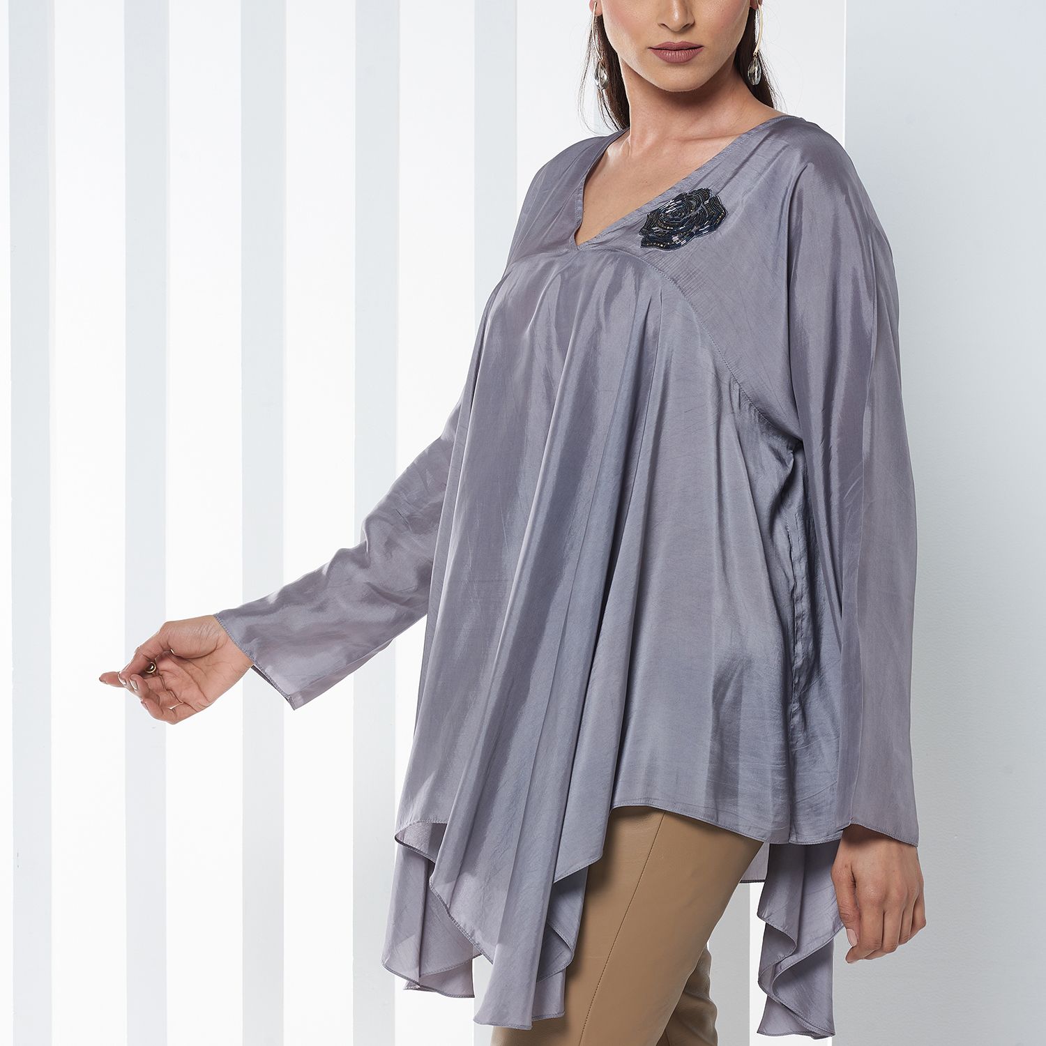 This top features a unique draped motif design, adding a touch of elegance and sophistication to your outfit. Crafted from high-quality viscose satin, it offers a smooth and luxurious texture that glides gracefully over the body. The soft grey color adds a versatile and timeless appeal, making it suitable for various occasions.