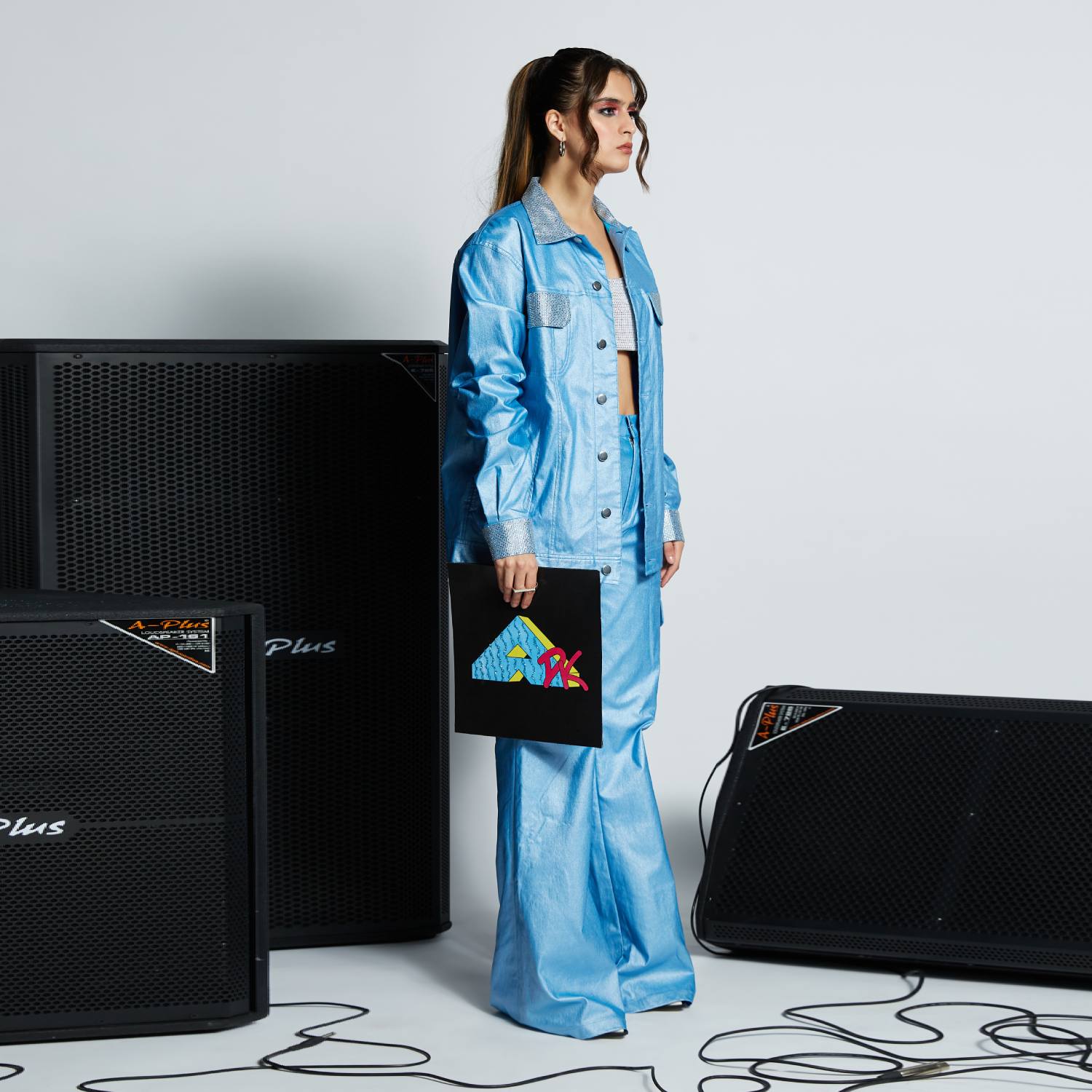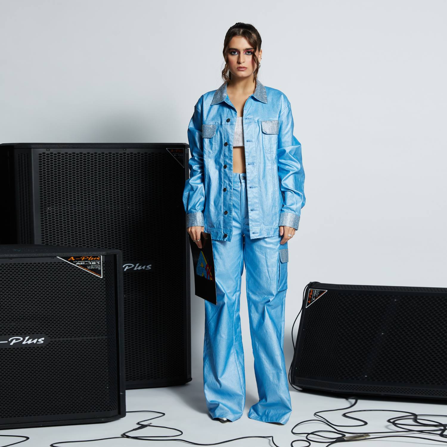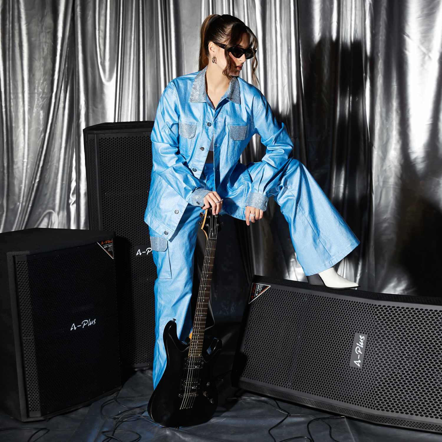 Step into the spotlight with our groovy rhinestone cargo pants. Designed with a high waist and wide legs, they enhance your curves effortlessly. The cargo pockets, adorned with hand-embellished Swarovski crystals, provide a luxurious touch. For added convenience, a front zip fly and metal button fastening ensure a secure fit while exuding confidence.