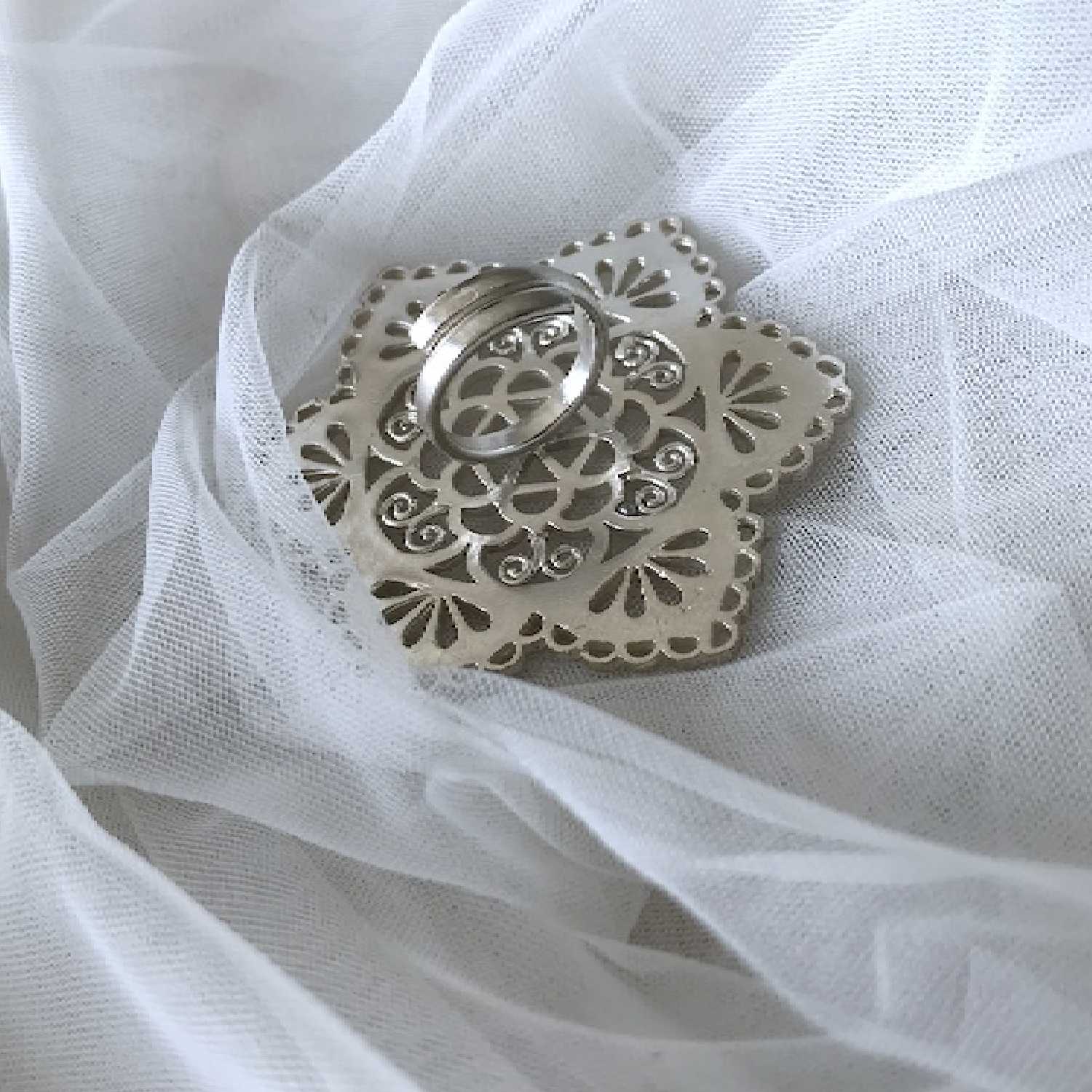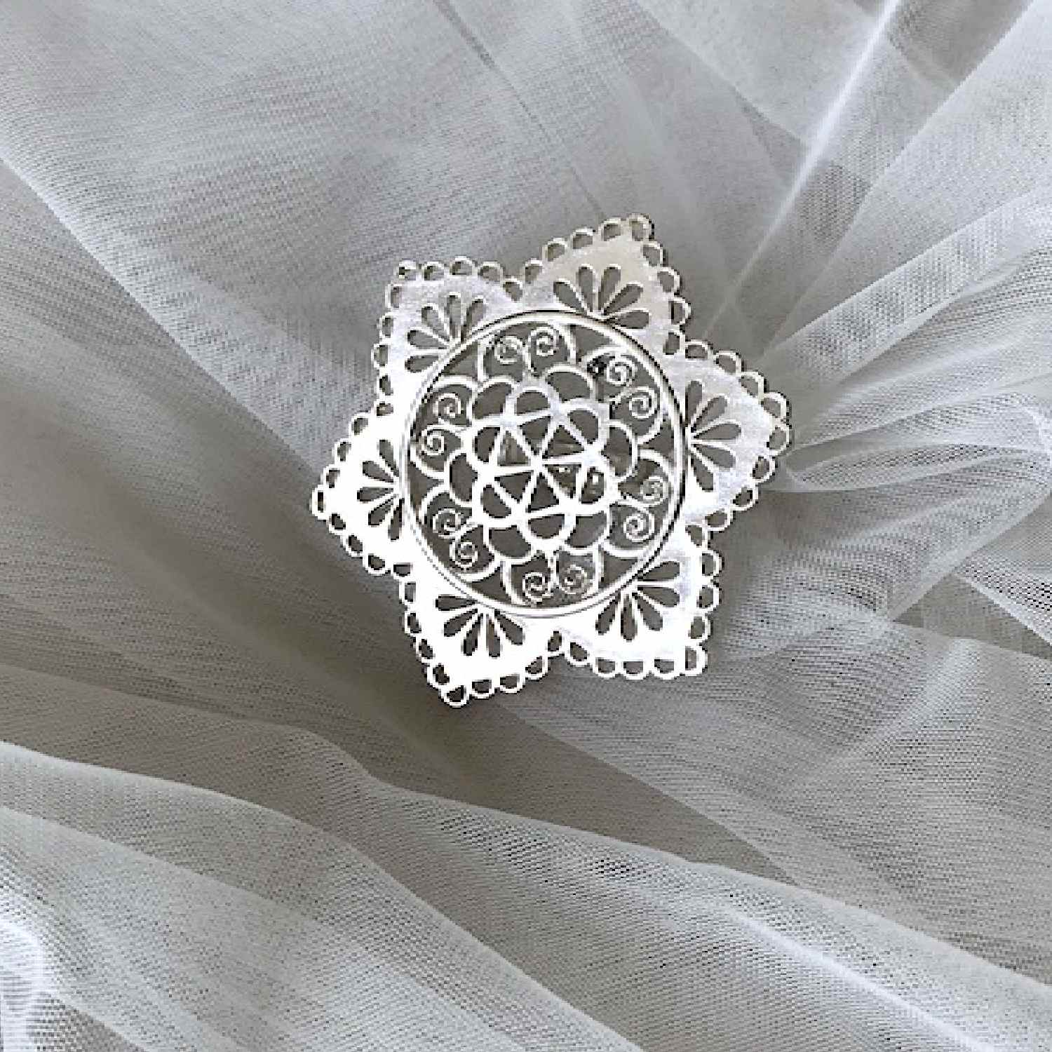 This silver ring is an elegant masterpiece, handcrafted with high-quality brass. Its timeless mashrab jaal design and intricate detailing make it a standout piece of jewellery. The ring is adjustable, allowing for a comfortable fit, and its matte silver finish adds opulence to the overall look.