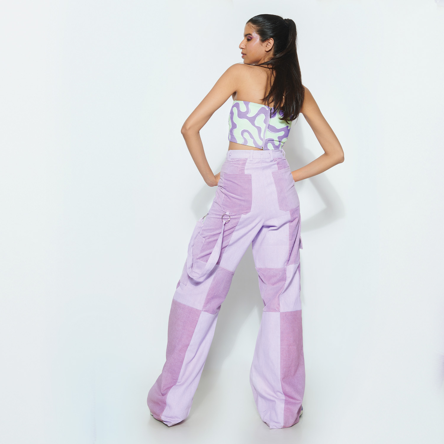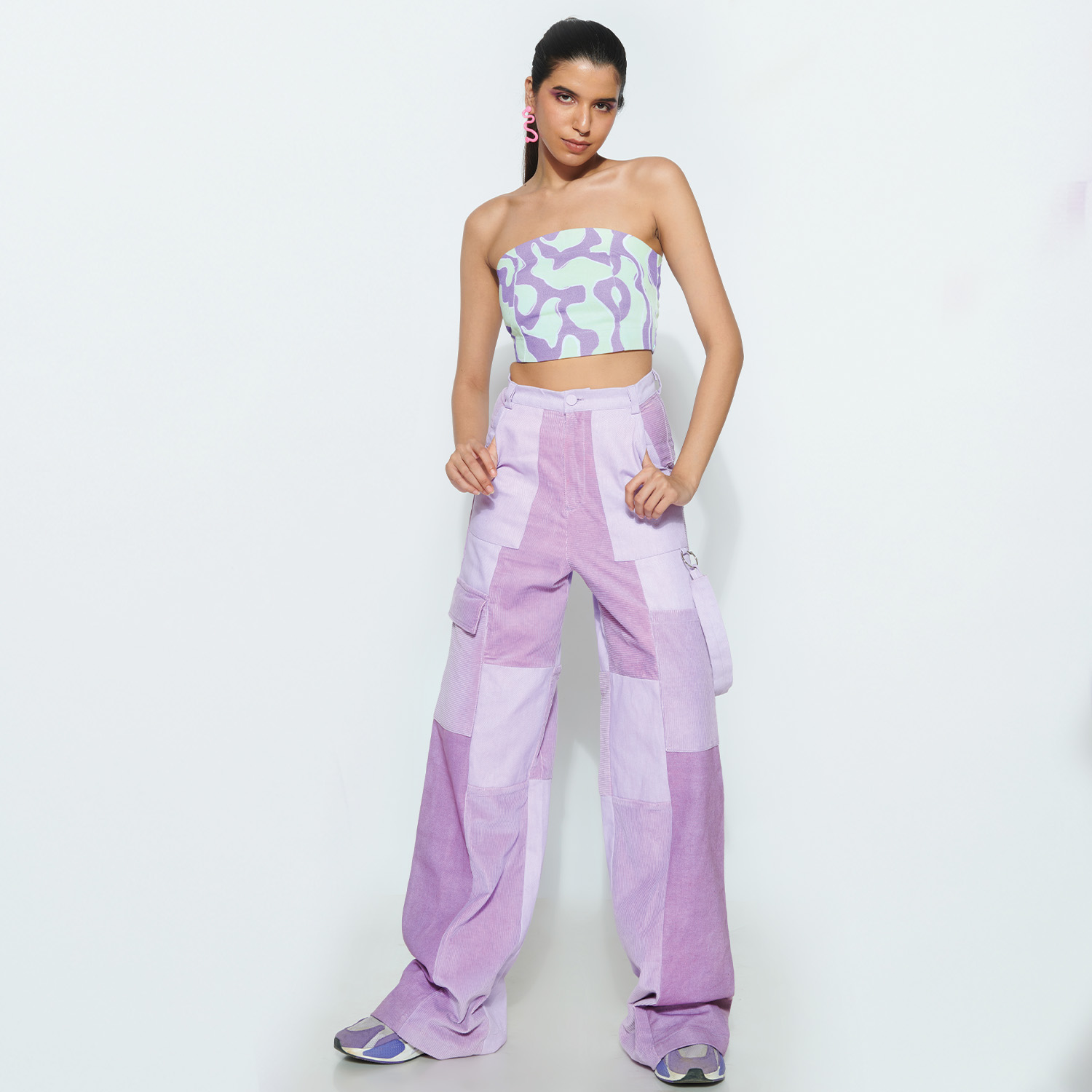 These straight pants are wide-legged and made from white denim. These relaxed-fit pants have fabric panelling, side pockets and are digitally printed in a multicolored pattern, making them stylish and versatile.