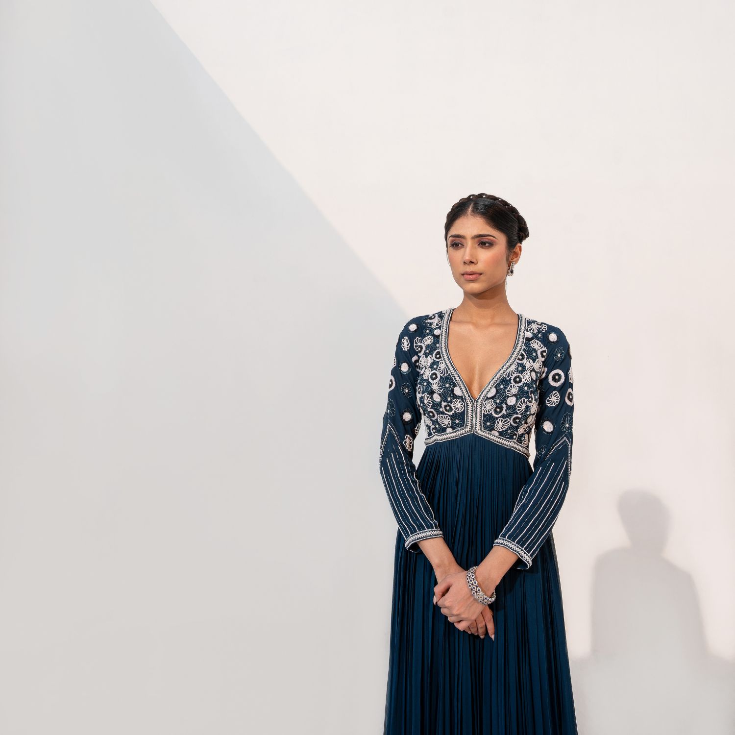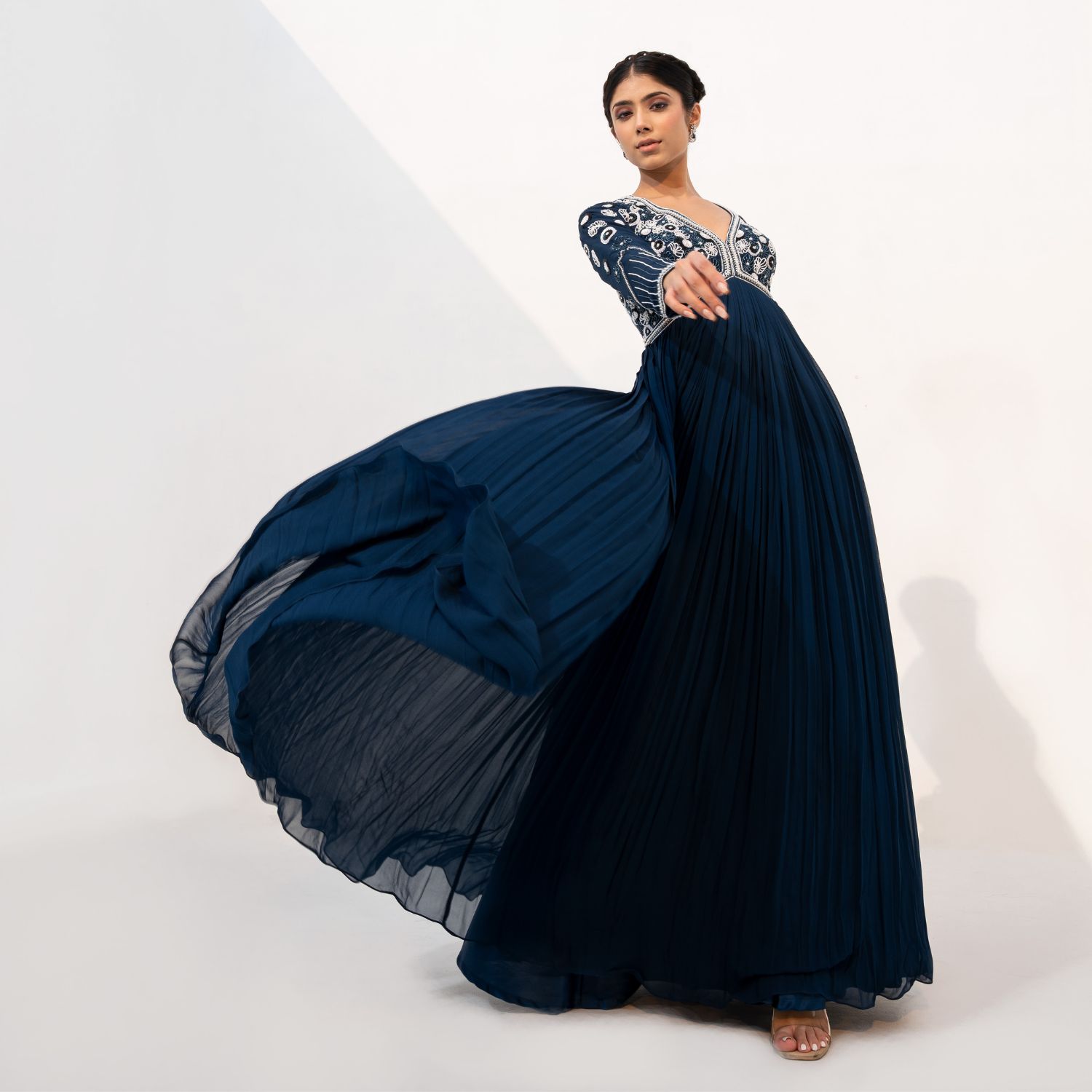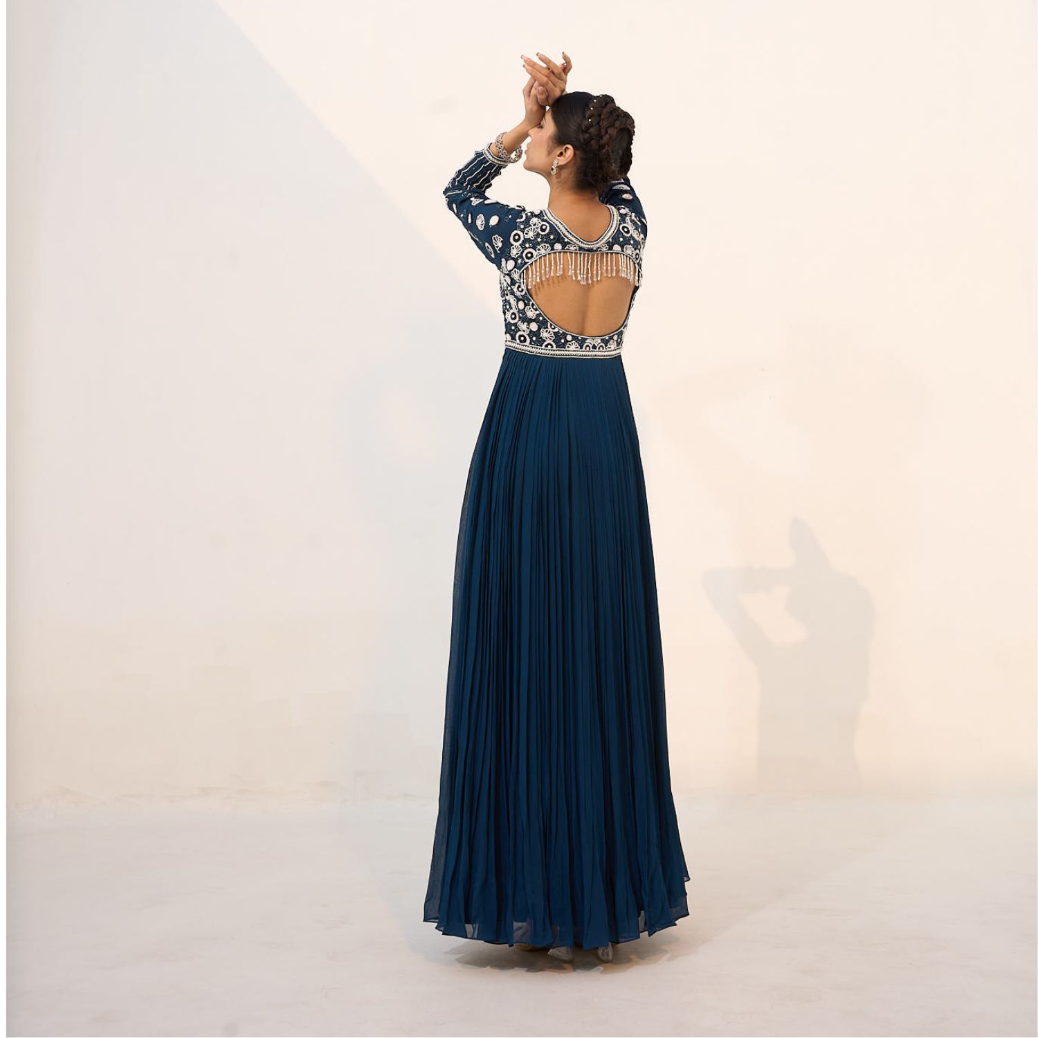 This stunning floor-length anarkali is made of fine-quality georgette fabric in a captivating shade of blue. It features delicate pearl embellishments on the bodice. The flowing silhouette and intricate detailing create a mesmerizing effect.