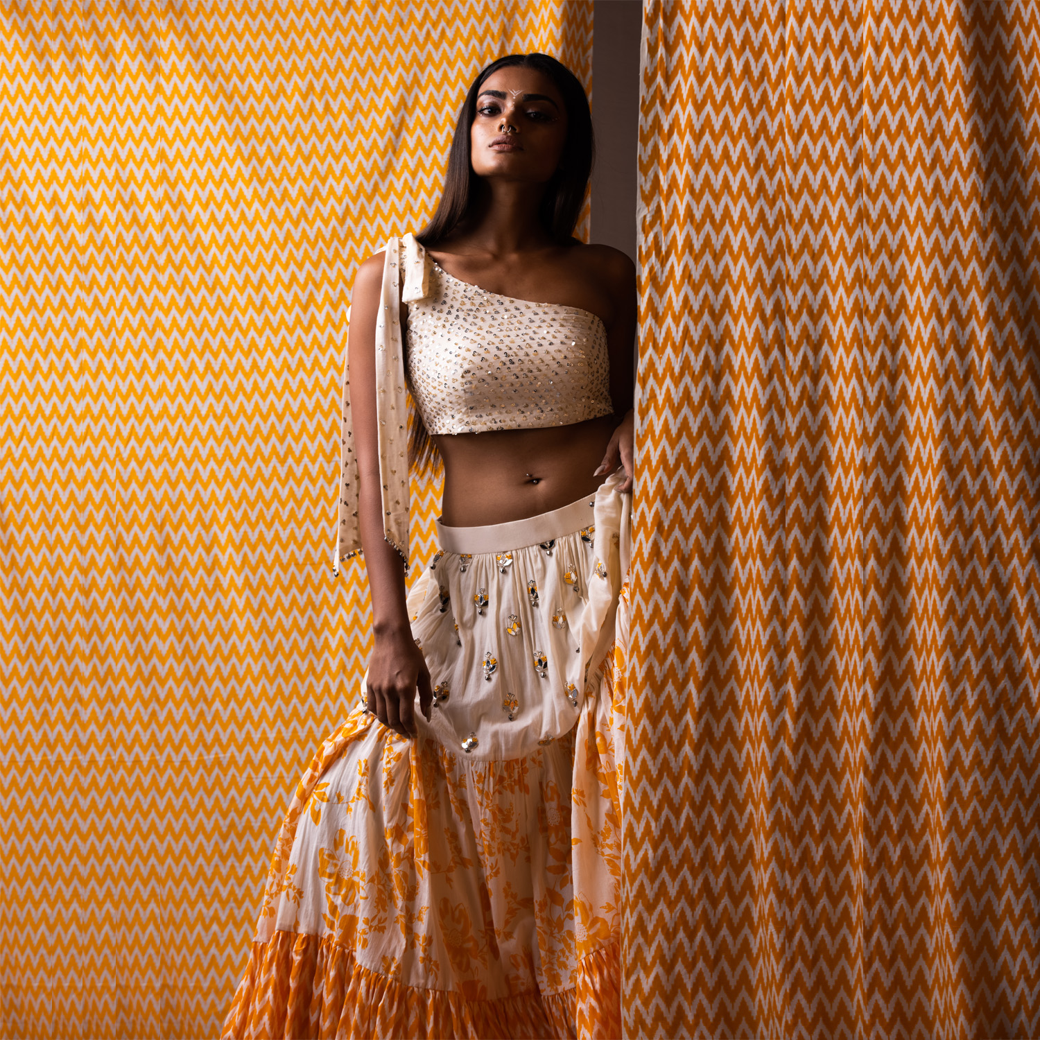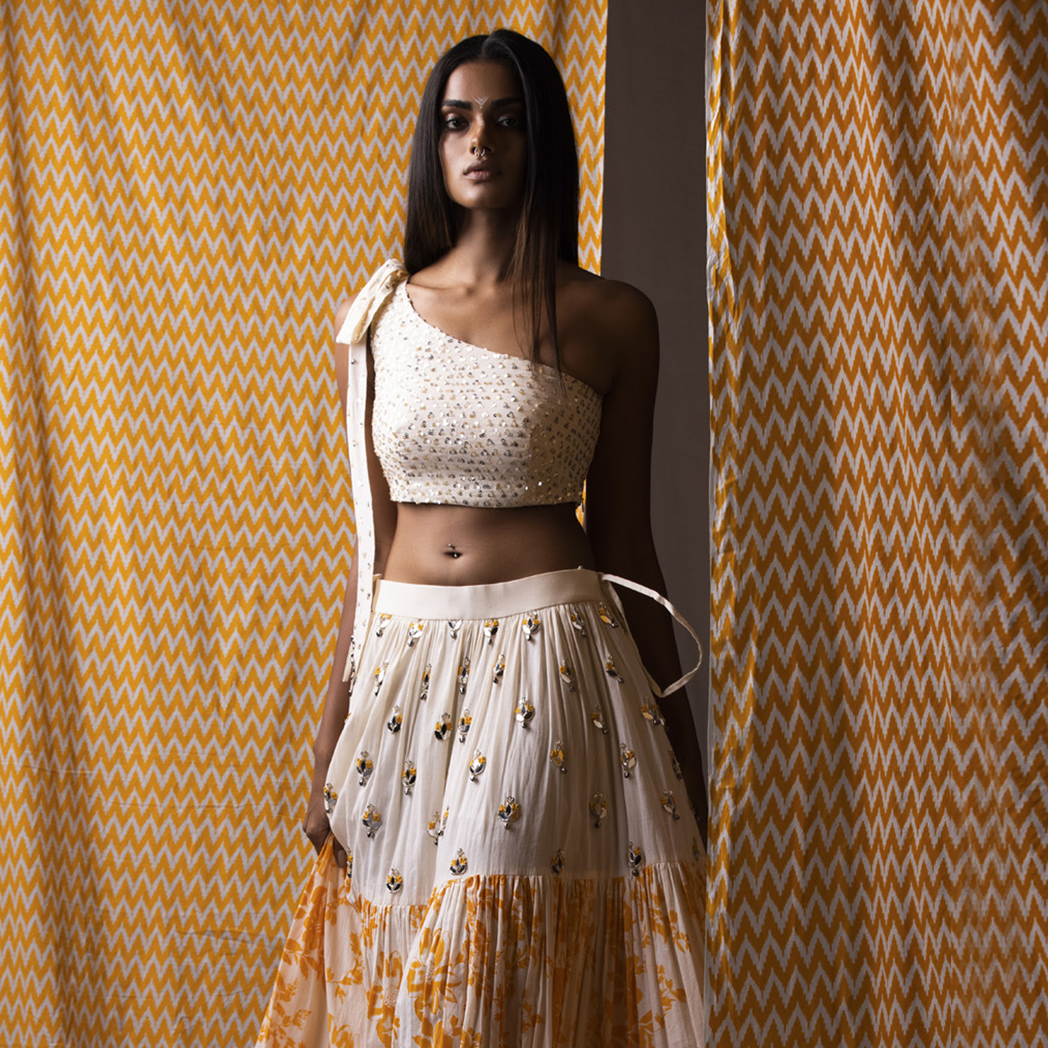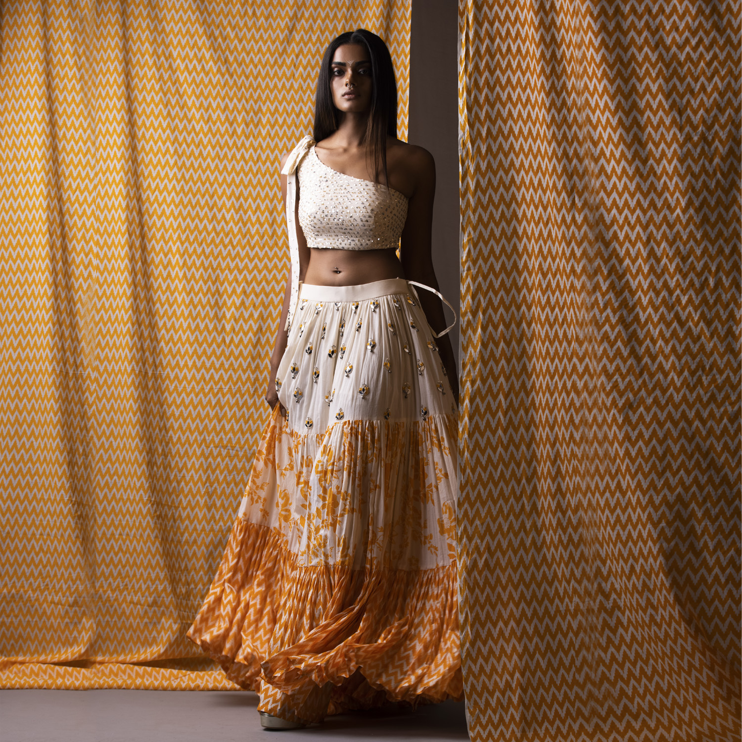 This one-shoulder bow blouse in off-white features intricate sequin embroidery. Complementing the blouse is a lehenga with three prints, creating a visually appealing and vibrant contrast. The orange hue of the lehenga adds a pop of color to the set. Style it with statement gold earrings and an embellished clutch for weddings or festivities.