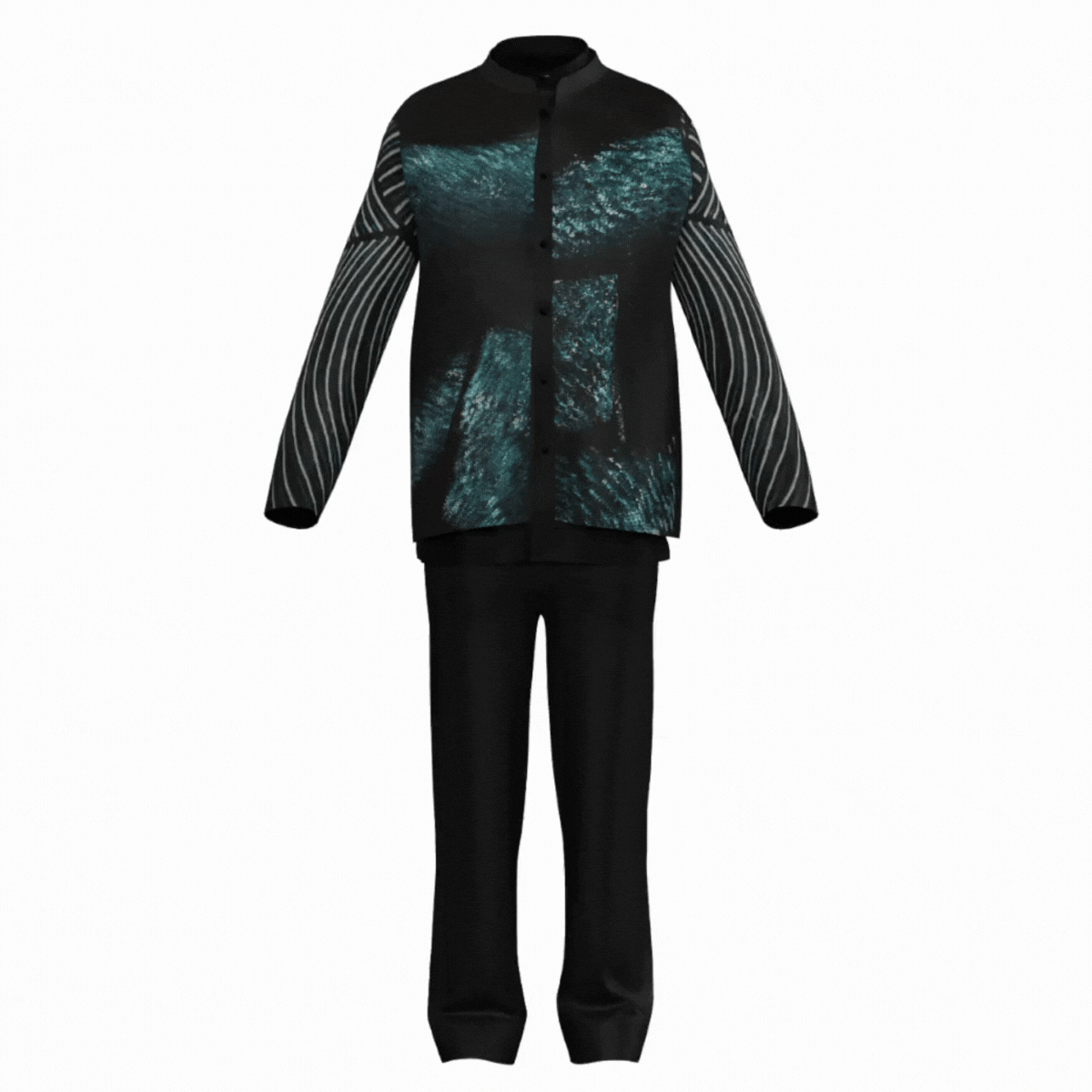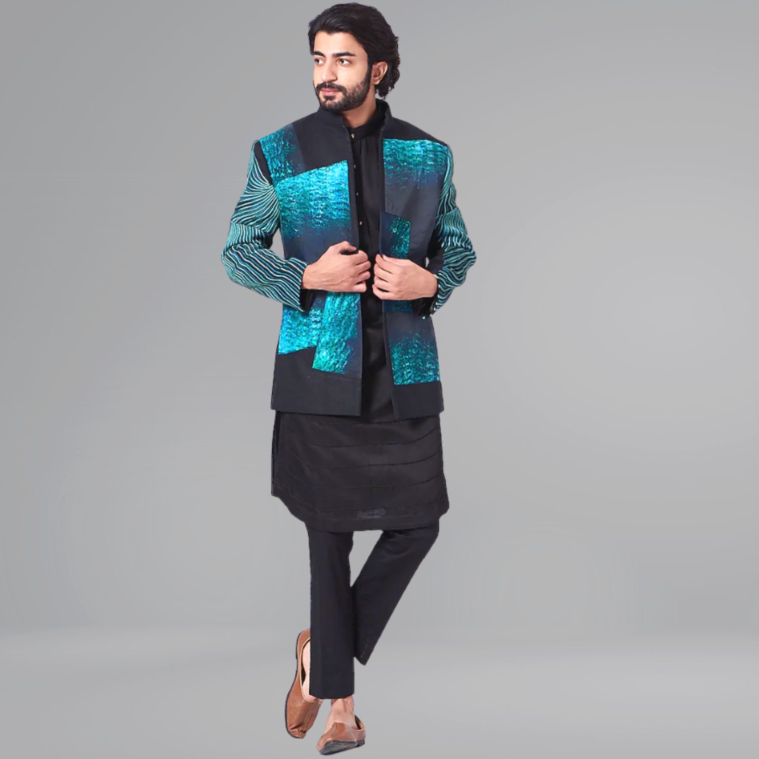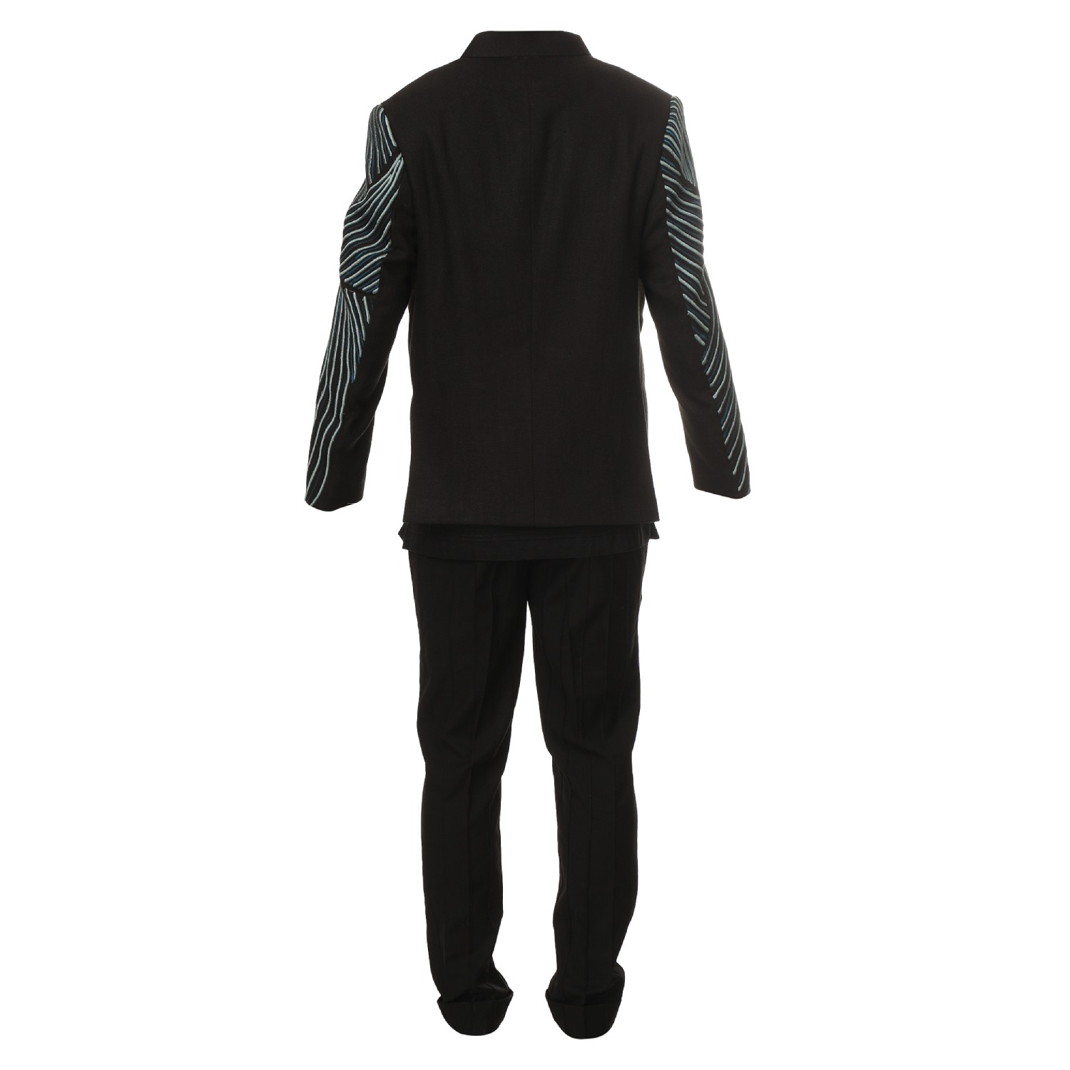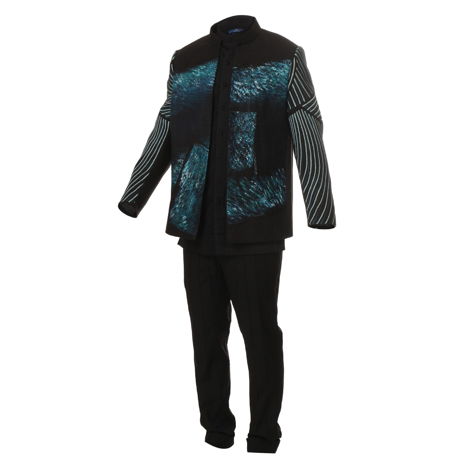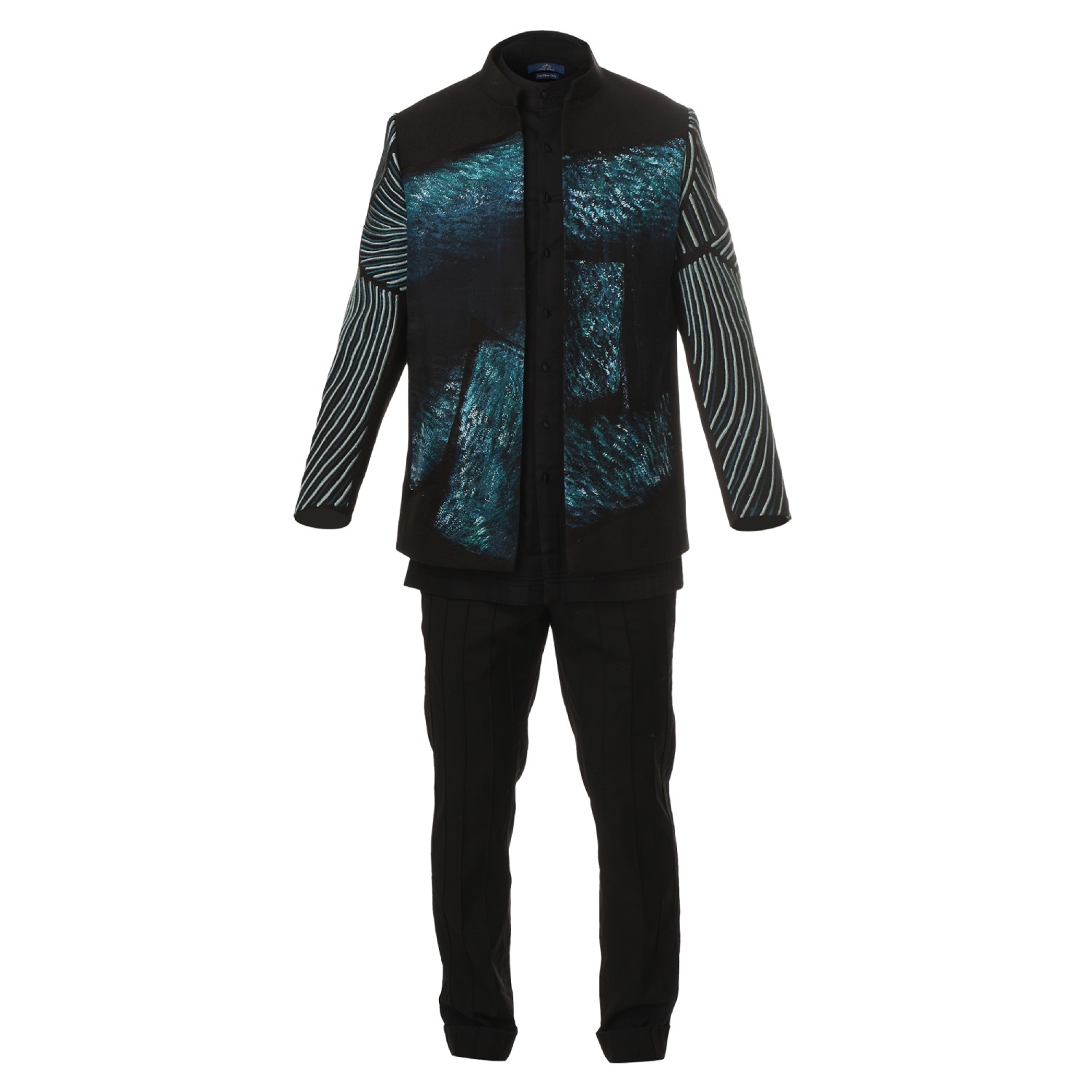 Featuring a hand painted contemporary jacket with hand embroidered sleeves. It is paired with a matching short kurta having pintuck detailing and tapered pants.