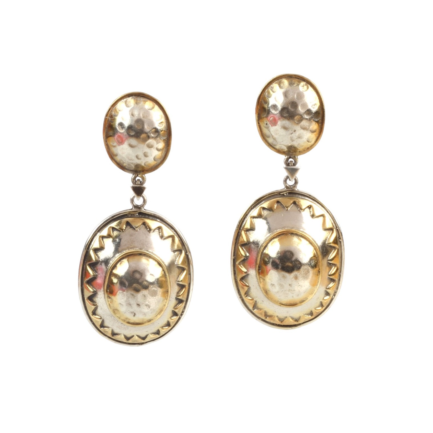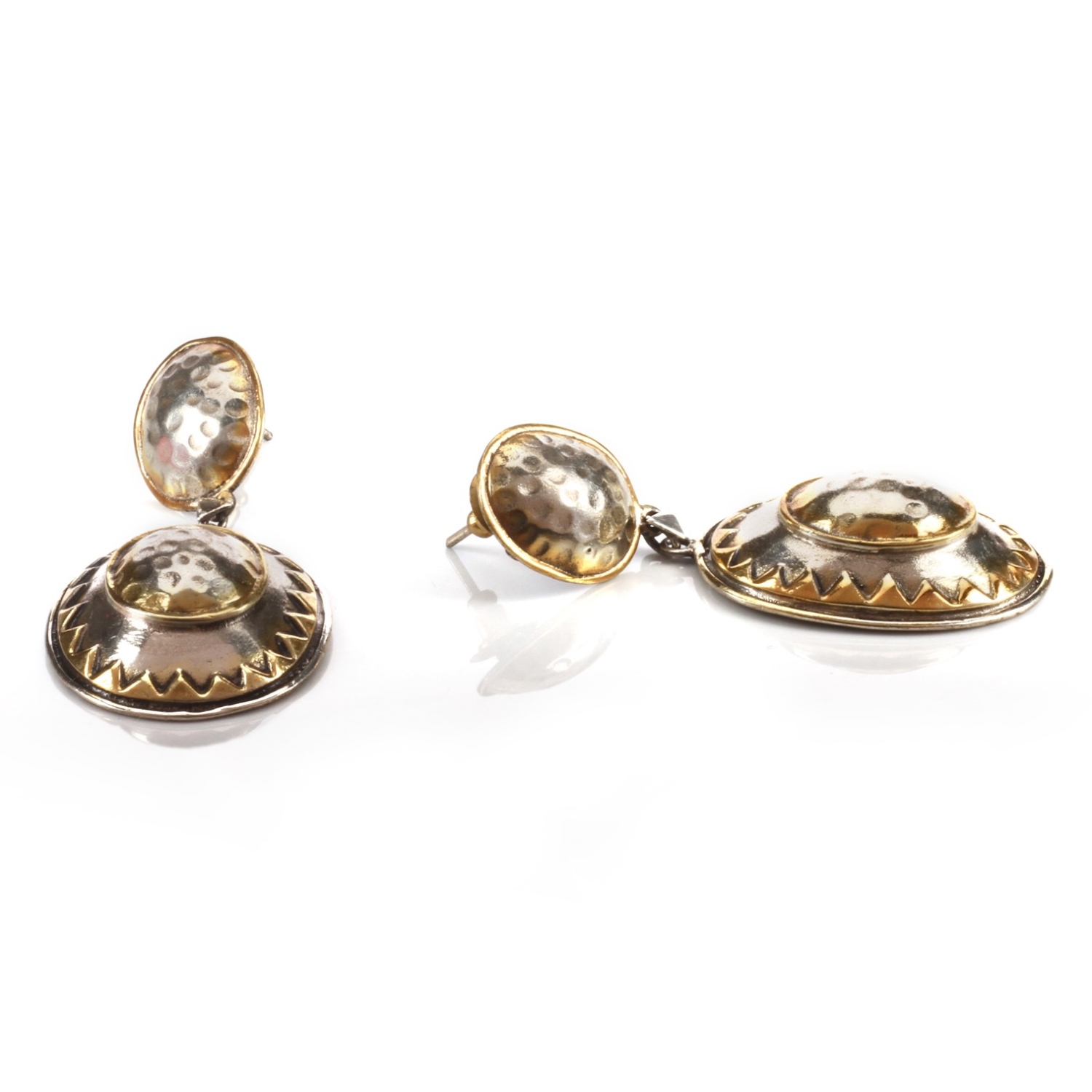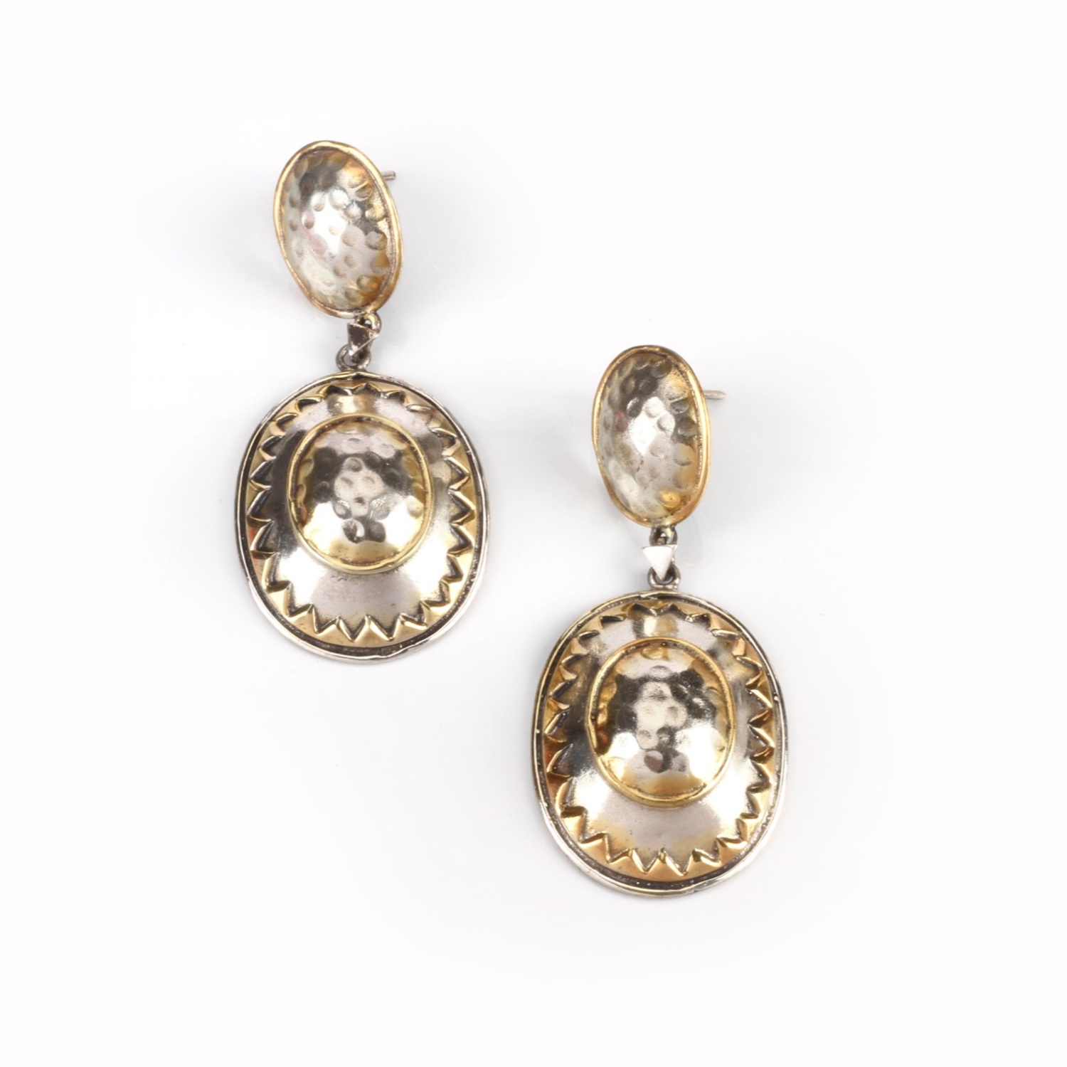 Indulge in opulence with a handcrafted silver earring adorned with lavish 24k gold plating. Meticulously designed, this accessory seamlessly marries artisanal craftsmanship with luxurious detailing. Elevate your style with the unique fusion of silver and gold, creating a statement piece that exudes sophistication and adds a touch of glamour to any ensemble.