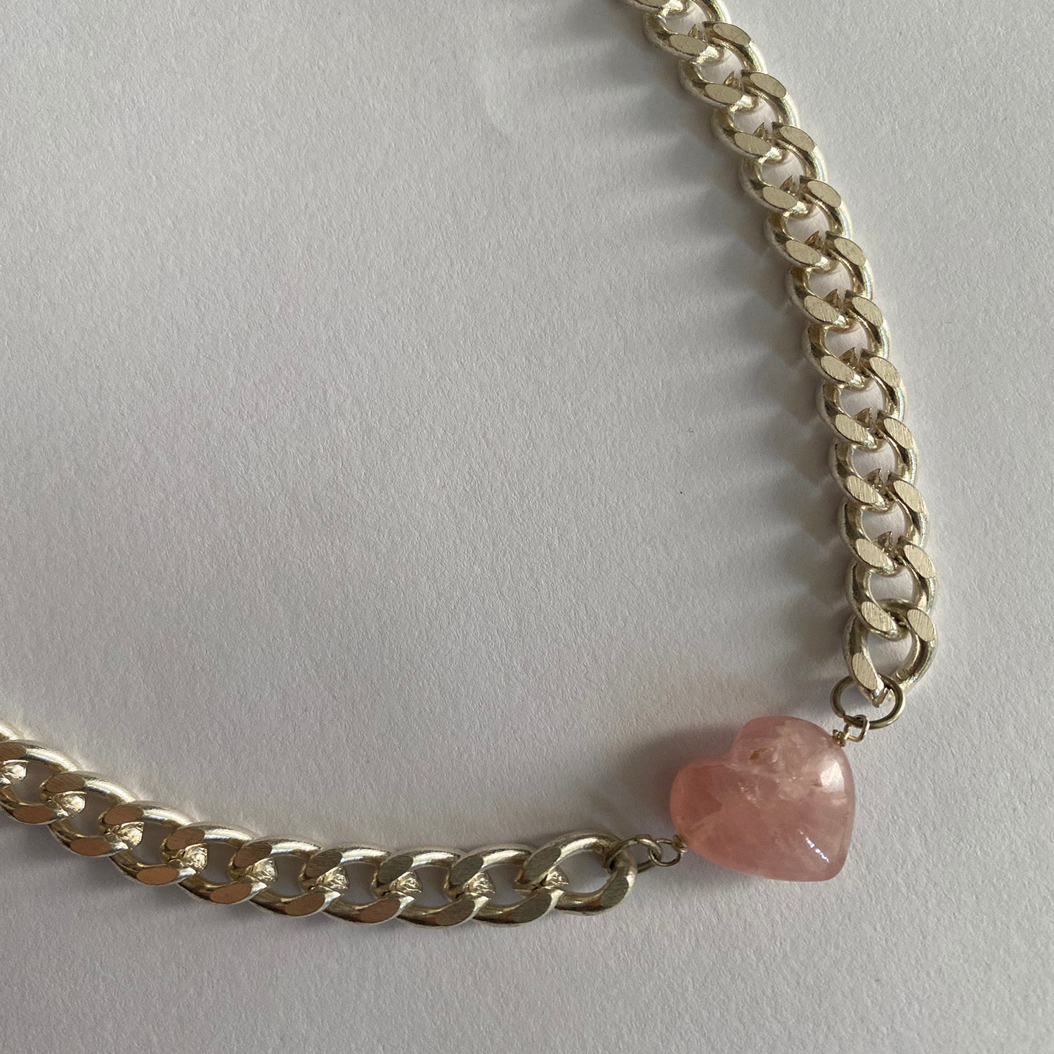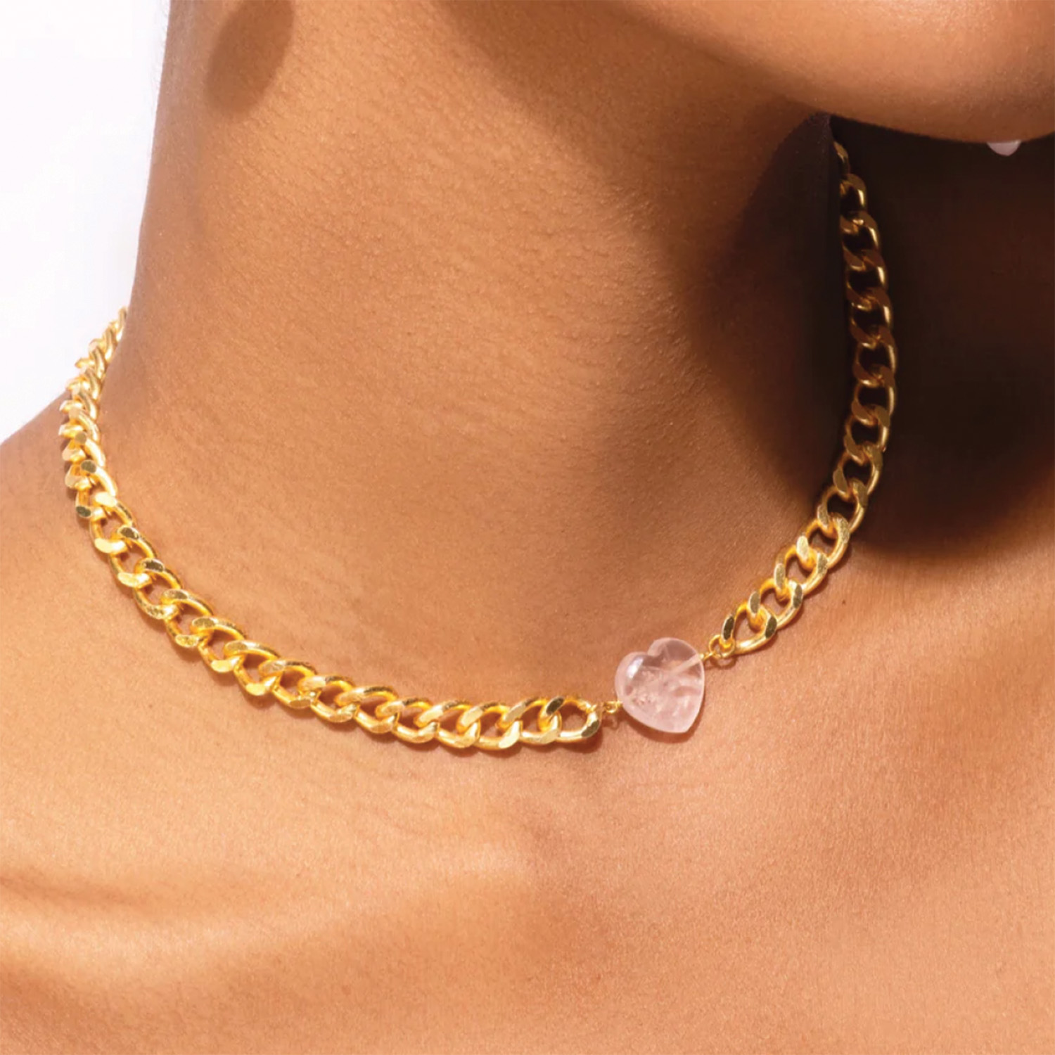 This beautiful necklace is made from a plated cuban chain with custom-cut rose quartz gemstone, making it a delicate addition to your jewellery collection. Style it with a dress and a sling bag for a dressy soiree.