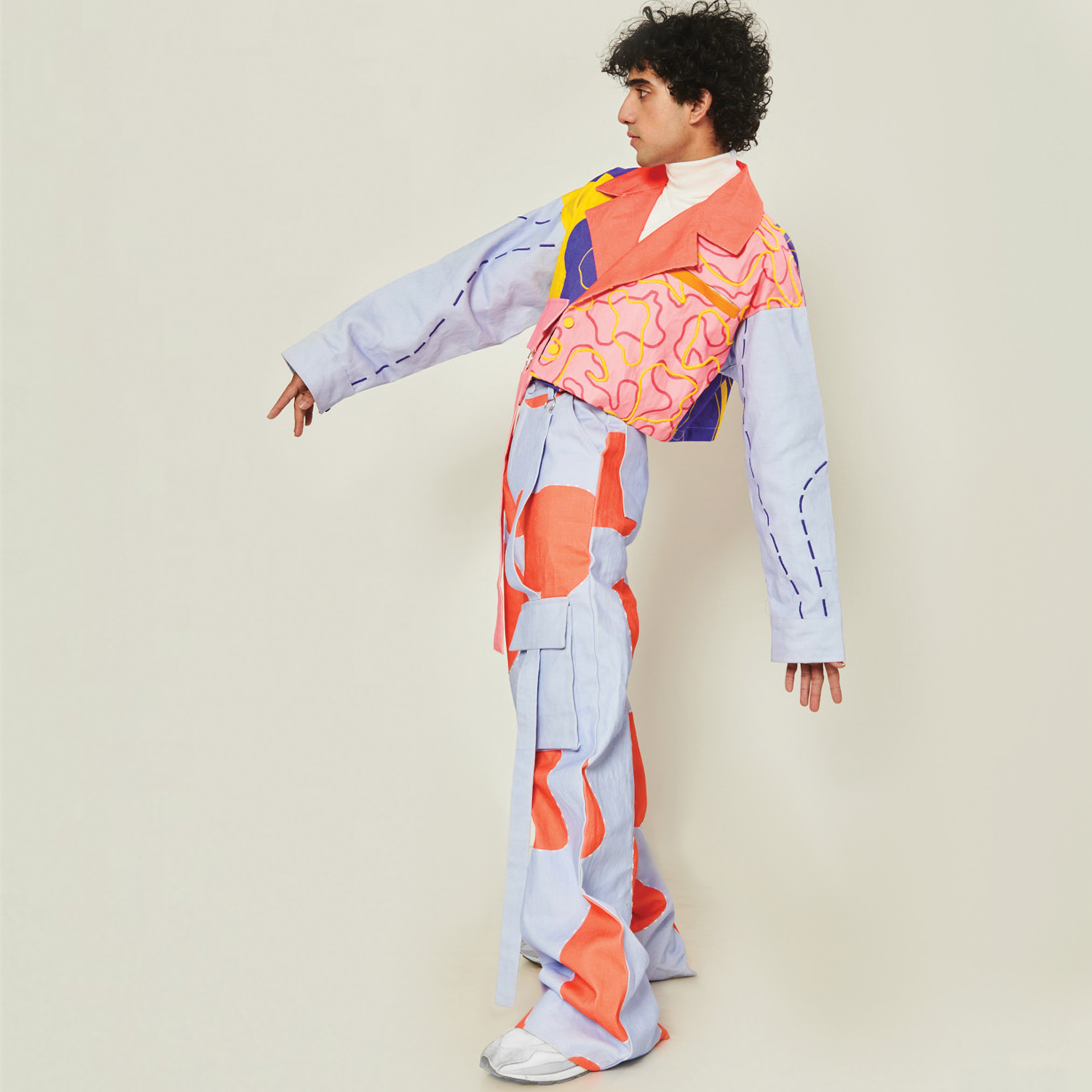 ₹ 20,999 (10% off)This stylish set features a wide-leg relaxed fit pants and a crop box fit top. The jacket has digitally printed artwork with embroidery details on white denim, creating a unique multicolor design. Style it with minimal accessories and sneakers for a fun evening event.