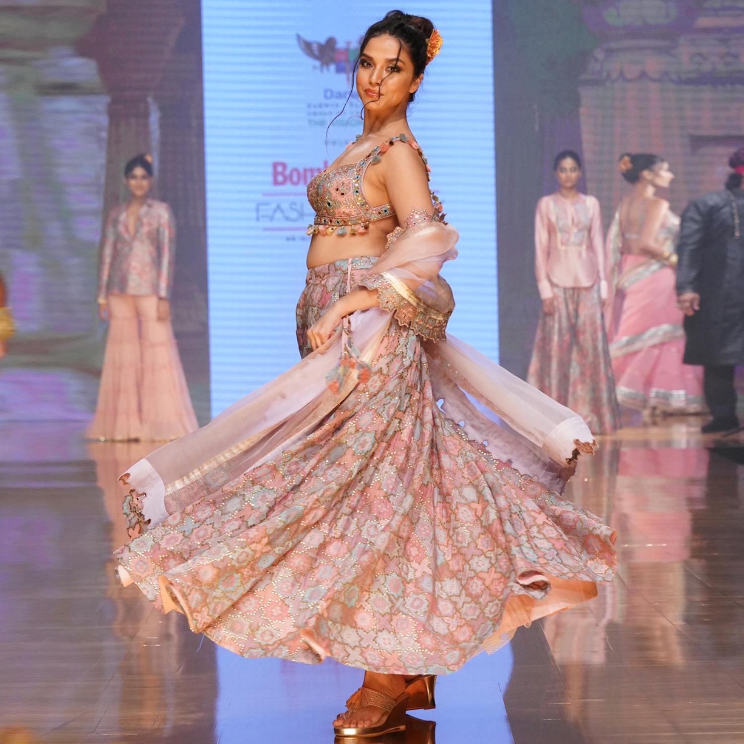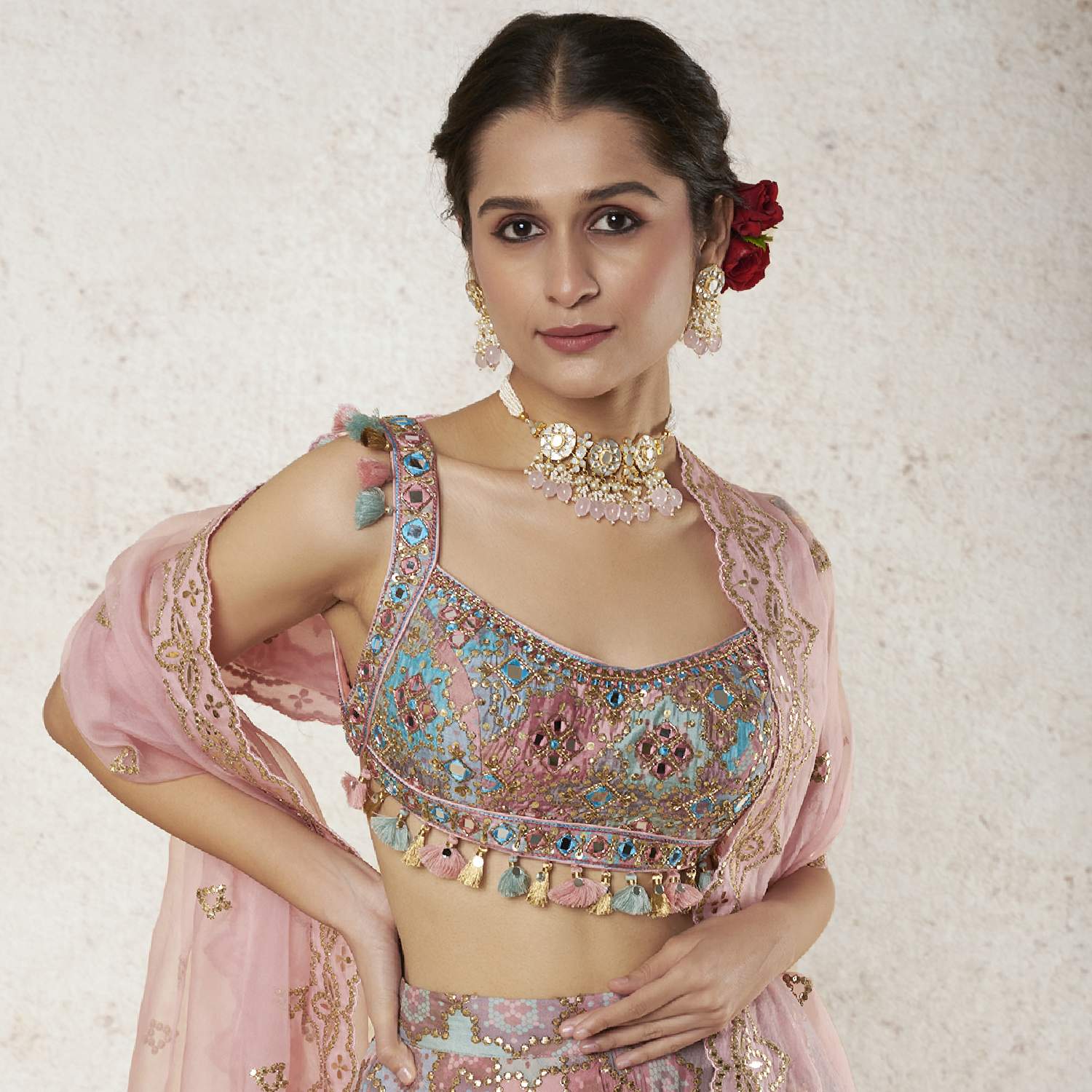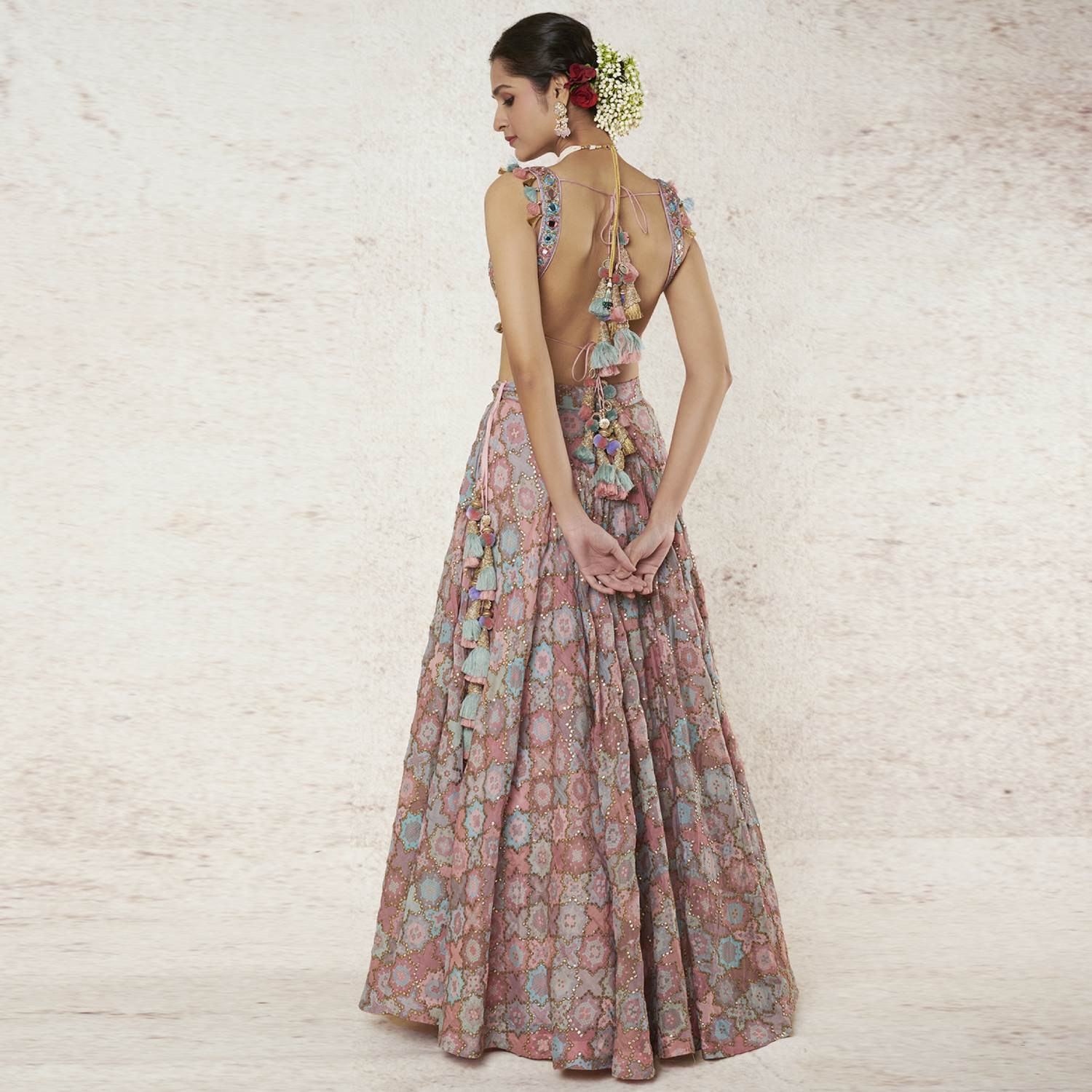 This printed lehenga set features patterns reminiscent of stone and painted tiles, intricately lifted by delicate gold embroidery to add texture and shimmer. The strappy choli is embellished with mirrors and tassels. The set is completed with a soft organza embroidered dupatta, adding elegance to the look.